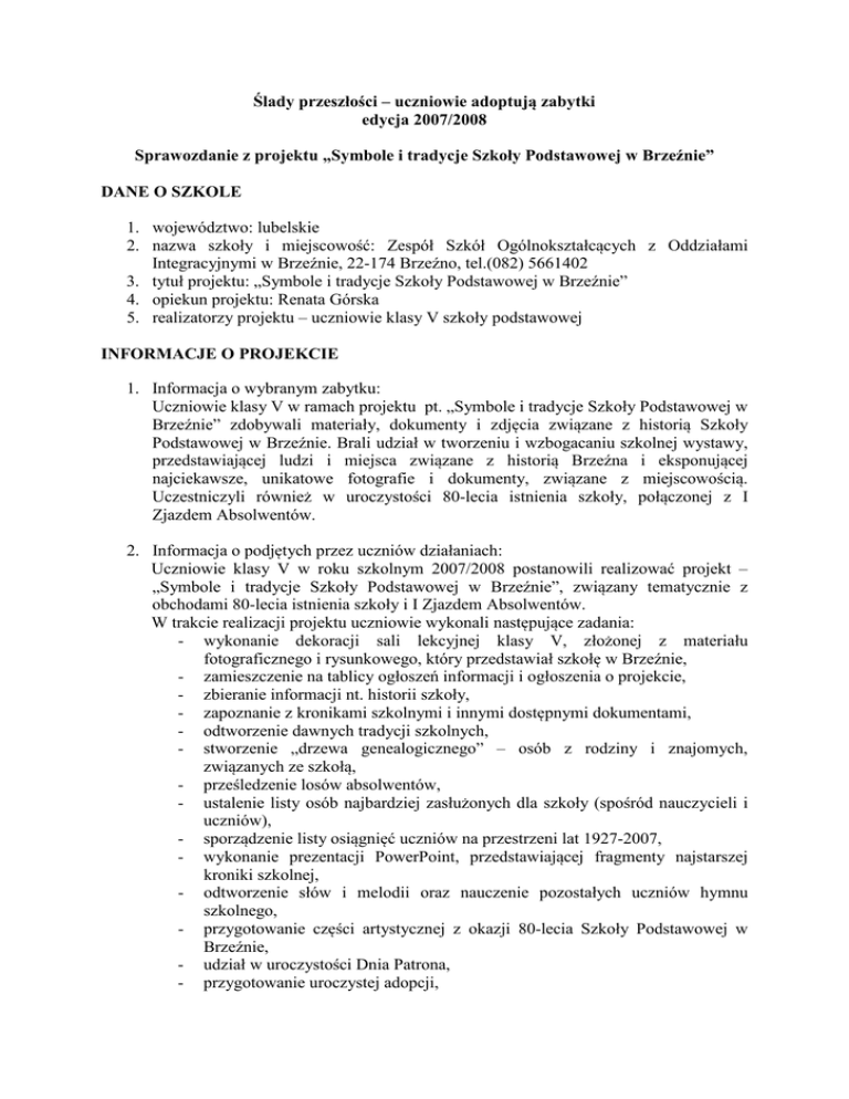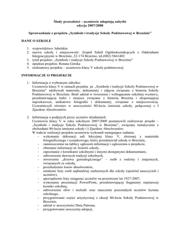 Ślady przeszłości – uczniowie adoptują zabytki edycja 2007/2008 Sprawozdanie z projektu „Symbole i tradycje Szkoły Podstawowej w Brzeźnie” DANE O SZKOLE 1. województwo: lubelskie 2. nazwa szkoły i miejscowość: Zespół Szkół Ogólnokształcących z Oddziałami Integracyjnymi w Brzeźnie, 22-174 Brzeźno, tel.(082) 5661402 3. tytuł projektu: „Symbole i tradycje Szkoły Podstawowej w Brzeźnie” 4. opiekun projektu: Renata Górska 5. realizatorzy projektu – uczniowie klasy V szkoły podstawowej INFORMACJE O PROJEKCIE 1. Informacja o wybranym zabytku: Uczniowie klasy V w ramach projektu pt. „Symbole i tradycje Szkoły Podstawowej w Brzeźnie” zdobywali materiały, dokumenty i zdjęcia związane z historią Szkoły Podstawowej w Brzeźnie. Brali udział w tworzeniu i wzbogacaniu szkolnej wystawy, przedstawiającej ludzi i miejsca związane z historią Brzeźna i eksponującej najciekawsze, unikatowe fotografie i dokumenty, związane z miejscowością. Uczestniczyli również w uroczystości 80-lecia istnienia szkoły, połączonej z I Zjazdem Absolwentów. 2. Informacja o podjętych przez uczniów działaniach: Uczniowie klasy V w roku szkolnym 2007/2008 postanowili realizować projekt – „Symbole i tradycje Szkoły Podstawowej w Brzeźnie”, związany tematycznie z obchodami 80-lecia istnienia szkoły i I Zjazdem Absolwentów. W trakcie realizacji projektu uczniowie wykonali następujące zadania: - wykonanie dekoracji sali lekcyjnej klasy V, złożonej z materiału fotograficznego i rysunkowego, który przedstawiał szkołę w Brzeźnie, - zamieszczenie na tablicy ogłoszeń informacji i ogłoszenia o projekcie, - zbieranie informacji nt. historii szkoły, - zapoznanie z kronikami szkolnymi i innymi dostępnymi dokumentami, - odtworzenie dawnych tradycji szkolnych, - stworzenie „drzewa genealogicznego” – osób z rodziny i znajomych, związanych ze szkołą, - prześledzenie losów absolwentów, - ustalenie listy osób najbardziej zasłużonych dla szkoły (spośród nauczycieli i uczniów), - sporządzenie listy osiągnięć uczniów na przestrzeni lat 1927-2007, - wykonanie prezentacji PowerPoint, przedstawiającej fragmenty najstarszej kroniki szkolnej, - odtworzenie słów i melodii oraz nauczenie pozostałych uczniów hymnu szkolnego, - przygotowanie części artystycznej z okazji 80-lecia Szkoły Podstawowej w Brzeźnie, - udział w uroczystości Dnia Patrona, - przygotowanie uroczystej adopcji, - wykonanie prac plastycznych „Moja szkoła”, - promowanie działań związanych z projektem. Uroczystość adopcji odbyła się 4 kwietnia 2008 r. w trakcie obchodów Dnia Patrona. Podczas uroczystości uczniowie otrzymali z rąk dyrektora szkoły pamiątkowy akt adopcji. Świadkami „wzięcia w opiekę historii szkoły” byli zgromadzeni goście: przedstawiciele zaprzyjaźnionych szkół, mieszkańcy Brzeźna, grono nauczycielskie oraz szkolni koledzy. Najważniejszą chwilą w trakcie realizacji projektu był dzień 5 kwietnia 2008 r., kiedy to w Zespole Szkół Ogólnokształcących z Oddziałami Integracyjnymi w Brzeźnie miała miejsce niecodzienna uroczystość – społeczność szkolna obchodziła 80-lecie istnienia szkoły połączone z I Zjazdem Absolwentów. Patronat honorowy nad imprezą objęli: Kazimierz Stocki, Starosta Chełmski i Marzena Szopińska-Demczuk, Wójt Gminy Dorohusk. Uroczystość rozpoczęła msza święta w Kościele Najświętszej Marii Panny Matki Kościoła w Brzeźnie, którą prowadził ks. proboszcz Mirosław Kuźma wraz z ks. kanonikiem Janem Karasiem, dziekanem dekanatu Chełm-Wschód, proboszczem parafii Miłosierdzia Bożego w Chełmie, ks. kanonikiem Antonim Świerkowskim, wicedziekanem, proboszczem parafii św. Jana Nepomucena w Dorohusku oraz ks. kanonikiem Janem Nietrzpielą, ojcem duchownym dekanatu. Nabożeństwo uświetniły poczty sztandarowe ze szkół z terenu gminy Dorohusk: ZSO w Dorohusku, SP w Wólce Okopskiej, SP w Świerżach i SP w Michałówce oraz poczet ZSO w Brzeźnie, złożony z najstarszych absolwentów szkoły. Piękną oprawę artystyczną mszy zapewniła parafialna schola. Kolejnym punktem rocznicowych obchodów była część oficjalna, którą rozpoczęła Dorota Bajer, dyrektor szkoły, witając zebranych gości. Okolicznościowe przemówienia wygłosili: Stanisława Dobrowolska, Dyrektor Wydziału Oświaty i Kultury Starostwa Powiatowego w Chełmie, Beata Mazurek, posłanka na Sejm RP, Marzena Szopińska – Demczuk, Wójt Gminy Dorohusk, Barbara Ostrowska Dyrektor Kuratorium Oświaty w Lublinie Delegatura w Chełmie oraz Ewa Prystupa, przedstawicielka Komitetu Organizacyjnego I Zjazdu Absolwentów. Część oficjalną spotkania zakończyło wręczenie podziękowań wszystkim zaangażowanym w organizację 80-lecia szkoły. Wśród nich nie zabrakło sponsorów: Danuty i Władysława Kowalskich z firmy Midex Tyres Group, Roberta Drzewieckiego i Stanisława Kusika z firmy TEZET GAZ, Mieczysława Seweryniuka z firmy ADRIUST, Mirosława Smagowskiego z firmy Mondi Packaging, Jadwigi i Zbigniewa Szewczuków, Iwony Szłapak i Henryka Malinowskiego. Wszyscy zasłużeni otrzymali okolicznościową publikację pod redakcją Renaty Górskiej pt. „Otwieranie świata”, przedstawiającą historię i osiągnięcia szkoły w latach 1927-2007. Kolejnym punktem uroczystości był montaż słowno – muzyczny w wykonaniu uczniów klasy V, oparty na tekstach z kroniki szkolnej i ilustrowany piosenkami z lat 50. i 60. XX wieku. Całość dopełniała dekoracja, wykonana przez gimnazjalistów, utrzymana w konwencji akademii z tamtych lat. Następnym punktem obchodów były przemówienia i refleksje osób najdłużej związanych ze szkołą. Na wstępie został odczytany list Franciszka Świstowskiego, dyrektora Technikum Mechanicznego w Chełmie, częstego gościa szkoły w Brzeźnie. Głos zabrał także Stanisław Uszczuk, dyrektor szkoły w Brzeźnie w latach 1965-1991 oraz Zofia Weresińska, 
