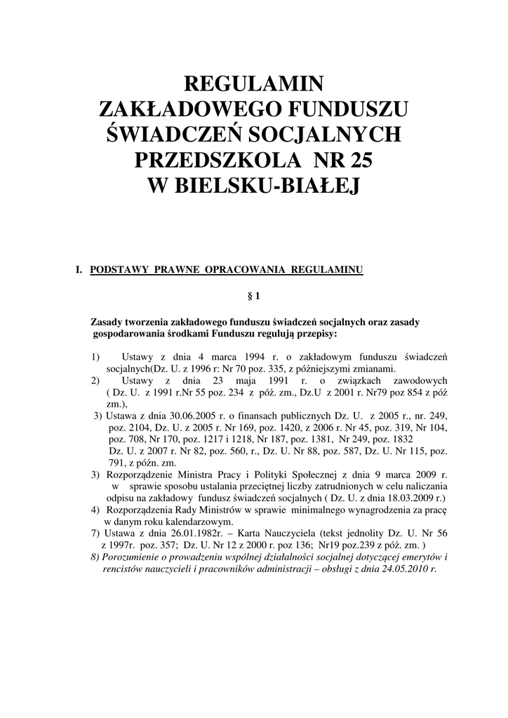 REGULAMIN ZAKŁADOWEGO FUNDUSZU ŚWIADCZEŃ SOCJALNYCH PRZEDSZKOLA NR 25 W BIELSKU-BIAŁEJ I. PODSTAWY PRAWNE OPRACOWANIA REGULAMINU §1 Zasady tworzenia zakładowego funduszu świadczeń socjalnych oraz zasady gospodarowania środkami Funduszu regulują przepisy: 1) Ustawy z dnia 4 marca 1994 r. o zakładowym funduszu świadczeń socjalnych(Dz. U. z 1996 r: Nr 70 poz. 335, z późniejszymi zmianami. 2) Ustawy z dnia 23 maja 1991 r. o związkach zawodowych ( Dz. U. z 1991 r.Nr 55 poz. 234 z póź. zm., Dz.U z 2001 r. Nr79 poz 854 z póź zm.), 3) Ustawa z dnia 30.06.2005 r. o finansach publicznych Dz. U. z 2005 r., nr. 249, poz. 2104, Dz. U. z 2005 r. Nr 169, poz. 1420, z 2006 r. Nr 45, poz. 319, Nr 104, poz. 708, Nr 170, poz. 1217 i 1218, Nr 187, poz. 1381, Nr 249, poz. 1832 Dz. U. z 2007 r. Nr 82, poz. 560, r., Dz. U. Nr 88, poz. 587, Dz. U. Nr 115, poz. 791, z późn. zm. 3) Rozporządzenie Ministra Pracy i Polityki Społecznej z dnia 9 marca 2009 r. w sprawie sposobu ustalania przeciętnej liczby zatrudnionych w celu naliczania odpisu na zakładowy fundusz świadczeń socjalnych ( Dz. U. z dnia 18.03.2009 r.) 4) Rozporządzenia Rady Ministrów w sprawie minimalnego wynagrodzenia za pracę w danym roku kalendarzowym. 7) Ustawa z dnia 26.01.1982r. – Karta Nauczyciela (tekst jednolity Dz. U. Nr 56 z 1997r. poz. 357; Dz. U. Nr 12 z 2000 r. poz 136; Nr19 poz.239 z póź. zm. ) 8) Porozumienie o prowadzeniu wspólnej działalności socjalnej dotyczącej emerytów i rencistów nauczycieli i pracowników administracji – obsługi z dnia 24.05.2010 r. II POSTANOWIENIA OGÓLNE §2 1. W przedszkolu tworzy się Zakładowy Fundusz Świadczeń Socjalnych, (zwany dalej Funduszem) którego zasady działania określa Regulamin, opracowany w uzgodnieniu z organizacjami związkowymi działającymi na terenie placówki. 2. Źródło finansowania Funduszu tworzy odpis podstawowy na ZFŚS, który pracodawca nalicza obowiązkowo w sposób określony obowiązującymi przepisami. 3. Spośród środków Funduszu Świadczeń Socjalnych na dany rok kalendarzowy wyodrębnia się środki przeznaczone na fundusz mieszkaniowy scentralizowany. §3 1. Podstawę podziału Funduszu na poszczególne cele i rodzaje działalności socjalnej stanowi roczny plan rzeczowo - finansowy, a podstawę i zasady gospodarowania środkami Funduszu stanowią poniższe postanowienia i pozostałe załączniki będące częścią składową regulaminu placówki. 2. Roczny plan rzeczowo - finansowy opracowuje pracodawca. 3. Decyzje, w sprawie przyznania osobie świadczenia socjalnego finansowanego z Funduszu, podejmuje pracodawca w uzgodnieniu z przedstawicielem związków zawodowych działających na terenie placówki. 4. Pracodawca powołuje na czas podziału środków zespół składający się z przedstawicieli pracowników i związków zawodowych działających na terenie Przedszkola. §4 1. Środki Funduszu są gromadzone na odrębnym rachunku bankowym. 2. Środki Funduszu nie wykorzystane w danym roku kalendarzowym przechodzą na kolejny rok. §5 1. Za błędne decyzje dotyczące administrowania Funduszem wszelką odpowiedzialność ponosi pracodawca. §6 1. O świadczenia socjalne finansowane z Funduszu mogą ubiegać się osoby uprawnione, których dochód na osobę w rodzinie jest zgodny ze złożonym oświadczeniem. 2. Podstawą otrzymania świadczenia jest złożenie przez pracownika oświadczenia o średnim dochodzie brutto na członka rodziny w gospodarstwie domowym, obowiązującym w miesiącu poprzedzającym datę złożenia wniosku o przyznanie tej pomocy. §7 1. Podstawą przyznania osobie uprawnionej świadczenia finansowego z Funduszu jest pisemny wniosek napisany w ustalonym w regulaminie terminie, wypełniony według wzoru (stanowiącego załącznik nr 2 do regulaminu) i zawierający oświadczenie o jego sytuacji życiowej, rodzinnej i materialnej. 2. W przypadku zapomóg losowych pracownik składa wniosek w dowolnym terminie. (załącznik nr 3) 3. Dopłata do poszczególnych form wypoczynku może być przyznana tylko jeden raz w roku. 4. Częstotliwość dopłat do świadczeń finansowych z Funduszu określają dalsze postanowienia regulaminu. 5. Priorytety w przyznawaniu świadczeń oraz wysokość dopłaty z Funduszu uzależnia się od sytuacji życiowej, rodzinnej i materialnej osoby uprawnionej. §8 1.W przypadkach uzasadnionych względami społecznymi, pomoc przyznana z Funduszu może być – na pisemny wniosek – doręczona małżonkowi pracownika lub innemu dorosłemu członkowi jego rodziny. §9 1. Dochodem, przyjmowanym do ustalenia sytuacji materialnej osoby uprawnionej ubiegającej się o świadczenia finansowane z Funduszu, są wszelkie dochody pochodzące ze wszystkich źródeł, uzyskiwane przez osoby spokrewnione i nie spokrewnione wspólnie gospodarujące i zamieszkujące. III. OSOBY UPRAWNIONE DO ULGOWYCH USŁUG I ŚWIADCZEŃ § 10 1. Osobami uprawnionymi do ubiegania się o świadczenia dofinansowane z Funduszu są: 1) pracownicy zatrudnieni w pełnym i niepełnym wymiarze czasu pracy, zatrudnieni na czas nieokreślony i określony, na podstawie umowy o pracę, od pierwszego do ostatniego dnia pracy na placówce, 2) pracownicy przebywający na urlopach wychowawczych i zdrowotnych oraz w stanie nieczynnym 3) członkowie rodzin pracowników wspólnie zamieszkujący i gospodarujący z osobą uprawnioną do korzystania z Funduszu i będących na utrzymaniu pracownika. 2. Członkami rodziny osoby uprawnionej do korzystania z Funduszu są: 1) pozostające na utrzymaniu i wychowaniu osoby uprawnionej dzieci do lat 18 – tu, a jeżeli kształcą się w szkołach – do czasu ukończenia nauki nie dłużej niż do 25 lat. 2) osoby wymienione w pkt.1 niezdolne do żadnej pracy na wskutek niepełnosprawności – bez względu na wiek. IV. PRZEZNACZENIE FUNDUSZU § 11 1. Świadczenie urlopowe dla nauczycieli jest wypłacane zgodnie z art. 53 ust. 1a – Ustawy – Karta Nauczyciela 2.Środki zakładowego
