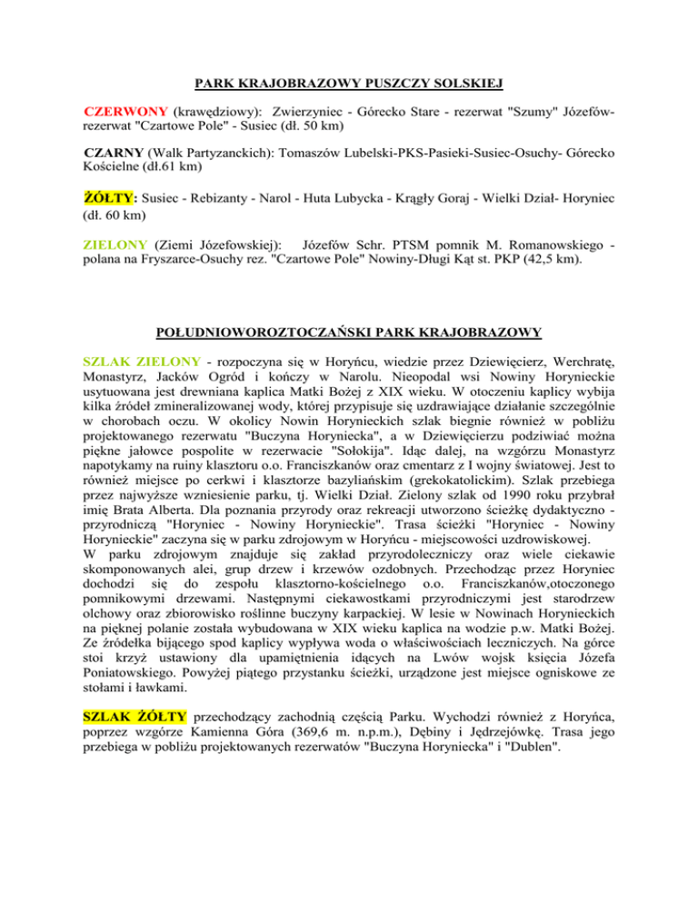 PARK KRAJOBRAZOWY PUSZCZY SOLSKIEJ CZERWONY (krawędziowy): Zwierzyniec - Górecko Stare - rezerwat "Szumy" Józefówrezerwat "Czartowe Pole" - Susiec (dł. 50 km) CZARNY (Walk Partyzanckich): Tomaszów Lubelski-PKS-Pasieki-Susiec-Osuchy- Górecko Kościelne (dł.61 km) śÓŁTY: Susiec - Rebizanty - Narol - Huta Lubycka - Krągły Goraj - Wielki Dział- Horyniec (dł. 60 km) ZIELONY (Ziemi Józefowskiej): Józefów Schr. PTSM pomnik M. Romanowskiego polana na Fryszarce-Osuchy rez. "Czartowe Pole" Nowiny-Długi Kąt st. PKP (42,5 km). POŁUDNIOWOROZTOCZAŃSKI PARK KRAJOBRAZOWY SZLAK ZIELONY - rozpoczyna się w Horyńcu, wiedzie przez Dziewięcierz, Werchratę, Monastyrz, Jacków Ogród i kończy w Narolu. Nieopodal wsi Nowiny Horynieckie usytuowana jest drewniana kaplica Matki BoŜej z XIX wieku. W otoczeniu kaplicy wybija kilka źródeł zmineralizowanej wody, której przypisuje się uzdrawiające działanie szczególnie w chorobach oczu. W okolicy Nowin Horynieckich szlak biegnie równieŜ w pobliŜu projektowanego rezerwatu "Buczyna Horyniecka", a w Dziewięcierzu podziwiać moŜna piękne jałowce pospolite w rezerwacie "Sołokija". Idąc dalej, na wzgórzu Monastyrz napotykamy na ruiny klasztoru o.o. Franciszkanów oraz cmentarz z I wojny światowej. Jest to równieŜ miejsce po cerkwi i klasztorze bazyliańskim (grekokatolickim). Szlak przebiega przez najwyŜsze wzniesienie parku, tj. Wielki Dział. Zielony szlak od 1990 roku przybrał imię Brata Alberta. Dla poznania przyrody oraz rekreacji utworzono ścieŜkę dydaktyczno przyrodniczą "Horyniec - Nowiny Horynieckie". Trasa ścieŜki "Horyniec - Nowiny Horynieckie" zaczyna się w parku zdrojowym w Horyńcu - miejscowości uzdrowiskowej. W parku zdrojowym znajduje się zakład przyrodoleczniczy oraz wiele ciekawie skomponowanych alei, grup drzew i krzewów ozdobnych. Przechodząc przez Horyniec dochodzi się do zespołu klasztorno-kościelnego o.o. Franciszkanów,otoczonego pomnikowymi drzewami. Następnymi ciekawostkami przyrodniczymi jest starodrzew olchowy oraz zbiorowisko roślinne buczyny karpackiej. W lesie w Nowinach Horynieckich na pięknej polanie została wybudowana w XIX wieku kaplica na wodzie p.w. Matki BoŜej. Ze źródełka bijącego spod kaplicy wypływa woda o właściwościach leczniczych. Na górce stoi krzyŜ ustawiony dla upamiętnienia idących na Lwów wojsk księcia Józefa Poniatowskiego. PowyŜej piątego przystanku ścieŜki, urządzone jest miejsce ogniskowe ze stołami i ławkami. SZLAK śÓŁTY przechodzący zachodnią częścią Parku. Wychodzi równieŜ z Horyńca, poprzez wzgórze Kamienna Góra (369,6 m. n.p.m.), Dębiny i Jędrzejówkę. Trasa jego przebiega w pobliŜu projektowanych rezerwatów "Buczyna Horyniecka" i "Dublen". PARK KRAJOBRAZOWY POGÓRZA PRZEMYSKIEGO SZLAK CZERWONY - swój początek bierze w Przemyślu i prowadzi przez najwyŜsze wzniesienia Parku (Wapielnica - 393 m npm, Kopystańka - 541 m npm, wspaniały punkt widokowy). Na terenie Parku długość jego wynosi 39 km. SZLAK NIEBIESKI - jest najdłuŜszym szlakiem w Parku. Charakterystyczną cechą tej trasy jest jej przebieg na znacznej długości przez tereny leśne. Na niewielkim odcinku prowadzi brzegiem Sanu. Na teren Parku wchodzi w Dynowie, biegnąc w kierunku wschodnim, by następnie na wzniesieniu Wapielnica, skręcić na południe w kierunku Kalwarii Pacławskiej. Z Kalwarii szlak skręca do wsi Pacław, schodzi na trawiaste wzgórza do wsi Paportno, by zgłębić się w ścieŜkę na wierzchołek Suchego Obycza. Następnie kierując się na południowy zachód wchodzi na teren Parku Krajobrazowego Gór Słonych kończąc bieg w Ustrzykach Dolnych. PĄTNICZY SZLAK IM. JANA PAWŁA II - utworzony w 1991r. Liczy 22 km. Rozpoczyna się w Przemyślu i na odcinku 5 km biegnie trasą szlaku czerwonego, następnie niebieskiego, aŜ do miejscowości Kalwaria Pacławska. PołoŜenie wsi na szczycie wzniesienia (465 m. n.p.m.) jest wspaniałym miejscem widokowym, z którego moŜna podziwiać malowniczą dolinę Wiaru oraz masyw Turnicy. SZLAK śÓŁTY jest znakiem wybitnie przyrodniczym, gdyŜ wiedzie środkiem puszczy karpackiej. Zaczyna się na szczycie Suchego Obycza, obierając kierunek północny, przez drogi leśne dochodzi do drogi rybotyckiej. Za Posadą Rybotycką łączy się ze szlakiem czerwonym. SZLAK ZIELONY GÓRSKI - długość ok. 20 km. Zaczyna się w Birczy i wiedzie środkiem fragmentu dawnej puszczy karpackiej. Ułatwia prześledzenie zmieniających się drzewostanów i bogactwa roślinnego. Prowadzi przez piękną dolinę otoczoną wzgórzami, gdzie niegdyś była dawna wieś Łomna. Obecnie tylko nieliczne drzewa owocowe wskazują na istnienie dawnych zagród w Parku. Szlak kończy swój bieg na litej drodze Arłamów Jureczkowa. Tutaj łączy się ze szlakiem niebieskim. SZLAK CZARNY - prawobrzeŜny szlak forteczny "Twierdzy Przemyśl" tylko w niewielkiej części przebiega przez park i otulinę. Prowadzi wiejskimi i leśnymi drogami po najciekawszych fortach. Na całej długości, tj. od Łapajówki do Dybawki Górnej liczy 28 km. LewobrzeŜny szlak forteczny nie przebiega przez tereny parkowe, niemniej jednak jest tak samo godny przejścia, jak i prawobrzeŜny. PARK KRAJOBRAZOWY GÓR SŁONNYCH SZLAK CZERWONY - w parku ma przebieg: Olchowicki Potok - Liszna - G. Słonny - G. Słonna - G. Przysłup - Rakowa - Zawadka - G. Poręba. SZLAK NIEBIESKI - na teren parku wkracza w ok. Łodyny, biegnie na G. Brańcową - G. Truszowskie - G. Na Opalonym - Arłamów i dalej wchodzi na teren PKPP. SZLAK ZIELONY (łącznikowy) jest odnogą szlaku czerwonego i biegnie od szczytu G. Słonna do G. Przysłup, schodząc do drogi ZałuŜ - Lesko biegnie obok rezerwatu "Góra Sobień" i dochodzi do stacji PKP w ZałuŜu. SZLAK śÓŁTY (łącznikowy) do parku wchodzi w Jankowcach, dalej biegnie przez Czarny Dział - "lotnisko" w Bezmiechowej i grzbietem Gór Słonnych dochodzi do szlaku czerwonego. śÓŁTY SZLAK wchodzi do p