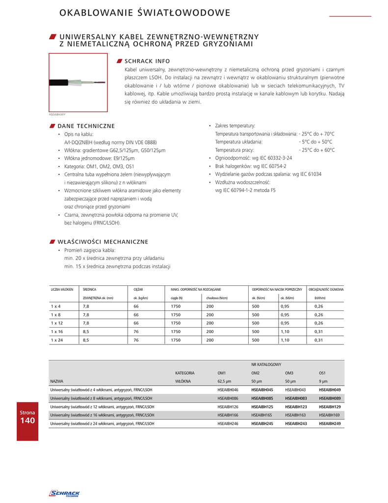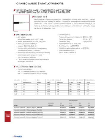 OKABLOWANIE ŚWIATŁOWODOWE W UNIWERSALNY KABEL ZEWNĘTRZNO-WEWNĘTRZNY Z NIEMETALICZNĄ OCHRONĄ PRZED GRYZONIAMI W SCHRACK INFO Kabel uniwersalny, zewnętrzno-wewnętrzny z niemetaliczną ochroną przed gryzoniami i czarnym płaszczem LSOH. Do instalacji na zewnątrz i wewnątrz w okablowaniu strukturalnym (pierwotne okablowanie i / lub wtórne / pionowe okablowanie) lub w sieciach telekomunikacyjnych, TV kablowej, itp. Kable umożliwiają bardzo prostą instalację w kanale kablowym lub korytku. Nadają się również do układania w ziemi. HSEAIBHXXY W DANE TECHNICZNE • Zakres temperatury: • Opis na kablu: Temperatura transportowania i składowania: - 25°C do + 70°C A/I-DQ(ZNB)H (według normy DIN VDE 0888) • Włókna: gradientowe G62,5/125µm, G50/125µm Temperatura układania: - 5°C do + 50°C Temperatura pracy: - 25°C do + 60°C • Włókna jednomodowe: E9/125µm • Ognioodporność: wg IEC 60332-3-24 • Kategoria: OM1, OM2, OM3, OS1 • Brak halogenków: wg IEC 60754-2 • Centralna tuba wypełniona żelem (niewypływającym • Wydzielanie gazów podczas spalania: wg IEC 61034 • Wzdłużna wodoszczelność: i niezawierającym silikonu) z n włóknami wg IEC 60794-1-2 metoda F5 • Wzmocnione szkliwem włókna aramidowe jako elementy zabezpieczające przed naprężaniem i wodą oraz chroniące przed gryzoniami • Czarna, zewnętrzna powłoka odporna na promienie UV, bez halogenu (FRNC/LSOH). W WŁAŚCIWOŚCI MECHANICZNE • Promień zagięcia kabla: min. 20 x średnica zewnętrzna przy układaniu min. 15 x średnica zewnętrzna podczas instalacji LICZBA WŁÓKIEN ŚREDNICA CIĘŻAR MAKS. ODPORNOŚĆ NA ROZCIĄGANIE ODPORNOŚĆ NA NACISK POPRZECZNY ZEWNĘTRZNA ok. (mm) ok. (kg/km) ciągła (N) chwilowa (N/cm) ok. (N/cm) ok. (MJ/m) OBCIĄŻALNOŚĆ OGNIOWA (kWh/m) 1x4 7,8 66 1750 200 500 0,95 0,26 1x8 7,8 66 1750 200 500 0,95 0,26 1 x 12 7,8 66 1750 200 500 0,95 0,26 1 x 16 8,5 76 1750 200 500 1,10 0,31 1 x 24 8,5 76 1750 200 500 1,10 0,31 NR KATALOGOWY KATEGORIA OM1 OM2 OM3 OS1 WŁÓKNA 62,5 µm 50 µm 50 µm 9 µm Uniwersalny światłowód z 4 włóknami, antygryzoń, FRNC/LSOH HSEAIBH046 HSEAIBH045 HSEAIBH043 HSEAIBH049 Uniwersalny światłowód z 8 włóknami, antygryzoń, FRNC/LSOH HSEAIBH086 HSEAIBH085 HSEAIBH083 HSEAIBH089 Uniwersalny światłowód z 12 włóknami, antygryzoń, FRNC/LSOH HSEAIBH126 HSEAIBH125 HSEAIBH123 HSEAIBH129 Uniwersalny światłowód z 16 włóknami, antygryzoń, FRNC/LSOH HSEAIBH166 HSEAIBH165 HSEAIBH163 HSEAIBH169 Uniwersalny światłowód z 24 włóknami, antygryzoń, FRNC/LSOH HSEAIBH246 HSEAIBH245 HSEAIBH243 HSEAIBH249 NAZWA Strona 140