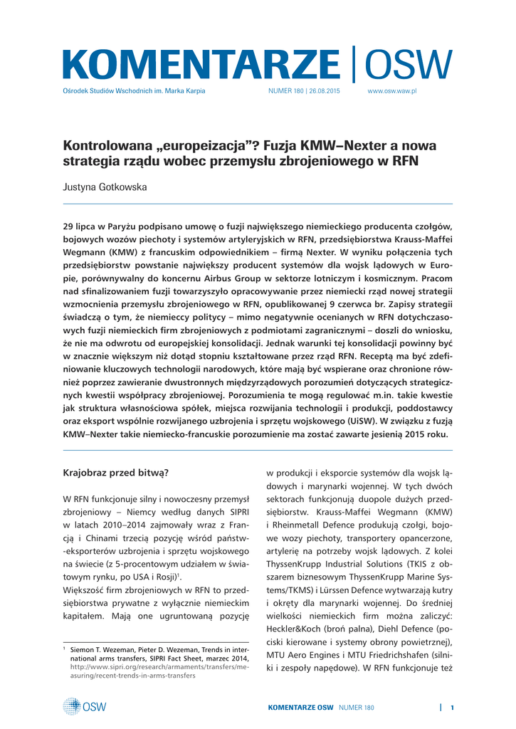 Ośrodek Studiów Wschodnich im. Marka Karpia NUMER 180 | 26.08.2015 www.osw.waw.pl Kontrolowana „europeizacja”? Fuzja KMW–Nexter a nowa strategia rządu wobec przemysłu zbrojeniowego w RFN Justyna Gotkowska 29 lipca w Paryżu podpisano umowę o fuzji największego niemieckiego producenta czołgów, bojowych wozów piechoty i systemów artyleryjskich w RFN, przedsiębiorstwa Krauss-Maffei Wegmann (KMW) z francuskim odpowiednikiem – firmą Nexter. W wyniku połączenia tych przedsiębiorstw powstanie największy producent systemów dla wojsk lądowych w Europie, porównywalny do koncernu Airbus Group w sektorze lotniczym i kosmicznym. Pracom nad sfinalizowaniem fuzji towarzyszyło opracowywanie przez niemiecki rząd nowej strategii wzmocnienia przemysłu zbrojeniowego w RFN, opublikowanej 9 czerwca br. Zapisy strategii świadczą o tym, że niemieccy politycy – mimo negatywnie ocenianych w RFN dotychczasowych fuzji niemieckich firm zbrojeniowych z podmiotami zagranicznymi – doszli do wniosku, że nie ma odwrotu od europejskiej konsolidacji. Jednak warunki tej konsolidacji powinny być w znacznie większym niż dotąd stopniu kształtowane przez rząd RFN. Receptą ma być zdefiniowanie kluczowych technologii narodowych, które mają być wspierane oraz chronione również poprzez zawieranie dwustronnych międzyrządowych porozumień dotyczących strategicznych kwestii współpracy zbrojeniowej. Porozumienia te mogą regulować m.in. takie kwestie jak struktura własnościowa spółek, miejsca rozwijania technologii i produkcji, poddostawcy oraz eksport wspólnie rozwijanego uzbrojenia i sprzętu wojskowego (UiSW). W związku z fuzją KMW–Nexter takie niemiecko-francuskie porozumienie ma zostać zawarte jesienią 2015 roku. Krajobraz przed bitwą? W RFN funkcjonuje silny i nowoczesny przemysł zbrojeniowy – Niemcy według danych SIPRI w latach 2010–2014 zajmowały wraz z Francją i Chinami trzecią pozycję wśród państw-eksporterów uzbrojenia i sprzętu wojskowego na świecie (z 5-procentowym udziałem w światowym rynku, po USA i Rosji)1. Większość firm zbrojeniowych w RFN to przedsiębiorstwa prywatne z wyłącznie niemieckim kapitałem. Mają one ugruntowaną pozycję Siemon T. Wezeman, Pieter D. Wezeman, Trends in international arms transfers, SIPRI Fact Sheet, marzec 2014, http://www.sipri.org/research/armaments/transfers/measuring/recent-trends-in-arms-transfers 1 w produkcji i eksporcie systemów dla wojsk lądowych i marynarki wojennej. W tych dwóch sektorach funkcjonują duopole dużych przedsiębiorstw. Krauss-Maffei Wegmann (KMW) i Rheinmetall Defence produkują czołgi, bojowe wozy piechoty, transportery opancerzone, artylerię na potrzeby wojsk lądowych. Z kolei ThyssenKrupp Industrial Solutions (TKIS z obszarem biznesowym ThyssenKrupp Marine Systems/TKMS) i Lürssen Defence wytwarzają kutry i okręty dla marynarki wojennej. Do średniej wielkości niemieckich firm można zaliczyć: Heckler&Koch (broń palna), Diehl Defence (pociski kierowane i systemy obrony powietrznej), MTU Aero Engines i MTU Friedrichshafen (silniki i zespoły napędowe). W RFN funkcjonuje też KOMENTARZE OSW NUMER 180 1 wiele małych i średnich poddostawców zajmujących czołowe pozycje w niszowych technologiach wojskowych, produkujących podzespoły dla przemysłu lotniczego, kosmicznego, okrętowego i systemów lądowych (OHB, Rhode-Schwarz, Plath, ESG, Atlas Elektronik). Do tej pory „europeizacja” przemysłu zbrojeniowego w RFN miała miejsce w sektorze lotniczym i kosmicznym oraz częściowo w produkcji broni rakietowej. Dotychczasowe projekty konsolidacji na poziomie europejskim są oceniane w Niemczech negatywnie. Do tej pory „europeizacja” przemysłu zbrojeniowego w RFN miała miejsce głównie w sektorze lotniczym i kosmicznym. Efektem fali konsolidacji w zachodnioeuropejskim przemyśle zbrojeniowym było powstanie koncernu EADS (2000 rok) produkującego samoloty i śmigłowce na rynek cywilny i wojskowy (fuzja firm z Francji, Niemiec i Hiszpanii; koncern przemianowano na Airbus Group w 2014 roku) oraz powołanie koncernu MBDA (fuzja firm z Francji, Wielkiej Brytanii, Włoch, Hiszpanii w 2001 roku; z dołączeniem niemieckiej LFK w 2005 roku). Oba koncerny są obecne na rynku niemieckim poprzez zakłady produkcyjne spółek córek Airbus Group (Airbus, Airbus Defence&Space, Airbus Helicopters)2 oraz spółkę córkę MBDA (MBDA Deutschland) produkującą pociski rakietowe i systemy obrony powietrznej. Jednak niemieckie oceny konsolidacji, w szczególności z Airbus Group, są negatywne, o czym otwarcie piszą politycy w RFN3. Airbus (produkcja samolotów cywilnych: Hamburg, Brema), Airbus Defence & Space (produkcja wojskowa: Ottobrunn – podzespoły do satelitów; Friedrichshafen – sondy i satelity; Manching – Eurofighter; Ulm – radary; Brema - A400M), Airbus Helicopters (Donauwörth – H135 i H145, Tiger i NH90). 3 Rainer Arnold (rzecznik frakcji SPD ds. polityki obronnej), Ausverkauf deutscher Panzer an Frankreich verhindern!, Frankfurter Allgemeine Zeitung, 08.07.2015, http:// www.faz.net/aktuell/politik/inland/ruestungsindustrie-keine-deutschen-panzer-an-frankreich-13690282.html 2 Z jednej strony wszystkie projekty zbrojeniowe Bundeswehry realizowane przez ten europejski koncern (samolot transportowy A400M, śmigłowce NH90 i Tiger) mają kilkuletnie opóźnienia, wynikające m.in. z trudności w zarządzaniu i decentralizacji produkcji (oprócz zróżnicowanych i zmienianych narodowych specyfikacji). Z drugiej strony, zarówno główna siedziba koncernu, jak i centra kompetencji technologicznych zostały kosztem RFN przeniesione w ostatnich latach do Francji. Rząd RFN, który ma 12% udziałów (na równi z Francją) w koncernie, nie zgodził się w 2012 roku na dalszą jego „europeizację” poprzez połączenie z brytyjskim BAE System4. Rząd obawiał się dalszej marginalizacji niemieckich zakładów produkcyjnych po fuzji oraz – ze wzglę