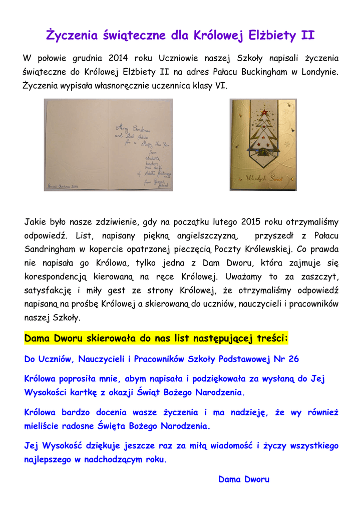 Życzenia świąteczne dla Królowej Elżbiety II W połowie grudnia 2014 roku Uczniowie naszej Szkoły napisali życzenia świąteczne do Królowej Elżbiety II na adres Pałacu Buckingham w Londynie. Życzenia wypisała własnoręcznie uczennica klasy VI. Jakie było nasze zdziwienie, gdy na początku lutego 2015 roku otrzymaliśmy odpowiedź. List, napisany piękną angielszczyzną, przyszedł z Pałacu Sandringham w kopercie opatrzonej pieczęcią Poczty Królewskiej. Co prawda nie napisała go Królowa, tylko jedna z Dam Dworu, która zajmuje się korespondencją kierowaną na ręce Królowej. Uważamy to za zaszczyt, satysfakcję i miły gest ze strony Królowej, że otrzymaliśmy odpowiedź napisaną na prośbę Królowej a skierowaną do uczniów, nauczycieli i pracowników naszej Szkoły. Dama Dworu skierowała do nas list następującej treści: Do Uczniów, Nauczycieli i Pracowników Szkoły Podstawowej Nr 26 Królowa poprosiła mnie, abym napisała i podziękowała za wysłaną do Jej Wysokości kartkę z okazji Świąt Bożego Narodzenia. Królowa bardzo docenia wasze życzenia i ma nadzieję, że wy również mieliście radosne Święta Bożego Narodzenia. Jej Wysokość dziękuje jeszcze raz za miłą wiadomość i życzy wszystkiego najlepszego w nadchodzącym roku. Dama Dworu