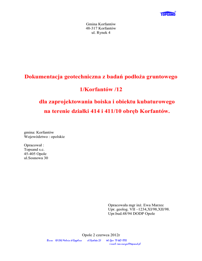 Gmina Korfantów 48-317 Korfantów ul. Rynek 4 Dokumentacja geotechniczna z badań podłoża gruntowego 1/Korfantów /12 dla zaprojektowania boiska i obiektu kubaturowego na terenie działki 414 i 411/10 obręb Korfantów. gmina: Korfantów Województwo : opolskie Opracował : Topsand s.c. 45-405 Opole ul.Sosnowa 30 Opracowała mgr inż. Ewa Marzec Upr. geolog. VII –1234,XI/98,XII/98. Upr.bud.48/94 DODP Opole Opole 2 czerwca 2012r Biuro: 47-316 Malnia k/Gogolina ul.Opolska 21 tel./fax 77 467 1773 e-mail: [email protected] 1.0 Wstęp . Niniejsza dokumentacja geotechniczna opracowana została przez Topsand s.c. 45-405 Opole ul. Sosnowa 30 na zlecenie Gminy Korfantów zgodnie z umową z dnia 1.06.2012r. Celem przeprowadzonych badań było rozpoznanie warunków gruntowo-wodnych wraz z określeniem parametrów geotechnicznych podłoża .Niniejsza dokumentacja określa geotechniczne warunki posadowienia obiektów budowlanych , kubaturowych i boisk drogowych. Teren objęty opracowaniem to działka 414 i 411/10 obręb Korfantów, położona u zbiegu ulic 1 Maja i Powstańców Śląskich w Korfantowie, w obrębie zwartej zabudowy mieszkaniowej. Znajduje się na niej budynek szkolny i boisko oraz obiekty administracyjne. Pod względem morfologicznym teren badan położony jest w południowej części Niziny Śląskiej. Teren w przeszłości użytkowany był górniczo. Wyrobisko wypełniono odpadami innymi niż niebezpieczne. Górną parte wyrobiska sformowano z mieszaniny piasku , mielonej cegły i zagęszczono. Dokumentację wykonano na podstawie otrzymanych wyników wierceń i badań gruntów wraz z ich interpretacją w oparciu o : - Rozporządzenie Ministra Transportu ,Budownictwa i Gospodarki Morskiej w sprawie ustalania geotechnicznych warunków posadawiania obiektów budowlanych , z dnia 27 kwietnia 2012 roku. - ISO 14688-1,2. Geotechnika - ISO 14686 Geotechnika - PN-EN 1997-1,2.Eurokod 7 - BN-76/8950-03„ Obliczanie współczynnika filtracji na podstawie uziarnienia i porowatości „ - Materiały szkoleniowe OOIIB „ Fundamentowanie na gruntach słabych i zdegradowanych „ - Materiały szkoleniowe ITB „ Zagospodarowanie gruntów zdegradowanych „, oraz w oparciu o materiały archiwalne. 2.0.Zakres prac badawczych a/ Prace polowe i badania terenowe w ramach niniejszego opracowania wykonano 6 otworów geotechnicznych do głębokości maksymalnej 5m ppt. - zgodnie z lokalizacją wskazana przez zamawiającego . W trakcie wierceń prowadzono na bieżąco analizę makroskopowa przewierconych gruntów oraz pobierano próby o naturalnej wilgotności i uziarnieniu. Wykonano także sondowania sondą dynamiczną gruntów sypkich , a krzyżakową FVT gruntów spoistych .Dla gruntów antropogenicznych wykonano badania laboratoryjne. Prace terenowe prowadzone były pod stałym nadzorem geologa mgr inż. Ewy Marzec. Biuro: 47-316 Malnia k/Gogolina ul.Opolska 21 tel./fax 77 467 1773 e-mail: [email protected] b/prace kameralne objęły-analizę materiałów archiwalnych i literatury -analizę wykonanych prac i badań polowych -ustalenie cech wiodących gruntów -opracowanie charakterystyki warunków geotechnicznych wraz z wnioskami do projektowania 3.0.Budowa geologiczna i warunki wodne . Podłoże budowlane omawianego terenu zbadane otworami wiertniczymi z roku 2012 i archiwalnymi do głębokości 9,7 metra budują grunty nasypowe , nasypy niebudowlane w stanie luźnym, złożone z piasków, gruzu ceglanego i betonowego, zalegające na gruntach polodowcowych o wysokich parametrach geotechnicznych. Grunty rodzime , polodowcowe reprezentowane są przez piaski ze żwirem średnio zagęszczone , gliny piaszczyste oraz piaski gliniaste twardoplastyczne. Warstwy w podłożu wykazują poziome zaleganie. Zwierciadło wody o charakterze swobodnym nawiercono 7,6 m pod powierzchnia terenu. Poziom wody gruntowej może ulec zmianie o 1 m po roztopach zimowych. 4.0.Geotechniczna charakterystyka podłoża. Podłoże budowlane omawianego terenu budują grunty uwarstwione o zróżnicowanych parametrach geotechnicznych. Uwzględniając w/w kryteria wydzielono w nim następujące warstwy geotechniczneprzy czym jako parametr wiodący przyjęto stopień zagęszczenia i skład granulometryczny dla gruntów sypkich oraz stopień plastyczności dla gruntów spoistych. - WARSTWA I – obejmująca nasypy niebudowlane z piasku , cegły , betonu , piasku i gliny. Uogólniony stopień zagęszczenia warstwy bardzo luźny wg PN-EN ISO 14688-1 i 2/ dawniej luźny/. - WARSTWA II - obejmująca piaski średnie w stanie średniozagęszczonym wg PN-EN ISO 14688-1 i 2., - WARSTWA III - obejmująca gliny piaszczyste w stanie 150-160 kPa wg wg PN-EN ISO 14688-1 i 2, o IL =0,15/ dawniej twardoplastyczne/, - WARSTWA IV - obejmująca piaski gliniaste w stanie 150-160 kPa wg wg PN-EN ISO 14688-1 i 2, o IL = 0,15/ dawniej twardoplastyczne/. Biuro: 47-316 Malnia k/Gogolina ul.Opolska 21 tel./fax 77 467 1773 e-mail: [email protected] 5.0.Ocena geotechnicznych warunków posadowienia. 5.1.Warunki gruntowe uznaje się za złożone z uwagi na występowanie nasypów antropogenicznych , warunki wodne uznaje się za dobre. 5.2.Proponuje się przyjecie przez projektanta pierwszej kategorii geotechnicznej dla projektowanych obiektów budowlanych. 5.3.Grunty antropogeniczne , nasypowe są przydatne do formowania nasypu budowlanego. 5.4.Podłoże gruntowe nie spełnia wymagań dla kategorii G4 i wymaga wzmocnienia. Zaleca się przyjęcie następującej metody wzmocnienia podłoża gruntowego dla boiska: -zagęszczenie statyczne nasypów walcem okołkowanym, -wbudowanie geokraty na geotkaninie , geokrata 15 cm wysokości, -wypełnienie geokraty kruszywem o optymalnym uziarnieniu o CBR >=20. -zagęszczenie kruszywa. 5.5.Podłoże pod obiekt kubaturowy nie spełnia wymagań dla posadowienia bezpośredniego. Zaleca się dla obiektu kubaturowego posadowienie pośrednie z użyciem studni na gruncie nośnym, warstwie geotechnicznej II. 5.6.Parametry geotechnicz