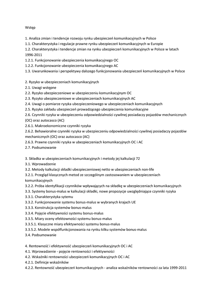 Wstęp 1. Analiza zmian i tendencje rozwoju rynku ubezpieczeń komunikacyjnych w Polsce 1.1. Charakterystyka i regulacje prawne rynku ubezpieczeń komunikacyjnych w Europie 1.2. Charakterystyka i tendencje zmian na rynku ubezpieczeń komunikacyjnych w Polsce w latach 1996-2011 1.2.1. Funkcjonowanie ubezpieczenia komunikacyjnego OC 1.2.2. Funkcjonowanie ubezpieczenia komunikacyjnego AC 1.3. Uwarunkowania i perspektywy dalszego funkcjonowania ubezpieczeń komunikacyjnych w Polsce 2. Ryzyko w ubezpieczeniach komunikacyjnych 2.1. Uwagi wstępne 2.2. Ryzyko ubezpieczeniowe w ubezpieczeniu komunikacyjnym OC 2.3. Ryzyko ubezpieczeniowe w ubezpieczeniach komunikacyjnych AC 2.4. Uwagi o pomiarze ryzyka ubezpieczeniowego w ubezpieczeniach komunikacyjnych 2.5. Ryzyko zakładu ubezpieczeń prowadzącego ubezpieczenia komunikacyjne 2.6. Czynniki ryzyka w ubezpieczeniu odpowiedzialności cywilnej posiadaczy pojazdów mechanicznych (OC) oraz autocasco (AC) 2.6.1. Makroekonomiczne czynniki ryzyka 2.6.2. Behawioralne czynniki ryzyka w ubezpieczeniu odpowiedzialności cywilnej posiadaczy pojazdów mechanicznych (OC) oraz autocasco (AC) 2.6.3. Prawne czynniki ryzyka w ubezpieczeniach komunikacyjnych OC i AC 2.7. Podsumowanie 3. Składka w ubezpieczeniach komunikacyjnych i metody jej kalkulacji 72 3.1. Wprowadzenie 3.2. Metody kalkulacji składki ubezpieczeniowej netto w ubezpieczeniach non-life 3.2.1. Przegląd klasycznych metod ze szczególnym zastosowaniem w ubezpieczeniach komunikacyjnych 3.2.2. Próba identyfikacji czynników wpływających na składkę w ubezpieczeniach komunikacyjnych 3.3. Systemy bonus-malus w kalkulacji składki, nowe propozycje uwzględniające czynniki ryzyka 3.3.1. Charakterystyka sytemu 3.3.2. Funkcjonowanie systemu bonus-malus w wybranych krajach UE 3.3.3. Konstrukcja systemów bonus-malus 3.3.4. Pojęcie efektywności systemu bonus-malus 3.3.5. Miary oceny efektowności systemu bonus-malus 3.3.5.1. Klasyczne miary efektywności systemu bonus-malus 3.3.5.2. Modele współfunkcjonowania na rynku kilku systemów bonus-malus 3.4. Podsumowanie 4. Rentowność i efektywność ubezpieczeń komunikacyjnych OC i AC 4.1. Wprowadzenie - pojęcie rentowności i efektywności 4.2. Wskaźniki rentowności ubezpieczeń komunikacyjnych OC i AC 4.2.1. Definicje wskaźników 4.2.2. Rentowność ubezpieczeń komunikacyjnych - analiza wskaźników rentowności za lata 1999-2011 4.3. Przyczyny braku rentowności ubezpieczeń komunikacyjnych 4.3.1. Próba identyfikacji czynników mających wpływ na wysokość wypłacanych odszkodowań i świadczeń z ubezpieczeń komunikacyjnych w Polsce 4.4. Próba identyfikacji czynników określających efektywność ubezpieczeń komunikacyjnych z punktu widzenia klientów 4.5. Podsumowanie 5. Szkody osobowe w ubezpieczeniach OC posiadaczy pojazdów mechanicznych - analiza wybranych problemów 5.1. Kompensacja szkód osobowych o charakterze majątkowym pokrywanych z ubezpieczeń odpowiedzialności cywilnej - koncepcje ekonomiczne 5.1.1. Przegląd rozwiązań systemowych w zakresie szkód o charakterze majątkowym (economic loss) 5.1.2. Ekonomiczne aspekty ustalania świadczeń z tytułu utraconych dochodów w polskim systemie 5.2. Szkody osobowe w ubezpieczeniach odpowiedzialności cywilnej posiadaczy pojazdów mechanicznych - problem rent 5.2.1. Symulacja rent 5.2.2. Uwagi końcowe 6. Metody zmniejszania ryzyka zakładu ubezpieczeń pochodzącego z ubezpieczeń komunikacyjnych 6.1. Ryzyko zakładu ubezpieczeń - wprowadzenie 6.1.1. Rodzaje ryzyka zakładu ubezpieczeń 6.2. Zarządzanie ryzykiem ubezpieczeniowym w ubezpieczeniach komunikacyjnych 6.3. Zarządzanie ryzykiem kredytowym w ubezpieczeniach komunikacyjnych 6.3.1. Współpraca z reasekuratorami 6.3.2. Współpraca z pośrednictwem ubezpieczeniowym 6.4. Zarządzanie ryzykiem operacyjnym w obszarze ubezpieczeń komunikacyjnych 6.5. Efektywność i metody jej pomiaru w procesie biznesowym w zakładzie ubezpieczeń Zakończenie Literatura Spis rysunków Spis tabel