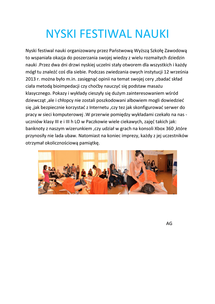 NYSKI FESTIWAL NAUKI Nyski festiwal nauki organizowany przez Państwową Wyższą Szkołę Zawodową to wspaniała okazja do poszerzania swojej wiedzy z wielu rozmaitych dziedzin nauki .Przez dwa dni drzwi nyskiej uczelni stały otworem dla wszystkich i każdy mógł tu znaleźć coś dla siebie. Podczas zwiedzania owych instytucji 12 września 2013 r. można było m.in. zasięgnąć opinii na temat swojej cery ,zbadać skład ciała metodą bioimpedacji czy choćby nauczyć się podstaw masażu klasycznego. Pokazy i wykłady cieszyły się dużym zainteresowaniem wśród dziewcząt ,ale i chłopcy nie zostali poszkodowani albowiem mogli dowiedzieć się ,jak bezpiecznie korzystać z Internetu ,czy tez jak skonfigurować serwer do pracy w sieci komputerowej .W przerwie pomiędzy wykładami czekało na nas uczniów klasy III e i III h LO w Paczkowie wiele ciekawych, zajęć takich jak: banknoty z naszym wizerunkiem ,czy udział w grach na konsoli Xbox 360 ,które przynosiły nie lada ubaw. Natomiast na koniec imprezy, każdy z jej uczestników otrzymał okolicznościową pamiątkę. AG