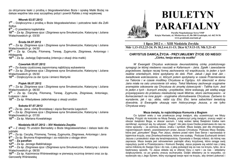 za otrzymane łaski z prośbą o błogosławieństwo Boże i opiekę Matki Bożej na dalsze wspólne lata oraz szczęśliwy pobyt i powrót Rafała z misji wojskowej Wtorek 03.07.2012 700 – Dziękczynna z prośbą o Boże błogosławieństwo i potrzebne łaski dla Zofii Sołtys 830 – O powołania kapłańskie 1830 – Za śp. Zbigniewa ojca i Zbigniewa syna Smulewiczów, Katarzynę i Juliana Wałachowskich gr. 03/30 Środa 04.07.2012 700 – Za śp. Zbigniewa ojca i Zbigniewa syna Smulewiczów, Katarzynę i Juliana Wałachowskich gr. 04/30 830 – Za śp. Cecylię, Filomenę, Teresę, Zygmunta, Zbigniewa, Antoniego i Hildegardę 1830 – Za śp. Jadwigę Dąbrowską (intencja z okazji dnia matki) Czwartek 05.07.2012 700 – Za duszę czyśćcową zapomnianą najbliższą wybawienia 830 – Za śp. Zbigniewa ojca i Zbigniewa syna Smulewiczów, Katarzynę i Juliana Wałachowskich gr. 05/30 1830 – Dziękczynna za dar życia i śmierci Martynki Piątek 06.07.2012 700 – Za śp. Zbigniewa ojca i Zbigniewa syna Smulewiczów, Katarzynę i Juliana Wałachowskich gr. 06/30 830 – Za śp. Cecylię, Filomenę, Teresę, Zygmunta, Zbigniewa, Antoniego, Łukasza i Jana 1830 – Za śp. Władysława Jabłońskiego z okazji urodzin Sobota 07.07.2012 700 – Za śp. Jana, córkę Bronisławę i zięcia Bernarda Łagockich 830 – Za śp. Zbigniewa ojca i Zbigniewa syna Smulewiczów, Katarzynę i Juliana Wałachowskich gr. 07/30 1830 – Za śp. Mariana Kowalskiego Niedziela 08.07.2012 – XIV Niedziela Zwykła 630 – Z okazji 75 urodzin Bernadety o Boże błogosławieństwo i dalsze łaski dla jubilatki 745 – Za śp. Cecylię, Filomenę, Teresę, Zygmunta, Zbigniewa, Antoniego i Jana 915 – Za śp. Brunona Krajewskiego i za rodziców z obojga stron 1030 – Za parafian 1200 – Za śp. Jerzego Bablińskiego 1300 – Za śp. Zbigniewa ojca i Zbigniewa syna Smulewiczów, Katarzynę i Juliana Wałachowskich gr. 08/30 1830 – Za śp. Kazimierza Wiśniewskiego w pierwszą rocznicę śmierci oraz za śp. Genowefę Wiśniewską BIULETYN PARAFIALNY Parafia Niepokalanego Serca NMP Księża Marianie, ul. Mickiewicza 43, 86-300 Grudziądz, tel. 462 54 56 www.grudziadz.marianie.pl 1 lipca 2012 r. – XIII Niedziela Zwykła Mdr 1,13-15;2,23-24; Ps 30,2.4-6.11-13; 2Kor 8,7.9.13-15; Mk 5,21-43 CHRYSTUS DAWCĄ ŻYCIA - PRZYJMUJEMY ŻYCIE OD NIEGO! „Córko, twoja wiara cię ocaliła” W Ewangelii Chrystus wskrzesza dwunastoletnią córkę przełożonego synagogi (w której niedawno nauczał) w Kafarnaum - Jaira. Zgiełk i zawodzenie pogrzebowe, będące raczej formą zachowania niż współczucia, to jeden z tych realiów orientalnych, które spotykamy do dziś. Piotr, Jakub i jego brat Jan świadkowie wskrzeszenia, ci, których potem spotykamy w czasie Przemienienia na Taborze i w czasie modlitwy Chrystusa w Ogrójcu. Ich obecność w domu Jaira miała na celu umocnienie ich wiary. Tekst Markowy zachowuje oryginalne aramejskie odezwanie się Chrystusa do zmarłej dziewczynki - Talitha kum. Jest to jeden z tych - licznych zresztą - przykładów, które wskazują, jak wielką wagę przywiązywano do przekazu nieskażonej nauki Mistrza, skoro zachowywano - w tłumaczeniach na inne języki - oryginalne sformułowania Chrystusa. Zarówno to wyrażenie, jak i np.: abba, rabbi czy Eloi, Eloi, lama sabachtani świadczą dowodnie, iż Ewangelie ukazują nam historycznego Jezusa, a nie tylko Chrystusa wiary. Msza święta, to najściślejsza Komunia z Bogiem Co tydzień wielu z nas przekracza progi świątyni, aby uczestniczyć we Mszy Świętej. Przyjść do kościoła na Mszę Świętą, przekroczyć próg świątyni, znaczy wejść w obszar świętości Boga, w obszar sacrum. I tutaj wobec takiej Świętości trzeba nam zamilknąć, wyciszyć się, by usłyszeć „ Kogoś”, kto jako żywa Osoba przemawia do nas na różne sposoby – za pomocą słowa, znaku i symboli. Msza święta, jest dla chrześcijan, najcenniejszym darem, pozostawionym przez Jezusa Chrystusa. Podczas Mszy Świętej, która jest „pomysłem” Boga, Pan Jezus, otwiera przed nami Swe Serce i wprowadza w tajemnice krzyża, oraz Zmartwychwstania, które nas ocalają. Podczas Eucharystii śmierć Jezusa z przeszłości staje się teraźniejszością. Opowiada o Swojej miłości, do której nas zaprasza. Msza święta jest odnowieniem pamiątki ofiary krzyżowej, która osiąga swój najwyższy punkt w Przeistoczeniu i Komunii Świętej. Jezus pojawia się wśród nas z taką sama miłością do Swego Ojca i do nas, z jaką poświęcił się za nas na krzyżu, tylko, że w bezkrwawy sposób. To Jezus składa się w ofierze Ojcu z nami i za nas - składamy dziękczynienie, co po grecku znaczy eucharystia. Dzięki składamy za to wszystko, co wydarzyło się z Jego Synem, który wyciągnął swoje ręce na krzyżu, aby śmierć pokonać i objawić moc zmartwychwstania, abyśmy mogli uczestniczyć w życiu, które On w pełni posiada i które nam daje. Aby odkryć, czym jest tajemnica Mszy św., trzeba sobie postawić pytanie: Po co ja na Mszę św. przychodzę? Jaki jest cel Mszy św.? Jak długo nasza odpowiedź będzie brzmieć:” abym nie miał grzechu, bo Kościół mnie do tego zobowiązuje” tak długo Msza św. będzie dla nas niczym więcej, jak uciążliwym obowiązkiem. Ale gdy przyjdziemy na Mszę św., z nastawieniem, że: „Przychodzę, aby uczyć się miłości, przychodzę na Spotkanie z Bogiem Wszechwiedzącym, który wszystko wie o mnie i moim sercu”, to zaczniemy odkrywać niezwykłą wagę tych minut, które spędzamy w kościele blisko Ołtarza. Doskonalenie miłości to główny cel uczestniczenia we Mszy św., tutaj bowiem czeka na mnie sam Jezus, aby mi miłość objawić i miłości uczyć. Liturgia, to Jezus, który się modli, wielbi, dziękuje, a nasza modlitwa łączy się z Jego modlitwą, dlatego nasze powierzchowne w niej uczestniczenie jest niegodziwe. W Eucharystii Bóg daje do zrozumienia jak bardzo zal
