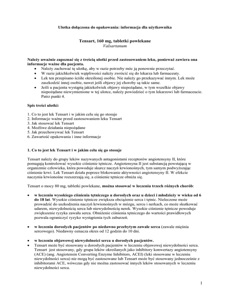 Ulotka dołączona do opakowania: informacja dla użytkownika Tensart, 160 mg, tabletki powlekane Valsartanum Należy uważnie zapoznać się z treścią ulotki przed zastosowaniem leku, ponieważ zawiera ona informacje ważne dla pacjenta. Należy zachować tę ulotkę, aby w razie potrzeby móc ją ponownie przeczytać. W razie jakichkolwiek wątpliwości należy zwrócić się do lekarza lub farmaceuty. Lek ten przepisano ściśle określonej osobie. Nie należy go przekazywać innym. Lek może zaszkodzić innej osobie, nawet jeśli objawy jej choroby są takie same. Jeśli u pacjenta wystąpią jakiekolwiek objawy niepożądane, w tym wszelkie objawy niepożądane niewymienione w tej ulotce, należy powiedzieć o tym lekarzowi lub farmaceucie. Patrz punkt 4. Spis treści ulotki: 1. Co to jest lek Tensart i w jakim celu się go stosuje 2. Informacje ważne przed zastosowaniem leku Tensart 3. Jak stosować lek Tensart 4. Możliwe działania niepożądane 5. Jak przechowywać lek Tensart 6. Zawartość opakowania i inne informacje 1. Co to jest lek Tensart i w jakim celu się go stosuje Tensart należy do grupy leków nazywanych antagonistami receptorów angiotensyny II, które pomagają kontrolować wysokie ciśnienie tętnicze. Angiotensyna II jest substancją powstającą w organizmie człowieka, która powoduje skurcz naczyń krwionośnych, tym samym podwyższając ciśnienie krwi. Lek Tensart działa poprzez blokowanie aktywności angiotensyny II. W efekcie naczynia krwionośne rozszerzają się, a ciśnienie tętnicze obniża się. Tensart o mocy 80 mg, tabletki powlekane, można stosować w leczeniu trzech różnych chorób: w leczeniu wysokiego ciśnienia tętniczego u dorosłych oraz u dzieci i młodzieży w wieku od 6 do 18 lat. Wysokie ciśnienie tętnicze zwiększa obciążenie serca i tętnic. Nieleczone może prowadzić do uszkodzenia naczyń krwionośnych w mózgu, sercu i nerkach, co może skutkować udarem, niewydolnością serca lub niewydolnością nerek. Wysokie ciśnienie tętnicze powoduje zwiększenie ryzyka zawału serca. Obniżenie ciśnienia tętniczego do wartości prawidłowych pozwala ograniczyć ryzyko wystąpienia tych zaburzeń. w leczeniu dorosłych pacjentów po niedawno przebytym zawale serca (zawale mięśnia sercowego). Niedawny oznacza okres od 12 godzin do 10 dni. w leczeniu objawowej niewydolności serca u dorosłych pacjentów. Tensart może być stosowany u dorosłych pacjentów w leczeniu objawowej niewydolności serca. Tensart jest stosowany, gdy grupa leków określanych jako inhibitory konwertazy angiotensyny (ACE) (ang. Angiotensin Converting Enzyme Inhibitors, ACEI) (leki stosowane w leczeniu niewydolności serca) nie mogą być zastosowane lub Tensart może być stosowany jednocześnie z inhibitorami ACE, wówczas gdy nie można zastosować innych leków stosowanych w leczeniu niewydolności serca. 1 Objawy niewydolności serca obejmują duszność oraz obrzęki stóp i nóg z powodu nagromadzenia się płynów. Są one spowodowane tym, że mięsień sercowy nie jest w stanie pompować krwi z dostateczną siłą, aby dostarczyć organizmowi wymaganą ilość krwi. 2. Informacje ważne przed zastosowaniem leku Tensart Kiedy nie stosować leku Tensart: jeśli pacjent ma uczulenie na walsartan, olej sojowy, orzeszki ziemne lub którykolwiek z pozostałych składników tego leku (wymienionych w punkcie 6); jeśli u pacjenta występuje ciężka choroba wątroby; jeśli pacjentka jest w co najmniej 3. miesiącu ciąży (lepiej również unikać stosowania leku Tensart we wczesnym okresie ciąży – patrz punkt „Ciąża i karmienie piersią”); jeśli pacjent ma cukrzycę lub zaburzenia czynności nerek i jest leczony lekiem obniżającym ciśnienie krwi zawierającym aliskiren. Ostrzeżenia i środki ostrożności Przed rozpoczęciem stosowania leku Tensart należy zwrócić się do lekarza lub farmaceuty: jeśli u pacjenta występuje choroba wątroby; jeśli u pacjenta stwierdzono ciężką chorobę nerek lub jeśli pacjent poddawany jest dializoterapii; jeśli u pacjenta występuje zwężenie tętnicy nerkowej; jeśli pacjentowi niedawno przeszczepiono nerkę (otrzymał nową nerkę); jeśli pacjent jest leczony po zawale serca lub z powodu niewydolności serca, lekarz może skontrolować czynność nerek; jeśli u pacjenta występuje ciężka choroba serca, inna niż niewydolność serca lub zawał serca; jeśli u pacjenta kiedykolwiek wystąpił obrzęk języka i twarzy, spowodowany reakcją alergiczną, nazywaną obrzękiem naczynioruchowym, po zażyciu innych leków (w tym inhibitorów ACE). Jeśli takie objawy wystąpią u pacjenta podczas przyjmowania leku Tensart, należy przerwać przyjmowanie leku Tensart i natychmiast skontaktować się z lekarzem. Nie wolno nigdy ponownie stosować leku Tensart. Patrz także punkt 4; jeśli pacjent stosuje leki, które zwiększają stężenie potasu we krwi. Są to: suplementy potasu lub substytuty soli kuchennej zawierające potas, leki oszczędzające potas i heparyna. Konieczne może być regularne oznaczanie stężenia potasu we krwi; jeśli pacjent przyjmuje którykolwiek z poniższych leków stosowanych w leczeniu wysokiego ciśnienia krwi: - inhibitor ACE (na przykład enalapryl, lizynopryl, ramipryl), zwłaszcza jeśli pacjent ma zaburzenia czynności nerek związane z cukrzycą. -aliskiren. jeśli pacjent jest leczony inhibitorem ACE w połączeniu z innymi lekami stosowanymi w leczeniu niewydolności serca, znanymi jako antagoniści receptorów mineralokortykoidowych (ang. Mineralocorticoid Receptor Antagonist, MRA) (na przykład spironolakton, eplerenon) lub beta-adrenolityki (na przykład metoprolol). Lekarz prowadzący może monitorować czynność nerek, ciśnienie krwi oraz stężenie elektrolitów (np. potasu) we krwi w regularnych odstępach czasu. Patrz także informacje pod nagłówkiem „Kiedy nie stosować leku Tensart”. jeśli pacjent ma cukrzycę lub zaburzenia czynno