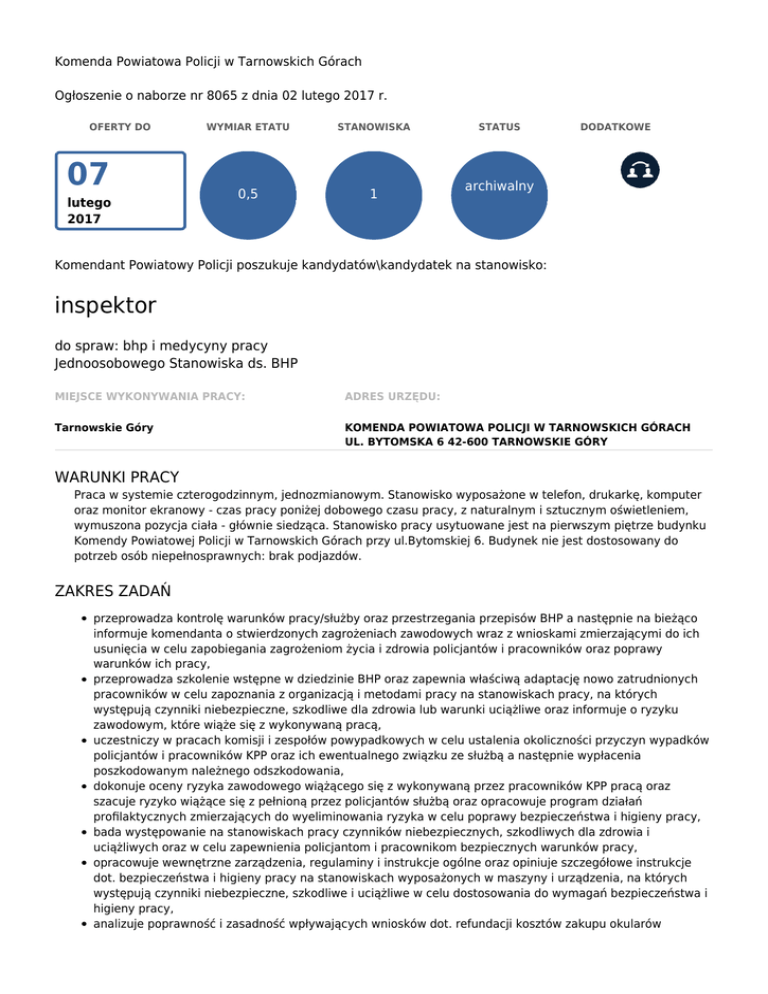 Komenda Powiatowa Policji w Tarnowskich Górach Ogłoszenie o naborze nr 8065 z dnia 02 lutego 2017 r. OFERTY DO 07 lutego 2017 WYMIAR ETATU STANOWISKA 0,5 1 STATUS DODATKOWE archiwalny Komendant Powiatowy Policji poszukuje kandydatów\kandydatek na stanowisko: inspektor do spraw: bhp i medycyny pracy Jednoosobowego Stanowiska ds. BHP MIEJSCE WYKONYWANIA PRACY: ADRES URZĘDU: Tarnowskie Góry KOMENDA POWIATOWA POLICJI W TARNOWSKICH GÓRACH UL. BYTOMSKA 6 42-600 TARNOWSKIE GÓRY WARUNKI PRACY Praca w systemie czterogodzinnym, jednozmianowym. Stanowisko wyposażone w telefon, drukarkę, komputer oraz monitor ekranowy - czas pracy poniżej dobowego czasu pracy, z naturalnym i sztucznym oświetleniem, wymuszona pozycja ciała - głównie siedząca. Stanowisko pracy usytuowane jest na pierwszym piętrze budynku Komendy Powiatowej Policji w Tarnowskich Górach przy ul.Bytomskiej 6. Budynek nie jest dostosowany do potrzeb osób niepełnosprawnych: brak podjazdów. ZAKRES ZADAŃ przeprowadza kontrolę warunków pracy/służby oraz przestrzegania przepisów BHP a następnie na bieżąco informuje komendanta o stwierdzonych zagrożeniach zawodowych wraz z wnioskami zmierzającymi do ich usunięcia w celu zapobiegania zagrożeniom życia i zdrowia policjantów i pracowników oraz poprawy warunków ich pracy, przeprowadza szkolenie wstępne w dziedzinie BHP oraz zapewnia właściwą adaptację nowo zatrudnionych pracowników w celu zapoznania z organizacją i metodami pracy na stanowiskach pracy, na których występują czynniki niebezpieczne, szkodliwe dla zdrowia lub warunki uciążliwe oraz informuje o ryzyku zawodowym, które wiąże się z wykonywaną pracą, uczestniczy w pracach komisji i zespołów powypadkowych w celu ustalenia okoliczności przyczyn wypadków policjantów i pracowników KPP oraz ich ewentualnego związku ze służbą a następnie wypłacenia poszkodowanym należnego odszkodowania, dokonuje oceny ryzyka zawodowego wiążącego się z wykonywaną przez pracowników KPP pracą oraz szacuje ryzyko wiążące się z pełnioną przez policjantów służbą oraz opracowuje program działań profilaktycznych zmierzających do wyeliminowania ryzyka w celu poprawy bezpieczeństwa i higieny pracy, bada występowanie na stanowiskach pracy czynników niebezpiecznych, szkodliwych dla zdrowia i uciążliwych oraz w celu zapewnienia policjantom i pracownikom bezpiecznych warunków pracy, opracowuje wewnętrzne zarządzenia, regulaminy i instrukcje ogólne oraz opiniuje szczegółowe instrukcje dot. bezpieczeństwa i higieny pracy na stanowiskach wyposażonych w maszyny i urządzenia, na których występują czynniki niebezpieczne, szkodliwe i uciążliwe w celu dostosowania do wymagań bezpieczeństwa i higieny pracy, analizuje poprawność i zasadność wpływających wniosków dot. refundacji kosztów zakupu okularów korygujących dla osób obsługujących monitory ekranowe, przygotowuje dokumentacje niezbędną do refundacji w celu przekazania do realizacji Wydziałowi Finansów. WYMAGANIA NIEZBĘDNE Wykształcenie: średnie techniczne z BHP ukończenie szkoły dla służb bhp umiejętność dokonywania oceny czynników szkodliwych i zagrożeń na stanowiskach pracy oraz organizowanie pracy własnej, rzetelność, umiejętność komunikowania się, umiejętność współpracy. Posiadanie obywatelstwa polskiego Korzystanie z pełni praw publicznych Nieskazanie prawomocnym wyrokiem za umyślne przestępstwo lub umyślne przestępstwo skarbowe WYMAGANIA DODATKOWE Wykształcenie: wyższe o kierunku BHP doświadczenie zawodowe: w służbie BHP studia podyplomowe w zakresie bhp, uprawnienia dydaktyczne do prowadzenia szkoleń w zakresie BHP poświadczenie bezpieczeństwa umiejętność organizowania pracy własnej, rzetelność, umiejętność komunikowania się, umiejętność współpracy. DOKUMENTY I OŚWIADCZENIA NIEZBĘDNE Życiorys/CV i list motywacyjny Kopie dokumentów potwierdzających spełnienie wymagania niezbędnego w zakresie wykształcenia Kopie dokumentów potwierdzających spełnienie wymagania niezbędnego w zakresie doświadczenia zawodowego / stażu pracy Oświadczenie o posiadaniu obywatelstwa polskiego albo kopia dokumentu potwierdzającego posiadanie polskiego obywatelstwa Oświadczenie o wyrażeniu zgody na przetwarzanie danych osobowych do celów naboru Oświadczenie o korzystaniu z pełni praw publicznych Oświadczenie o nieskazaniu prawomocnym wyrokiem za umyślne przestępstwo lub umyślne przestępstwo skarbowe DOKUMENTY I OŚWIADCZENIA DODATKOWE Kopie dokumentów potwierdzających spełnienie wymagania dodatkowego w zakresie wykształcenia Kopie dokumentów potwierdzających spełnienie wymagania dodatkowego w zakresie doświadczenia zawodowego / stażu pracy Kopie dokumentów potwierdzających doświadczenie zawodowe wskazane w wymogach stanowiska pracy ( w tym także dokumenty potwierdzające aktualne zatrudnienie o ile jest ono potwierdzeniem wymaganego doświadczenia. TERMINY I MIEJSCE SKŁADANIA DOKUMENTÓW Dokumenty należy złożyć do: 07 lutego 2017 r. Decyduje data: stempla pocztowego / osobistego dostarczenia oferty do urzędu Miejsce składania dokumentów: Komenda Powiatowa Policji w Tarnowskich Górach ul. Bytomska 6 42-600 Tarnowskie Góry INNE INFORMACJE: W miesiącu poprzedzającym datę upublicznienia ogłoszenia wskaźnik zatrudnienia osób niepełnosprawnych w urzędzie, w rozumieniu przepisów o rehabilitacji zawodowej i społecznej oraz zatrudnianiu osób niepełnosprawnych, wynosi co najmniej 6%. Zachęcamy do wzięcia udziału w naborze osoby niepełnosprawne. Życiorys w formie CV. Oferty niepodpisane, niekompletne, niespełniające wymogów formalnych oraz złożone po terminie (decyduje data stempla pocztowego) nie będą rozpatrywane. Kandydaci spełniający wymagania zostaną poinformowanie telefonicznie o kolejnych etapach selekcji. Nasz urząd jest pracodawcą równych szans i wszystkie aplikacje są rozważane z równą uwagą be