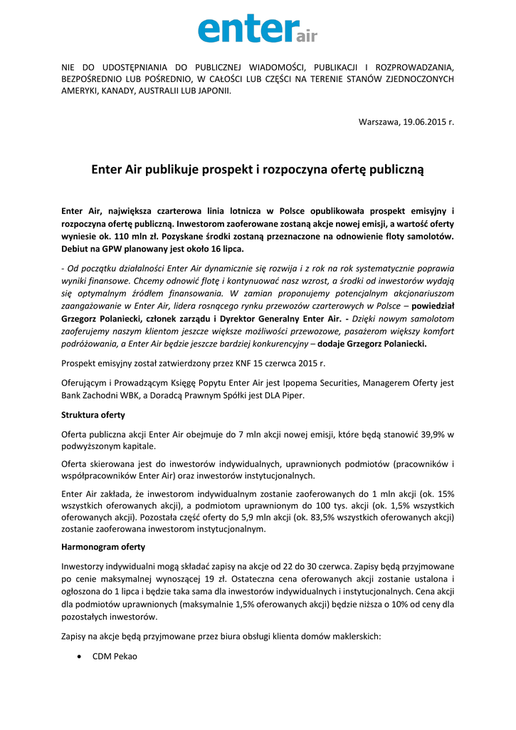 NIE DO UDOSTĘPNIANIA DO PUBLICZNEJ WIADOMOŚCI, PUBLIKACJI I ROZPROWADZANIA, BEZPOŚREDNIO LUB POŚREDNIO, W CAŁOŚCI LUB CZĘŚCI NA TERENIE STANÓW ZJEDNOCZONYCH AMERYKI, KANADY, AUSTRALII LUB JAPONII. Warszawa, 19.06.2015 r. Enter Air publikuje prospekt i rozpoczyna ofertę publiczną Enter Air, największa czarterowa linia lotnicza w Polsce opublikowała prospekt emisyjny i rozpoczyna ofertę publiczną. Inwestorom zaoferowane zostaną akcje nowej emisji, a wartość oferty wyniesie ok. 110 mln zł. Pozyskane środki zostaną przeznaczone na odnowienie floty samolotów. Debiut na GPW planowany jest około 16 lipca. - Od początku działalności Enter Air dynamicznie się rozwija i z rok na rok systematycznie poprawia wyniki finansowe. Chcemy odnowić flotę i kontynuować nasz wzrost, a środki od inwestorów wydają się optymalnym źródłem finansowania. W zamian proponujemy potencjalnym akcjonariuszom zaangażowanie w Enter Air, lidera rosnącego rynku przewozów czarterowych w Polsce – powiedział Grzegorz Polaniecki, członek zarządu i Dyrektor Generalny Enter Air. - Dzięki nowym samolotom zaoferujemy naszym klientom jeszcze większe możliwości przewozowe, pasażerom większy komfort podróżowania, a Enter Air będzie jeszcze bardziej konkurencyjny – dodaje Grzegorz Polaniecki. Prospekt emisyjny został zatwierdzony przez KNF 15 czerwca 2015 r. Oferującym i Prowadzącym Księgę Popytu Enter Air jest Ipopema Securities, Managerem Oferty jest Bank Zachodni WBK, a Doradcą Prawnym Spółki jest DLA Piper. Struktura oferty Oferta publiczna akcji Enter Air obejmuje do 7 mln akcji nowej emisji, które będą stanowić 39,9% w podwyższonym kapitale. Oferta skierowana jest do inwestorów indywidualnych, uprawnionych podmiotów (pracowników i współpracowników Enter Air) oraz inwestorów instytucjonalnych. Enter Air zakłada, że inwestorom indywidualnym zostanie zaoferowanych do 1 mln akcji (ok. 15% wszystkich oferowanych akcji), a podmiotom uprawnionym do 100 tys. akcji (ok. 1,5% wszystkich oferowanych akcji). Pozostała część oferty do 5,9 mln akcji (ok. 83,5% wszystkich oferowanych akcji) zostanie zaoferowana inwestorom instytucjonalnym. Harmonogram oferty Inwestorzy indywidualni mogą składać zapisy na akcje od 22 do 30 czerwca. Zapisy będą przyjmowane po cenie maksymalnej wynoszącej 19 zł. Ostateczna cena oferowanych akcji zostanie ustalona i ogłoszona do 1 lipca i będzie taka sama dla inwestorów indywidualnych i instytucjonalnych. Cena akcji dla podmiotów uprawnionych (maksymalnie 1,5% oferowanych akcji) będzie niższa o 10% od ceny dla pozostałych inwestorów. Zapisy na akcje będą przyjmowane przez biura obsługi klienta domów maklerskich: CDM Pekao DM Pekao DM BZ WBK BM Alior Bank DM mBank Data Etap transakcji 19.06.2015 Podanie do publicznej wiadomości ceny maksymalnej akcji 22-30.06.2015 Okres składania zapisów przez inwestorów indywidualnych oraz uprawnione podmioty 22.06-1.07.2015 Proces budowy księgi popytu 1.07.2015 Ustalenie ostatecznej ceny akcji oraz ostatecznej liczby akcji oferowanych poszczególnym kategoriom inwestorów 2-6.07.2015 Okres składania zapisów przez inwestorów instytucjonalnych 7.07.2015 Data przydziału / zamknięcie oferty 16.07.2015 Przewidywany pierwszy dzień notowania praw do akcji na GPW Cele emisyjne Enter Air planuje zakup 6 nowych samolotów, w tym 2 samoloty Boeing 737-800 oraz 4 samoloty Boeing 737-8 MAX, które zastąpią część dotychczas użytkowanych maszyn. Środki pozyskane z emisji będą przeznaczone na sfinansowanie przedpłat na zakup nowych samolotów wynoszących ok. 15% ceny katalogowej. Dotychczas podpisano umowy na zakup 4 maszyn, których termin przyjęcia do użytkowania zaplanowany jest odpowiednio na: IV kw. 2017 r. II kw. 2018 r. IV kw. 2020 r. II kw. 2021 r. Cena katalogowa nabywanych samolotów to 350,8 mln zł za model Boeing 737-800 oraz 401,9 mln zł za model Boeing 737-8 MAX, przy czym wynegocjowana cena zakupu samolotów, stanowiąca tajemnicę handlową, jest znacząco niższa od ceny katalogowej, pod warunkiem użycia samolotów na potrzeby własne, zgodnie z planami Grupy. Nowe oszczędniejsze samoloty pozwolą zmniejszyć koszty przelotów, zwiększyć efektywność działalności równocześnie poprawiając jakość usługi przewozowej oraz jakość pracy załóg. Wyniki finansowe Enter Air od pierwszego roku działalności jest rentowny i generuje pozytywne przepływy pieniężne z działalności operacyjnej. W 2014 r. Enter Air miał 731,5 mln zł przychodów, 42,2 mln zł EBITDA oraz 17,4 mln zł zysku netto. Około 30% przychodów realizowanych jest z połączeń poza Polską. Prognoza wyników na 2015 r. zakłada osiągnięcie przez spółkę 761,1 mln zł przychodów, 69,5 mln zł EBITDA i 33 mln zł zysku netto. Akcjonariat Enter Air jest prywatnym polskim przewoźnikiem kontrolowanym przez kluczowych managerów. Przy założeniu objęcia wszystkich oferowanych akcji przez nowych inwestorów, będą oni dysponowali 39,9% w kapitale Enter Air, a dotychczasowi akcjonariusze zachowają ponad 60% akcji. Dotychczasowi akcjonariusze przez rok od debiutu nie będą sprzedawać akcji Enter Air (lock-up). O Enter Air Enter Air jest największą czarterową linią lotniczą działającą w Polsce i jednocześnie największym prywatnym przewoźnikiem lotniczym w naszym kraju. Grupa realizuje połączenia dla czołowych polskich i zagranicznych biur podróży latając do ponad 30 krajów od Islandii i Portugalii po Kenię i Tajlandię. Flota Enter Air składa się z 17 samolotów Boeing 737. Przewoźnik posiada pięć stałych baz operacyjnych w Warszawie, Katowicach, Poznaniu, Wrocławiu i Paryżu oraz kilka baz sezonowych, m.in. w Manchesterze, Londynie i Tel Awiwie. Kontakt dla mediów: Jakub Rutkowski Tailors Group [email protected] 603 33 40 68 Informacja prawna: Informacje tu zawarte nie są przeznaczone do publikacji i dystrybucji, bezpośrednio lub pośrednio, na
