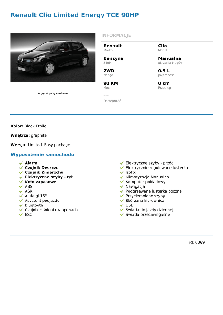 Renault Clio Limited Energy TCE 90HP INFORMACJE zdjęcie przykładowe Renault Clio Marka Model Benzyna Manualna Silnik Skrzynia biegów 2WD 0.9 L Napęd pojemność 90 KM 0 km Moc Przebieg --Dostępność Kolor: Black Etoile Wnętrze: graphite Wersja: Limited, Easy package Wyposażenie samochodu Alarm Czujnik Deszczu Czujnik Zmierzchu Elektryczne szyby - tył Koło zapasowe ABS ASR Alufelgi 16'' Asystent podjazdu Bluetooth Czujnik ciśnienia w oponach ESC Elektryczne szyby - przód Elektrycznie regulowane lusterka Isofix Klimatyzacja Manualna Komputer pokładowy Nawigacja Podgrzewane lusterka boczne Przyciemniane szyby Skórzana kierownica USB Światła do jazdy dziennej Światła przeciwmgielne id: 6069 Powered by TCPDF (www.tcpdf.org)