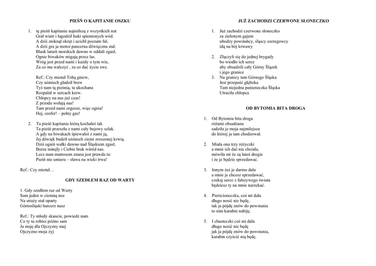 JUŻ ZACHODZI CZERWONE SŁONECZKO PIEŚŃ O KAPITANIE OSZKU 1. 2. tę pieśń kapitanie najmilszą z wszystkich nut Grał wiatr i łagodził huki spienionych wód. A dziś zniknął okręt i ucichł poszum fal, A dziś gra ja motor pancerna dźwięczna stal. Blask latarń morskich dawno w oddali zgasł, Ognie biwaków migają przez las. Wróg jest przed nami i każdy o tym wie, Za co ma walczyć , za co dać życie swe. 1. Już zachodzi czerwone słoneczko za zielonym gajem ubodzy powstańcy, śląscy szeregowcy idą na bój krwawy 2. Ref.: Czy miotał Tobą gniew, Czy uśmiech gładził brew Tyś nam tą pieśnią, ta ukochana Rozpalał w sercach krew. Chłopcy na nas już czas! Z przodu wołają nas! Tam przed nami orgesze, więc ognia! Hej, szofer! – pełny gaz! 3. Złączyli się do jednej brygady bo wiodło ich serce aby obsadzili cały Górny Ślązek i jego granice Na granicy tam Górnego Śląska Jest przepaść głęboka Tam niejedna panieneczka Śląska Utraciła chłopca Ta pieśń kapitanie którą kochałeś tak Ta pieśń przeszła z nami cały bojowy szlak. A gdy na biwakach śpiewałeś z nami ją, Jej dźwięk budził uśmiech ziemi zroszonej krwią. Dziś ogień walki dawno nad Śląskiem zgasł, Burze minęły i Ciebie brak wśród nas. Lecz nam matrosom znana jest prawda ta: Pieśń nie umiera – sława na wieki trwa! Ref.: Czy miotał… OD BYTOMIA BITA DROGA 1. Od Bytomia bita droga różami obsadzana sadziła je moja najmilejsza do której ja tam chodzował. 2. Miała ona trzy różyczki a mnie ich dać nie chciała, mówiła mi że są latoś drogie i że je będzie sprzedawać. 3. Innym żeś je darmo dała a mnie je chcesz sprzedawać, czekaj serce z fałszywego świata będziesz ty na mnie narzekać. 4. Pierścioneczka, coś mi dała długo nosić nie będę, tak ja pójdę znów do powstania to nim karabin nabiję. 5. I chusteczki coś mi dała długo nosić nie będę jak ja pójdę znów do powstania, karabin czyścić nią będę. GDY SZEDŁEM RAZ OD WARTY 1. Gdy szedłem raz od Warty Sam jeden w ciemną noc Na straży stał oparty Górnośląski harcerz nasz Ref.: Ty młody skaucie, powiedz nam Co ty tu robisz późno sam Ja stoję dla Ojczyzny mej Ojczyzno moja żyj GŁĘBOKA STUDZIENKA DO BYTOMISKICH STRZELCÓW Do bytomskich strzelców chłopców zaciągają Niejednej dziewczynie, niejednej kochance Serce zasmucają serce zasmucają Nie płaczże dziewczyno nie smuć sama siebie Bo za roczek za dwa, bo za roczek, za dwa Powrócę do Ciebie, powrócę do Ciebie A jak nie powrócę listy będę pisał Ty będziesz czytała ty będziesz płakała Ja nie będę słyszał, ja nie będę słyszał Napisał listeczek krwią palca swojego Nie mogła przeczytać, nie mogła przeczytać Od żalu wielkiego, od żalu wielkiego Wyszła na góreczkę , gdzie powstańcy jadą Po moim Jasieńku po moim kochanku Konika prowadzą konika prowadzą Głęboka studzienka Głęboka kopalnia A nad nią Kasieńka Jakby malowana Nad studzienką stała Wodę nazbierała O swoim Jasieńku Tak sobie myślała Żebym Cię Jasieńku W wodzie zobaczyła Tobym ja z a tobą Do wody wskoczyła Ale ja nie wskoczę Bo jest za głęboka Daleko jest do dna I zimna woda jest Konika prowadzą żałoba okryty Pewnie mój Jasieniek pewnie mój kochanek Na wojnie zabity, na wojnie zabity DZIEWECZKO ZE ŚLĄSKA Dzieweczko ze Śląska Na trzewiczku wstążka Na szyi korale /x2 Za cztery talary Fartuszek jedwabny W kwiatki wyszywany Na głowie chusteczka /x2 Na dobre słóweczka Przeszwarna dzieweczka Wesołe oczyczka Za ślubny wianeczek /x2 Złoty pierścioneczek ZEFIR 1. Przy świetle które nieprzyjaciel rzucił Widać w milczeniu rozstawione warty Tam młody żołnierz aby czas swój skrócić Tak sobie dumał na orężu wsparty Ref.: Słodki Zefirze, Zefirze jedyny Nieś moje pienia do lubej krainy Powiedz że żyję tu zajęty cały Swoja Ojczyzną i wielkością chwały. 2. Ojczyzno moja, gdy Cię trzeba wspierać Nie żal żyć w nędzy nie żal umierać Dla Ciebie zjadłe smakują trucizny Znosić kalectwa i szlachetność blizny 3. Jutro okazać trzeba wiele męstwa Nim zorza błyśnie bitwa się rozpocznie Śmierć mnie pokona lecz pośród zwycięstwa Chociaż polegnę to pośród mych braci.