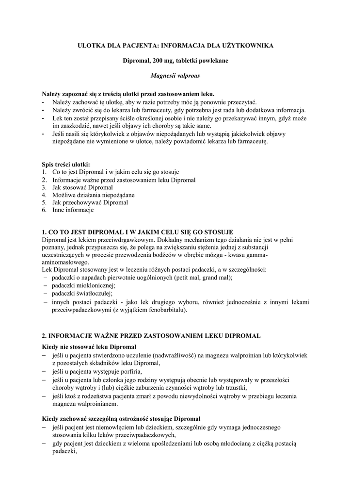 ULOTKA DLA PACJENTA: INFORMACJA DLA UŻYTKOWNIKA Dipromal, 200 mg, tabletki powlekane Magnesii valproas Należy zapoznać się z treścią ulotki przed zastosowaniem leku. - Należy zachować tę ulotkę, aby w razie potrzeby móc ją ponownie przeczytać. - Należy zwrócić się do lekarza lub farmaceuty, gdy potrzebna jest rada lub dodatkowa informacja. - Lek ten został przepisany ściśle określonej osobie i nie należy go przekazywać innym, gdyż może im zaszkodzić, nawet jeśli objawy ich choroby są takie same. - Jeśli nasili się którykolwiek z objawów niepożądanych lub wystąpią jakiekolwiek objawy niepożądane nie wymienione w ulotce, należy powiadomić lekarza lub farmaceutę. Spis treści ulotki: 1. Co to jest Dipromal i w jakim celu się go stosuje 2. Informacje ważne przed zastosowaniem leku Dipromal 3. Jak stosować Dipromal 4. Możliwe działania niepożądane 5. Jak przechowywać Dipromal 6. Inne informacje 1. CO TO JEST DIPROMAL I W JAKIM CELU SIĘ GO STOSUJE Dipromal jest lekiem przeciwdrgawkowym. Dokładny mechanizm tego działania nie jest w pełni poznany, jednak przypuszcza się, że polega na zwiększaniu stężenia jednej z substancji uczestniczących w procesie przewodzenia bodźców w obrębie mózgu - kwasu gammaaminomasłowego. Lek Dipromal stosowany jest w leczeniu różnych postaci padaczki, a w szczególności: − padaczki o napadach pierwotnie uogólnionych (petit mal, grand mal); − padaczki mioklonicznej; − padaczki światłoczułej; − innych postaci padaczki - jako lek drugiego wyboru, również jednocześnie z innymi lekami przeciwpadaczkowymi (z wyjątkiem fenobarbitalu). 2. INFORMACJE WAŻNE PRZED ZASTOSOWANIEM LEKU DIPROMAL Kiedy nie stosować leku Dipromal − jeśli u pacjenta stwierdzono uczulenie (nadwrażliwość) na magnezu walproinian lub którykolwiek z pozostałych składników leku Dipromal, − jeśli u pacjenta występuje porfiria, − jeśli u pacjenta lub członka jego rodziny występują obecnie lub występowały w przeszłości choroby wątroby i (lub) ciężkie zaburzenia czynności wątroby lub trzustki, − jeśli ktoś z rodzeństwa pacjenta zmarł z powodu niewydolności wątroby w przebiegu leczenia magnezu walproinianem. Kiedy zachować szczególną ostrożność stosując Dipromal − jeśli pacjent jest niemowlęciem lub dzieckiem, szczególnie gdy wymaga jednoczesnego stosowania kilku leków przeciwpadaczkowych, − gdy pacjent jest dzieckiem z wieloma upośledzeniami lub osobą młodocianą z ciężką postacią padaczki, − jeśli u pacjenta występuje: uszkodzenie szpiku kostnego, zaburzenia układu krzepnięcia, − − − − − małopłytkowość (znaczne zmniejszenie ilości płytek krwi), dziedziczny niedobór enzymów, niewydolność nerek, hipoproteinemia (zmniejszenie ilości białka we krwi), toczeń rumieniowaty, uszkodzenie mózgu, opóźnienie rozwoju i (lub) dziedziczne choroby metaboliczne, gdy u pacjenta w badaniach laboratoryjnych wystąpią nieprawidłowości, mogące świadczyć o wystąpieniu ciężkich zaburzeń czynności wątroby lub trzustki - trzykrotne zwiększenie aktywności aminotransferazy asparaginianowej (AspAT) lub alaninowej (AlAT), nieprawidłowo długi czas protrombinowy, zwiększenie aktywności fosfatazy zasadowej i stężenia bilirubiny, zmiany stężenia białka w osoczu krwi (konieczne może być odstawienie leku), jeśli u pacjenta wystąpią wymioty, utrata apetytu, ból w nadbrzuszu, złe samopoczucie, zwiększenie częstości napadów padaczki, krwawienia z nosa, obrzęk umiejscowiony lub uogólniony różnego rodzaju, letarg, apatia, senność, wymioty, zmniejszenia ciśnienia tętniczego oraz zwiększenia częstości napadów drgawek (konieczne jest wówczas zgłoszenie się do lekarza, ponieważ objawy te mogą świadczyć o wystąpieniu ciężkiego uszkodzenia wątroby lub zwiększeniu stężenia amoniaku we krwi), gdy u pacjenta wystąpią niespodziewane krwawienia z błon śluzowych lub zwiększona skłonność do powstawania krwiaków (konieczne jest wówczas zgłoszenie się do lekarza), jeśli u pacjenta ma być przeprowadzony zabieg chirurgiczny lub stomatologiczny (przed zabiegiem należy powiadomić lekarza, że przyjmuje się lek Dipromal), gdy u pacjenta występuje cukrzyca (lek może fałszować wynik badania na obecność ciał ketonowych). Zarówno przed rozpoczęciem stosowania leku Dipromal, jak również regularnie w trakcie leczenia (u dzieci co miesiąc przez pierwsze 6 miesięcy, co trzy miesiące przez kolejne pół roku oraz co 4 – 6 miesięcy po 12 miesiącach leczenia) pacjent powinien poddawać się badaniom lekarskim oraz zgłaszać się na badania krwi. Badania krwi wykonywane przed rozpoczęciem leczenia powinny obejmować: pełną morfologię krwi (w tym oznaczenie ilości płytek krwi), oznaczenie parametrów układu krzepnięcia (czas tromboplastynowy, stężenie fibrynogenu), aktywności amylazy w surowicy krwi, AspAT, AlAT, fosfatazy zasadowej, bilirubiny całkowitej, białka, glukozy we krwi, natomiast badania w trakcie leczenia, w przypadku braku zaburzeń klinicznych, pełną morfologię krwi (w tym oznaczenie ilości płytek krwi) i oznaczenie aktywności aminotransferaz wątrobowych, a co drugie badanie również testy układu krzepnięcia. W przypadku dziecka, w okresie pomiędzy badaniami rodzice/opiekunowie powinni pozostawać w regularnym kontakcie telefonicznym z lekarzem prowadzącym – umożliwi to możliwie wczesne rozpoznanie wszelkich niekorzystnych efektów leczenia. Stosowanie leku Dipromal z innymi lekami Należy powiedzieć lekarzowi o wszystkich przyjmowanych ostatnio lekach, również tych, które wydawane są bez recepty. Szczególnie ważne jest, by poinformować lekarza, jeśli jednocześnie z lekiem Dipromal przyjmowane są następujące leki: − inne leki przeciwpadaczkowe, − fenobarbital, − fentytoina, − prymidon, − leki mogące działać toksycznie na wątrobę (m. in. paracetamo