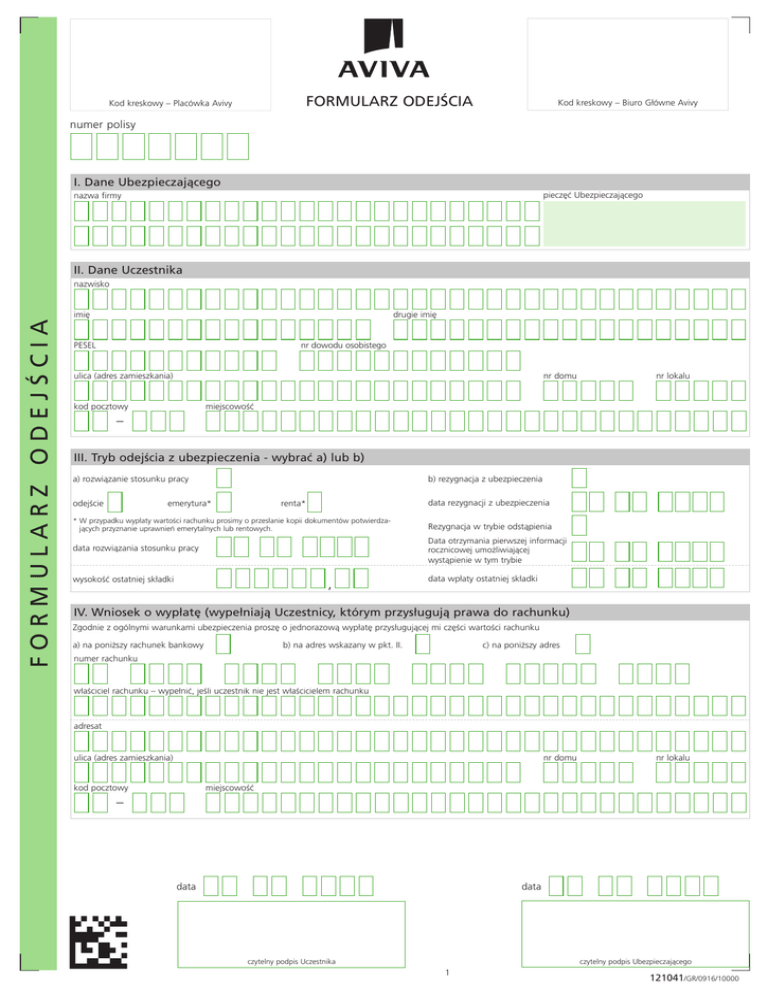 FORMULARZ ODEJŚCIA Kod kreskowy – Placówka Avivy Kod kreskowy – Biuro Główne Avivy numer polisy I. Dane Ubezpieczającego pieczęć Ubezpieczającego nazwa firmy II. Dane Uczestnika FORMULARZ ODEJŚCIA nazwisko drugie imię imię PESEL nr dowodu osobistego ulica (adres zamieszkania) nr domu kod pocztowy nr lokalu miejscowość – III. Tryb odejścia z ubezpieczenia - wybrać a) lub b) a) rozwiązanie stosunku pracy odejście b) rezygnacja z ubezpieczenia emerytura* data rezygnacji z ubezpieczenia renta* * W przypadku wypłaty wartości rachunku prosimy o przesłanie kopii dokumentów potwierdzających przyznanie uprawnień emerytalnych lub rentowych. Rezygnacja w trybie odstąpienia data rozwiązania stosunku pracy Data otrzymania pierwszej informacji rocznicowej umożliwiającej wystąpienie w tym trybie wysokość ostatniej składki , data wpłaty ostatniej składki IV. Wniosek o wypłatę (wypełniają Uczestnicy, którym przysługują prawa do rachunku) Zgodnie z ogólnymi warunkami ubezpieczenia proszę o jednorazową wypłatę przysługującej mi części wartości rachunku a) na poniższy rachunek bankowy b) na adres wskazany w pkt. II. c) na poniższy adres numer rachunku właściciel rachunku – wypełnić, jeśli uczestnik nie jest właścicielem rachunku adresat ulica (adres zamieszkania) nr domu kod pocztowy nr lokalu miejscowość – data data czytelny podpis Ubezpieczającego czytelny podpis Uczestnika 1 121041/GR/0916/10000