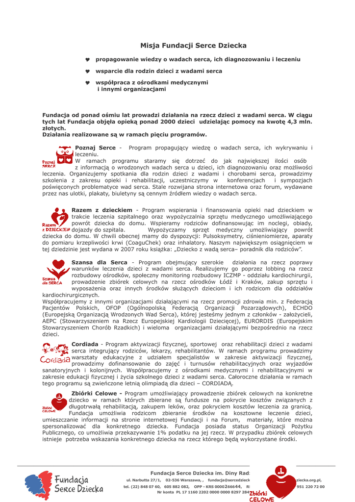 Misja Fundacji Serce Dziecka propagowanie wiedzy o wadach serca, ich diagnozowaniu i leczeniu wsparcie dla rodzin dzieci z wadami serca współpraca z ośrodkami medycznymi i innymi organizacjami Fundacja od ponad ośmiu lat prowadzi działania na rzecz dzieci z wadami serca. W ciągu tych lat Fundacja objęła opieką ponad 2000 dzieci udzielając pomocy na kwotę 4,3 mln. złotych. Działania realizowane są w ramach pięciu programów. Poznaj Serce - Program propagujący wiedzę o wadach serca, ich wykrywaniu i leczeniu. W ramach programu staramy się dotrzeć do jak największej ilości osób z informacją o wrodzonych wadach serca u dzieci, ich diagnozowaniu oraz możliwości leczenia. Organizujemy spotkania dla rodzin dzieci z wadami i chorobami serca, prowadzimy szkolenia z zakresu opieki i rehabilitacji, uczestniczymy w konferencjach i sympozjach poświęconych problematyce wad serca. Stale rozwijana strona internetowa oraz forum, wydawane przez nas ulotki, plakaty, biuletyny są cennym źródłem wiedzy o wadach serca. Razem z dzieckiem - Program wspierania i finansowania opieki nad dzieckiem w trakcie leczenia szpitalnego oraz wypożyczalnia sprzętu medycznego umożliwiającego powrót dziecka do domu. Wspieramy rodziców dofinansowując im noclegi, obiady, dojazdy do szpitala. Wypożyczamy sprzęt medyczny umożliwiający powrót dziecka do domu. W chwili obecnej mamy do dyspozycji: Pulsoksymetry, ciśnieniomierze, aparaty do pomiaru krzepliwości krwi (CoaguChek) oraz inhalatory. Naszym największym osiągnięciem w tej dziedzinie jest wydana w 2007 roku książka: „Dziecko z wadą serca– poradnik dla rodziców”. Szansa dla Serca - Program obejmujący szerokie działania na rzecz poprawy warunków leczenia dzieci z wadami serca. Realizujemy go poprzez lobbing na rzecz rozbudowy ośrodków, społeczny monitoring rozbudowy ICZMP - oddziału kardiochirurgii, prowadzenie zbiórek celowych na rzecz ośrodków Łódź i Kraków, zakup sprzętu i wyposażenia oraz innych środków służących dzieciom i ich rodzicom dla oddziałów kardiochirurgicznych. Współpracujemy z innymi organizacjami działającymi na rzecz promocji zdrowia min. z Federacją Pacjentów Polskich, OFOP (Ogólnopolską Federacją Organizacji Pozarządowych), ECHDO (Europejską Organizacją Wrodzonych Wad Serca), której jesteśmy jednym z członków - założycieli, AEPC (Stowarzyszeniem na Rzecz Europejskiej Kardiologii Dziecięcej), EURORDIS (Europejskim Stowarzyszeniem Chorób Rzadkich) i wieloma organizacjami działającymi bezpośrednio na rzecz dzieci. Cordiada - Program aktywizacji fizycznej, sportowej oraz rehabilitacji dzieci z wadami serca integrujący rodziców, lekarzy, rehabilitantów. W ramach programu prowadzimy warsztaty edukacyjne z udziałem specjalistów w zakresie aktywizacji fizycznej, prowadzimy dofinansowanie do zajęć i turnusów rehabilitacyjnych oraz wyjazdów sanatoryjnych i kolonijnych. Współpracujemy z ośrodkami medycznymi i rehabilitacyjnymi w zakresie edukacji fizycznej i życia szkolnego dzieci z wadami serca. Całoroczne działania w ramach tego programu są zwieńczone letnią olimpiadą dla dzieci – CORDIADĄ. Zbiórki Celowe - Program umożliwiający prowadzenie zbiórek celowych na konkretne dziecko w ramach których zbierane są fundusze na pokrycie kosztów związanych z długotrwałą rehabilitacją, zakupem leków, oraz pokryciem kosztów leczenia za granicą. Fundacja umożliwia rodzicom zbieranie środków na kosztowne leczenie dzieci, umieszczanie informacji na stronie internetowej Fundacji i na Forum, materiały, które można spersonalizować dla konkretnego dziecka. Fundacja posiada status Organizacji Pożytku Publicznego, co umożliwia przekazywanie 1% podatku na jej rzecz. W przypadku zbiórek celowych istnieje potrzeba wskazania konkretnego dziecka na rzecz którego będą wykorzystane środki. _________________________________________________________________________________________________ Fundacja Serce Dziecka im. Diny Radziwiłłowej ul. Narbutta 27/1, 02-536 Warszawa, , tel. (22) 848 07 60, 605 882 082, [email protected], OPP - KRS 0000266644, www.SerceDziecka.org.pl, REGON 140748862, Nr konta PL 17 1160 2202 0000 0000 8297 2843, NIP 951 220 72 00 SWIFT BIGBPLPW