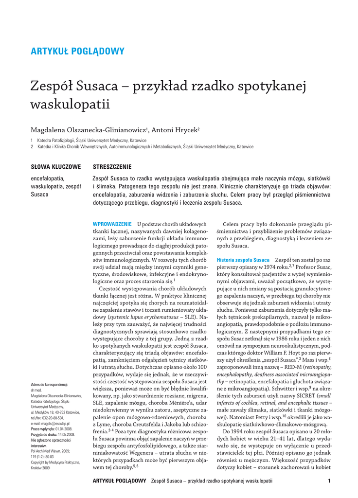 ARTYKUŁ POGLĄDOWY Zespół Susaca – przykład rzadko spotykanej waskulopatii Magdalena Olszanecka‑Glinianowicz1, Antoni Hrycek2 1 Katedra Patofizjologii, Śląski Uniwersytet Medyczny, Katowice 2 Katedra i Klinika Chorób Wewnętrznych, Autoimmunologicznych i Metabolicznych, Śląski Uniwersytet Medyczny, Katowice Słowa kluczowe Streszczenie encefalopatia, waskulopatia, zespół Susaca Zespół Susaca to rzadko występująca waskulopatia obejmująca małe naczynia mózgu, siatkówki i ślimaka. Patogeneza tego zespołu nie jest znana. Klinicznie charakteryzuje go triada objawów: encefalopatia, zaburzenia widzenia i zaburzenia słuchu. Celem pracy był przegląd piśmiennictwa dotyczącego przebiegu, diagnostyki i leczenia zespołu Susaca. Adres do korespondencji: dr med. Magdalena Olszanecka‑Glinianowicz, Katedra Patofizjologii, Śląski Uniwersytet Medyczny, ul. Medyków 18, 40-752 Katowice, tel./fax: 032‑20‑88-504, e‑mail: [email protected] Praca wpłynęła: 01.04.2008. Przyjęta do druku: 14.05.2008. Nie zgłoszono sprzeczności interesów. Pol Arch Med Wewn. 2009; 119 (1‑2): 80-83 Copyright by Medycyna Praktyczna, Kraków 2009 Wprowadzenie U podstaw chorób układowych tkanki łącznej, nazywanych dawniej kolageno zami, leży zaburzenie funkcji układu immuno logicznego prowadzące do ciągłej produkcji pato gennych przeciwciał oraz powstawania komplek sów immunologicznych. W rozwoju tych chorób swój udział mają między innymi czynniki gene tyczne, środowiskowe, infekcyjne i endokryno logiczne oraz proces starzenia się.1 Częstość występowania chorób układowych tkanki łącznej jest różna. W praktyce klinicznej najczęściej spotyka się chorych na reumatoidal ne zapalenie stawów i toczeń rumieniowaty ukła dowy (systemic lupus erythematosus – SLE). Na leży przy tym zauważyć, że najwięcej trudności diagnostycznych sprawiają stosunkowo rzadko występujące choroby z tej grupy. Jedną z rzad ko spotykanych waskulopatii jest zespół Susaca, charakteryzujący się triadą objawów: encefalo patią, zamknięciem odgałęzień tętnicy siatków ki i utratą słuchu. Dotychczas opisano około 100 przypadków, wydaje się jednak, że w rzeczywi stości częstość występowania zespołu Susaca jest większa, ponieważ może on być błędnie kwalifi kowany, np. jako stwardnienie rozsiane, migrena, SLE, zapalenie mózgu, choroba Ménière’a, udar niedokrwienny w wyniku zatoru, aseptyczne za palenie opon mózgowo‑rdzeniowych, choroba z Lyme, choroba Creutzfelda i Jakoba lub schizo frenia.2‑4 Poza tym diagnostyka różnicowa zespo łu Susaca powinna objąć zapalenie naczyń w prze biegu zespołu antyfosfolipidowego, a także ziar niniakowatość Wegenera – utrata słuchu w nie których przypadkach może być pierwszym obja wem tej choroby.5,6 Celem pracy było dokonanie przeglądu pi śmiennictwa i przybliżenie problemów związa nych z przebiegiem, diagnostyką i leczeniem ze społu Susaca. Historia zespołu Susaca Zespół ten został po raz pierwszy opisany w 1974 roku.2,7 Profesor Susac, który konsultował pacjentów z wyżej wymienio nymi objawami, uważał początkowo, że wystę pujące u nich zmiany są postacią granulocytowe go zapalenia naczyń, w przebiegu tej choroby nie obserwuje się jednak zaburzeń widzenia i utraty słuchu. Ponieważ zaburzenia dotyczyły tylko ma łych tętniczek prekapilarnych, nazwał je mikro angiopatią, prawdopodobnie o podłożu immuno logicznym. Z następnymi przypadkami tego ze społu Susac zetknął się w 1986 roku i jeden z nich omówił na sympozjum neurookulistycznym, pod czas którego doktor William F. Hoyt po raz pierw szy użył określenia „zespół Susaca”.3 Mass i wsp.8 zaproponowali inną nazwę – RED‑M (retinopathy, encephalopathy, deafness associated microangiopathy – retinopatia, encefalopatia i głuchota związa ne z mikroangiopatią). Schwitter i wsp.9 na okre ślenie tych zaburzeń użyli nazwy SICRET (small infarcts of cochlea, retinal, and encephalic tissues – małe zawały ślimaka, siatkówki i tkanki mózgo wej). Natomiast Petty i wsp.10 określili je jako wa skulopatię siatkówkowo‑ślimakowo‑mózgową. Do 1994 roku zespół Susaca opisano u 20 mło dych kobiet w wieku 21–41 lat, dlatego wyda wało się, że występuje on wyłącznie u przed stawicielek tej płci. Później opisano go jednak również u mężczyzn. Większość przypadków dotyczy kobiet – stosunek zachorowań u kobiet ARTYKUŁ POGLĄDOWY Zespół Susaca – przykład rzadko spotykanej waskulopatii 1 i mężczyzn wynosi 3:1. Nie stwierdzono związku między występowaniem zespołu Susaca a wiekiem chorych – opisano go zarówno u dzieci (ostatnio u 9‑letniej dziewczynki) jak i u osób starszych >70 roku życia.11‑13 Etiologia i patogeneza Czynniki wpływające na rozwój tego zespołu nie są znane. Nieznana jest również jego patogeneza. Jedna z hipotez za kłada, że zakażenie wirusowe (nieznanym pato genem) może być przyczyną reakcji autoimmuno logicznej prowadzącej do uszkodzenia małych naczyń. W niektórych przypadkach stwierdzano przeciwciała antyfosfolipidowe, mutację czynni ka V Leiden i niedobór białka S.10,14‑16 Niewyjaśnione jest także występujące u więk szości chorych ograniczenie procesu chorobo wego do naczyń mózgu, narządu wzroku i słu chu. U niektórych chorych pojawiają się jednak objawy ogólne, a w bioptatach tkanki mięśnio wej stwierdza się zmiany w małych naczyniach, co wskazuje na układowy charakter choroby z pre dyspozycją do triady charakterystycznej dla tego zespołu.12 Niektórzy autorzy przyjmują, że zespół Susa ca jest konsekwencją zespołu naczynioskurczowe go, hipoteza ta wydaje się jednak mało prawdo podobna. Obserwowano także związek między wystąpieniem objawów a ciążą i terapią hormonal ną, co wskazuje na możliwość udziału hormonów płciowych w patogenezie tego zespołu.14‑16 Objawy i przebi
