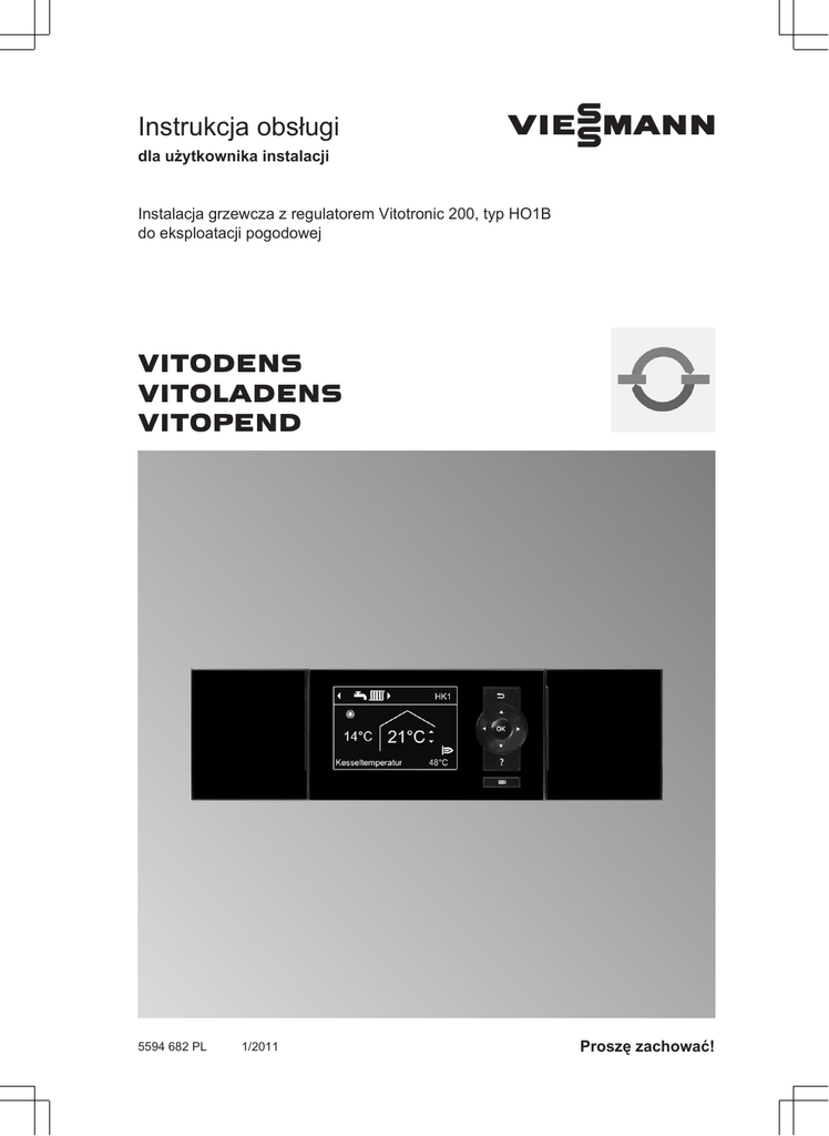 Instrukcja obsługi VIESMANN dla użytkownika instalacji Instalacja grzewcza z regulatorem Vitotronic 200, typ HO1B do eksploatacji pogodowej VITODENS VITOLADENS VITOPEND 5594 682 PL 1/2011 Proszę zachować! Wskazówki bezpieczeństwa Dla własnego bezpieczeństwa Prosimy o dokładne przestrzeganie wskazówek bezpieczeństwa w celu wykluczenia ryzyka utraty zdrowia oraz powstania szkód materialnych. Objaśnienia do wskazówek bezpieczeństwa Niebezpieczeństwo Ten znak ostrzega przed niebezpieczeństwem zranienia. ! Uwaga Ten znak ostrzega przed stratami materialnymi i zanieczyszczeniem środowiska. Wskazówka Tekst oznaczony słowem Wskazówka zawiera dodatkowe informacje. Przeznaczenie Niniejsza instrukcja obsługi skierowana jest do osób obsługujących instalację grzewczą. Niebezpieczeństwo Ulatniający się gaz może spowodować eksplozję, a w jej następstwie ciężkie obrażenia. ■ Nie palić! Nie dopuszczać do powstania otwartego ognia i tworzenia się iskier. Pod żadnym pozorem nie włączać ani nie wyłączać oświetlenia i urządzeń elektrycznych. ■ Zamknąć zawór odcinający gaz. ■ Otworzyć okna i drzwi. ■ Ewakuować osoby z obszaru zagrożenia. ■ Zawiadomić zakład gazowniczy, energetyczny i firmę instalatorską z miejsca poza budynkiem. ■ Zasilanie prądowe budynku rozłączyć z bezpiecznego miejsca (z miejsca poza budynkiem). Jeżeli występuje zapach spalin Niebezpieczeństwo Wdychanie spalin może powodować zatrucia zagrażające życiu i zdrowiu. ■ Wyłączyć instalację grzewczą. ■ Przewietrzyć pomieszczenie kotłowni. ■ Zamknąć drzwi prowadzące do pomieszczeń mieszkalnych. 5594 682 PL Niebezpieczeństwo Niefachowo przeprowadzone prace przy instalacji grzewczej mogą doprowadzić do wypadków zagrażających życiu. ■ Prace przy instalacji gazowej może wykonywać wyłącznie instalator posiadający odpowiednie uprawnienia. ■ Prace na podzespołach elektrycznych mogą być wykonywane tylko przez wykwalifikowany personel. Jeśli występuje zapach gazu 2 Wskazówki bezpieczeństwa Dla własnego bezpieczeństwa (ciąg dalszy) Zachowanie w razie pożaru Niebezpieczeństwo Podczas pożaru istnieje niebezpieczeństwo poparzenia i eksplozji. ■ Wyłączyć instalację grzewczą. ■ Zamknąć zawory odcinające dopływ paliwa. ■ Używać tylko atestowanych gaśnic klasy pożarowej ABC. Wymogi dotyczące kotłowni ! Uwaga Elementy, które nie zostały sprawdzone w połączeniu z instalacją grzewczą, mogą spowodować jej uszkodzenie lub zakłócić prawidłowe funkcjonowanie. Montażu lub wymiany może dokonywać tylko firma specjalistyczna. Uwaga Nieodpowiednie warunki otoczenia mogą spowodować uszkodzenie instalacji grzewczej i zagrozić bezpieczeństwu eksploatacji. ■ Zapewnić temperaturę otoczenia między 0ºC a 35ºC. ■ Powietrze w kotłowni nie może być zanieczyszczone przez chlorowco-alkany (zawarte np. w aerozolach, farbach, rozpuszczalnikach i środkach czyszczących); unikać silnego zapylenia (np. wskutek prac szlifierskich). ■ Unikać długotrwałej wysokiej wilgotności powietrza (np. wskutek częstego suszenia prania). ■ Nie zamykać istniejących otworów nawiewnych. 5594 682 PL ! Elementy dodatkowe, części zamienne i szybkozużywalne 3 Spis treści Spis treści Informacje wstępne Pierwsze uruchomienie........................................................................................ Instalacja posiada wstępne ustawienia................................................................ Pojęcia fachowe................................................................................................... Wskazówki dotyczące oszczędzania energii cieplnej.......................................... 6 6 7 7 Informacje dot. obsługi Elementy obsługowe............................................................................................ 9 ■ Moduł obsługowy.............................................................................................. 9 Menu.................................................................................................................... 10 Obsługa podstawowa........................................................................................... 13 Włączenie i wyłączenie Włączanie instalacji grzewczej............................................................................. Wyłączenie instalacji grzewczej........................................................................... ■ Z zabezpieczeniem przed zamarznięciem........................................................ ■ Bez zabezpieczenia przed zamarznięciem (wyłączenie z eksploatacji)........... 15 16 16 16 Ogrzewanie pomieszczeń Niezbędne ustawienia (ogrzewanie pomieszczeń) ............................................. Wybór obiegu grzewczego................................................................................... Ustawianie temperatury pomieszczenia............................................................... Ustawianie programu roboczego do ogrzewania pomieszczeń........................... Ustawianie programu czasowego do ogrzewania pomieszczeń ......................... Zmiana krzywej grzewczej................................................................................... Wyłączanie ogrzewania pomieszczeń.................................................................. 18 18 19 20 21 22 23 Podgrzew ciepłej wody użytkowej Niezbędne ustawienia (podgrzew wody użytkowej)............................................. Ustawianie temperatury ciepłej wody................................................................... Ustawianie programu roboczego do podgrzewu wody użytkowej........................ Ustawianie programu czasowego do podgrzewu wody użytkowej....................... ■ Instalacja grzewcza z pompą cyrkulacyjną....................................................... Wyłączanie podgrzewu wody użytkowej.................................