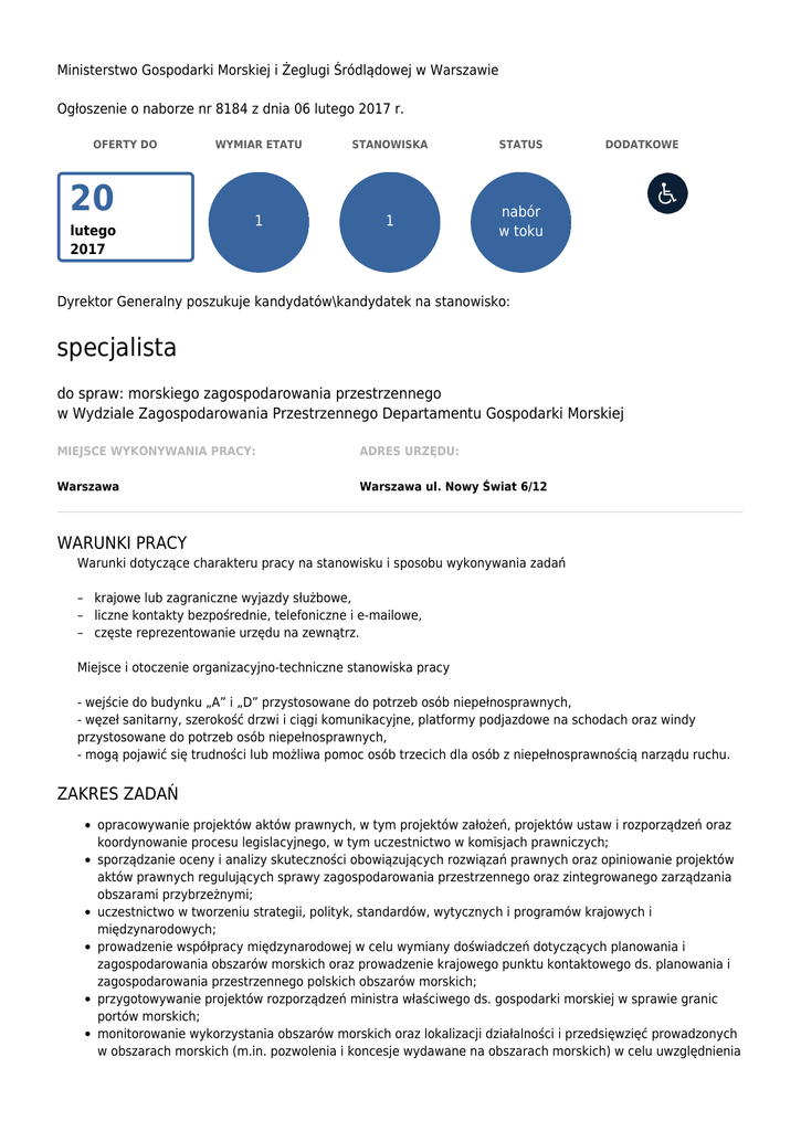 Ministerstwo Gospodarki Morskiej i Żeglugi Śródlądowej w Warszawie Ogłoszenie o naborze nr 8184 z dnia 06 lutego 2017 r. OFERTY DO 20 lutego 2017 WYMIAR ETATU STANOWISKA STATUS 1 1 nabór w toku DODATKOWE Dyrektor Generalny poszukuje kandydatów\kandydatek na stanowisko: specjalista do spraw: morskiego zagospodarowania przestrzennego w Wydziale Zagospodarowania Przestrzennego Departamentu Gospodarki Morskiej MIEJSCE WYKONYWANIA PRACY: ADRES URZĘDU: Warszawa Warszawa ul. Nowy Świat 6/12 WARUNKI PRACY Warunki dotyczące charakteru pracy na stanowisku i sposobu wykonywania zadań – krajowe lub zagraniczne wyjazdy służbowe, – liczne kontakty bezpośrednie, telefoniczne i e-mailowe, – częste reprezentowanie urzędu na zewnątrz. Miejsce i otoczenie organizacyjno-techniczne stanowiska pracy - wejście do budynku „A” i „D” przystosowane do potrzeb osób niepełnosprawnych, - węzeł sanitarny, szerokość drzwi i ciągi komunikacyjne, platformy podjazdowe na schodach oraz windy przystosowane do potrzeb osób niepełnosprawnych, - mogą pojawić się trudności lub możliwa pomoc osób trzecich dla osób z niepełnosprawnością narządu ruchu. ZAKRES ZADAŃ opracowywanie projektów aktów prawnych, w tym projektów założeń, projektów ustaw i rozporządzeń oraz koordynowanie procesu legislacyjnego, w tym uczestnictwo w komisjach prawniczych; sporządzanie oceny i analizy skuteczności obowiązujących rozwiązań prawnych oraz opiniowanie projektów aktów prawnych regulujących sprawy zagospodarowania przestrzennego oraz zintegrowanego zarządzania obszarami przybrzeżnymi; uczestnictwo w tworzeniu strategii, polityk, standardów, wytycznych i programów krajowych i międzynarodowych; prowadzenie współpracy międzynarodowej w celu wymiany doświadczeń dotyczących planowania i zagospodarowania obszarów morskich oraz prowadzenie krajowego punktu kontaktowego ds. planowania i zagospodarowania przestrzennego polskich obszarów morskich; przygotowywanie projektów rozporządzeń ministra właściwego ds. gospodarki morskiej w sprawie granic portów morskich; monitorowanie wykorzystania obszarów morskich oraz lokalizacji działalności i przedsięwzięć prowadzonych w obszarach morskich (m.in. pozwolenia i koncesje wydawane na obszarach morskich) w celu uwzględnienia ich w planach morskiego zagospodarowania przestrzennego przy uwzględnieniu optymalnego wykorzystania morza i zrównoważonego rozwoju obszarów morskich; monitorowanie stanu prac nad opracowaniem planów zagospodarowania przestrzennego obszarów morskich oraz wprowadzanie procedur usprawniających nadzór nad realizacją zadań urzędów morskich w zakresie planowania na obszarach morskich. WYMAGANIA NIEZBĘDNE Wykształcenie: wyższe prawnicze lub wyższe z zakresu planowania i gospodarki przestrzennej. doświadczenie zawodowe: 1 rok w administracji publicznej lub w obszarze gospodarki przestrzennej. znajomość tematyki, w tym przepisów prawnych, w zakresie obszarów morskich oraz planowania i zagospodarowania przestrzennego, znajomość przebiegu procesu legislacyjnego, znajomość języka angielskiego na poziomie B2, organizacja pracy i orientacja na osiąganie celów, myślenie analityczne, rzetelność, współpraca. Posiadanie obywatelstwa polskiego Korzystanie z pełni praw publicznych Nieskazanie prawomocnym wyrokiem za umyślne przestępstwo lub umyślne przestępstwo skarbowe WYMAGANIA DODATKOWE doświadczenie zawodowe: doświadczenie w pracy z oprogramowaniem GIS (Geographic Information System). umiejętność czytania map, korzystania z ogólnodostępnych serwisów mapowych/informacji geograficznej; DOKUMENTY I OŚWIADCZENIA NIEZBĘDNE Życiorys/CV i list motywacyjny Kopie dokumentów potwierdzających spełnienie wymagania niezbędnego w zakresie wykształcenia kopia dokumentu potwierdzającego znajomość języka angielskiego na poziomie B2 lub informacja o poziomie znajomości języka angielskiego na poziomie B2 kopie dokumentów potwierdzających co najmniej 1 rok doświadczenia zawodowego w administracji publicznej lub w obszarze gospodarki przestrzennej Oświadczenie o posiadaniu obywatelstwa polskiego albo kopia dokumentu potwierdzającego posiadanie polskiego obywatelstwa Oświadczenie o wyrażeniu zgody na przetwarzanie danych osobowych do celów naboru Oświadczenie o korzystaniu z pełni praw publicznych Oświadczenie o nieskazaniu prawomocnym wyrokiem za umyślne przestępstwo lub umyślne przestępstwo skarbowe DOKUMENTY I OŚWIADCZENIA DODATKOWE kopia dokumentu potwierdzającego niepełnosprawność - w przypadku kandydatek/kandydatów, zamierzających skorzystać z pierwszeństwa w zatrudnieniu w przypadku, gdy znajdą się w gronie najlepszych kandydatek/kandydatów Kopie dokumentów potwierdzających spełnienie wymagania dodatkowego w zakresie doświadczenia zawodowego / stażu pracy TERMINY I MIEJSCE SKŁADANIA DOKUMENTÓW Dokumenty należy złożyć do: 20 lutego 2017 r. Decyduje data: wpływu oferty do urzędu Miejsce składania dokumentów: Ministerstwo Gospodarki Morskiej i Żeglugi Śródlądowej Biuro Dyrektora Generalnego ul. Nowy Świat 6/12 00-400 Warszawa lub składać w kancelarii, ul. Nowy Świat 6/12 z dopiskiem w liście motywacyjnym: DGM-2/17 INNE INFORMACJE: W miesiącu poprzedzającym datę upublicznienia ogłoszenia wskaźnik zatrudnienia osób niepełnosprawnych w urzędzie, w rozumieniu przepisów o rehabilitacji zawodowej i społecznej oraz zatrudnianiu osób niepełnosprawnych, nie wynosi co najmniej 6%. Do udziału w naborze, zachęcamy również osoby niepełnosprawne, które spełniają wymagania określone w ogłoszeniu oraz po uwzględnieniu informacji dotyczących oferowanych warunków pracy. Metody/techniki, które będą stosowane podczas naboru: weryfikacja formalna ofert, sprawdzian wiedzy/umiejętności. Kandydaci proszeni są o podanie numeru telefonu i/lub adresu poczty elektronicznej. Oferty otrzymane po terminie nie będą rozpatry