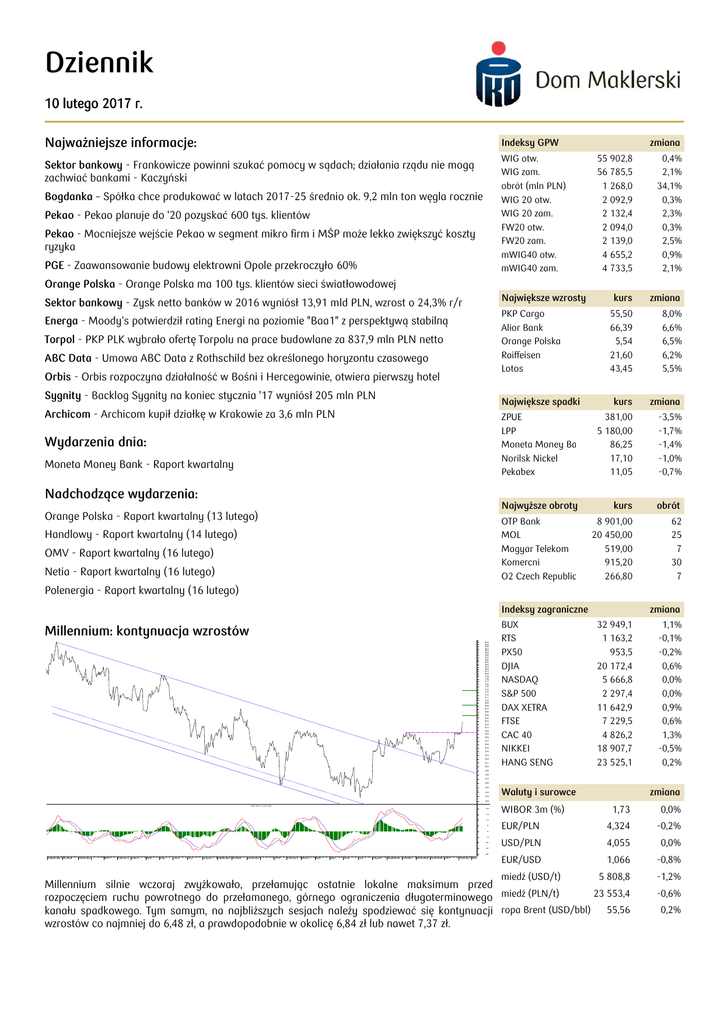 Dziennik 10 lutego 2017 r. Najważniejsze informacje: Indeksy GPW WIG otw. WIG zam. obrót (mln PLN) WIG 20 otw. WIG 20 zam. FW20 otw. FW20 zam. mWIG40 otw. mWIG40 zam. Sektor bankowy - Frankowicze powinni szukać pomocy w sądach; działania rządu nie mogą zachwiać bankami - Kaczyński Bogdanka – Spółka chce produkować w latach 2017-25 średnio ok. 9,2 mln ton węgla rocznie Pekao - Pekao planuje do '20 pozyskać 600 tys. klientów Pekao - Mocniejsze wejście Pekao w segment mikro firm i MŚP może lekko zwiększyć koszty ryzyka PGE - Zaawansowanie budowy elektrowni Opole przekroczyło 60% zmiana 55 902,8 56 785,5 1 268,0 2 092,9 2 132,4 2 094,0 2 139,0 4 655,2 4 733,5 0,4% 2,1% 34,1% 0,3% 2,3% 0,3% 2,5% 0,9% 2,1% Orange Polska - Orange Polska ma 100 tys. klientów sieci światłowodowej Największe wzrosty Sektor bankowy - Zysk netto banków w 2016 wyniósł 13,91 mld PLN, wzrost o 24,3% r/r PKP Cargo Alior Bank Orange Polska Raiffeisen Lotos Energa - Moody’s potwierdził rating Energi na poziomie "Baa1" z perspektywą stabilną Torpol - PKP PLK wybrało ofertę Torpolu na prace budowlane za 837,9 mln PLN netto ABC Data - Umowa ABC Data z Rothschild bez określonego horyzontu czasowego Orbis - Orbis rozpoczyna działalność w Bośni i Hercegowinie, otwiera pierwszy hotel Sygnity - Backlog Sygnity na koniec stycznia '17 wyniósł 205 mln PLN Największe spadki Archicom - Archicom kupił działkę w Krakowie za 3,6 mln PLN Moneta Money Bank - Raport kwartalny Nadchodzące wydarzenia: Orange Polska - Raport kwartalny (13 lutego) Handlowy - Raport kwartalny (14 lutego) OMV - Raport kwartalny (16 lutego) Netia - Raport kwartalny (16 lutego) zmiana 8,0% 6,6% 6,5% 6,2% 5,5% kurs zmiana 381,00 5 180,00 86,25 17,10 11,05 -3,5% -1,7% -1,4% -1,0% -0,7% Najwyższe obroty kurs obrót OTP Bank MOL Magyar Telekom Komercni O2 Czech Republic 8 901,00 20 450,00 519,00 915,20 266,80 62 25 7 30 7 ZPUE LPP Moneta Money Bank Norilsk Nickel Pekabex Wydarzenia dnia: kurs 55,50 66,39 5,54 21,60 43,45 Polenergia - Raport kwartalny (16 lutego) Indeksy zagraniczne Millennium: kontynuacja wzrostów 9.4 9.3 9.2 9.1 9.0 8.9 8.8 8.7 8.6 8.5 8.4 8.3 8.2 8.1 8.0 7.9 7.8 7.7 7.6 7.5 7.4 7.3 7.2 7.1 7.0 6.9 6.8 6.7 6.6 6.5 6.4 6.3 6.2 6.1 6.0 5.9 5.8 5.7 5.6 5.5 5.4 5.3 5.2 5.1 5.0 BUX RTS PX50 DJIA NASDAQ S&P 500 DAX XETRA FTSE CAC 40 NIKKEI HANG SENG zmiana 32 949,1 1 163,2 953,5 20 172,4 5 666,8 2 297,4 11 642,9 7 229,5 4 826,2 18 907,7 23 525,1 1,1% -0,1% -0,2% 0,6% 0,0% 0,0% 0,9% 0,6% 1,3% -0,5% 0,2% 4.9 4.8 4.7 4.6 4.5 4.4 4.3 Waluty i surowce zmiana 4.2 Mi d-term In di c ator 20 15 WIBOR 3m (%) 1,73 0,0% EUR/PLN 4,324 -0,2% USD/PLN 4,055 0,0% EUR/USD 1,066 -0,8% 5 808,8 -1,2% 10 5 0 -5 -10 -15 -20 September October November 2015 Februar y March April May June July August September October November 2016 Februar y March April May June July August September October November December 2017 Februar y March miedź (USD/t) Millennium silnie wczoraj zwyżkowało, przełamując ostatnie lokalne maksimum przed 23 553,4 rozpoczęciem ruchu powrotnego do przełamanego, górnego ograniczenia długoterminowego miedź (PLN/t) ropa Brent (USD/bbl) 55,56 kanału spadkowego. Tym samym, na najbliższych sesjach należy spodziewać się kontynuacji wzrostów co najmniej do 6,48 zł, a prawdopodobnie w okolicę 6,84 zł lub nawet 7,37 zł. -0,6% 0,2% Dziennik 10 lutego 2017 r. Najważniejsze informacje: Sektor bankowy Frankowicze powinni szukać pomocy w sądach; działania rządu nie mogą zachwiać bankami - Kaczyński Rząd w rozwiązaniu problemów dotyczących walutowych kredytów hipotecznych nie może podejmować działań, które doprowadzą do zachwiania systemu bankowego, a frankowicze powinni szukać pomocy w sądach - poinformował prezes PiS Jarosław Kaczyński. (PAP) Bogdanka Bogdanka chce produkować w latach 2017-25 średnio ok. 9,2 mln ton węgla rocznie Bogdanka podała, że w ramach prac nad strategią do 2025 roku, z perspektywą do 2030 roku określone zostały dwa scenariusze rozwoju: scenariusz elastycznego rozwoju, zakładający w okresie 2016-2025 średnią roczną produkcję węgla na poziomie ok. 9,2 mln ton i nakłady inwestycyjne na poziomie 4 mld PLN w ujęciu nominalnym w latach 2017-25. Scenariusz bazowy zakłada średnią wielkość produkcji w latach 2017-2025 na poziomie około 8,5 mln ton i nakłady inwestycyjnyme w okresie 2016-2025 na poziomie 3,7 mld PLN w ujęciu nominalnym - dodano. W ocenie zarządu możliwe jest pojawienie się niedoboru miałów węglowych, w związku z czym Bogdanka w swojej strategii zamierza realizować scenariusz elastycznego rozwoju W tym roku wydobycie ma być porównywalne r/r. Spółka podała, że w okresie obowiązywania strategii zarząd skoncentruje się na kluczowych obszarach dla LW Bogdanka obejmujących ścisłą współpracę i realizację synergii w ramach obszaru wydobywczo-wytwórczego Kozienice-Bogdanka-Połaniec, a także podwojenie zasobów operatywnych w oparciu o złoże Ostrów i przedłużenie żywotności kopalni do ok. 50 lat. Zarząd ma w planach także realizację inicjatyw strategicznych obejmujących m.in.: studium wykonalności budowy instalacji zgazowania węgla dla produkcji energii elektrycznej (IGCC) w ramach Grupy Enea, program dalszego zwiększenia poziomu bezpieczeństwa pracy, wykorzystanie nowoczesnego wysokowydajnego kompleksu przodkowego, kontynuację programu "Kopalnia inteligentnych rozwiązań", efektywną gospodarkę skałą płonną oraz usługi operatorskie LW Bogdanka, oferowane na bazie wysokich standardów technicznozarządczych spółki. Jak wskazano, w perspektywie do 2030 roku kluczowa dla spółki będzie budowa infrastruktury w Obszarze Górniczym Ludwin (złoże Ostrów), na którą wstępnie szacowane nakłady, które spółka planuje ponieść po 2025 roku, wynosić będą ok. 1,2 - 1,3 mld PLN w ujęciu realnym. Projekt ten pozwoli zapewnić wydobycie dla kompleksu szybowego w polu Bogdanka w perspekt