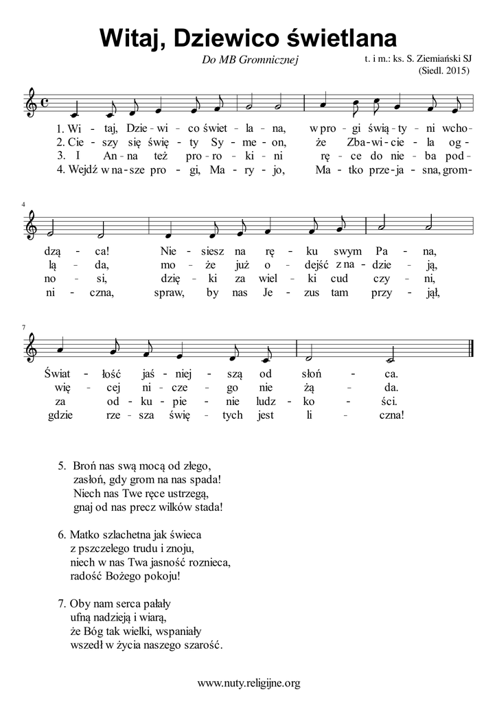 Witaj, Dziewico świetlana t. i m.: ks. S. Ziemiański SJ (Siedl. 2015) Do MB Gromnicznej taj, 1. Wi 2. Cie szy 3. I An 4. Wejdź w na Dzie wi się świę na też sze pro co świet ty Sy pro ro gi, Ma la me ki ry na, on, ni jo, w pro gi świą ty że Zba wi cie rę ce do nie Ma tko prze ja ni wcho la og ba pod sna, grom 4 dzą lą no ni ca! da, si, czna, Nie mo dzię spraw, siesz że ki by na rę już o za wiel nas Je ku swym Pa dejść z na dzie ki cud czy zus tam przy szą go nie tych od nie ludz jest słoń żą ko li ca. da. ści. czna! 7 Świat wię za gdzie łość cej od rze jaś ni ku sza niej cze pie świę 5. Broń nas swą mocą od złego, zasłoń, gdy grom na nas spada! Niech nas Twe ręce ustrzegą, gnaj od nas precz wilków stada! 6. Matko szlachetna jak świeca z pszczelego trudu i znoju, niech w nas Twa jasność roznieca, radość Bożego pokoju! 7. Oby nam serca pałały ufną nadzieją i wiarą, że Bóg tak wielki, wspaniały wszedł w życia naszego szarość. www.nuty.religijne.org na, ją, ni, jął,