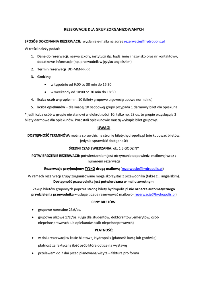 REZERWACJE DLA GRUP ZORGANIZOWANYCH SPOSÓB DOKONANIA REZERWACJI: wysłanie e-maila na adres [email protected] W treści należy podać: 1. Dane do rezerwacji: nazwa szkoły, instytucji itp. bądź imię i nazwisko oraz nr kontaktowy, dodatkowe informacje (np. przewodnik w języku angielskim) 2. Termin rezerwacji DD-MM-RRRR 3. Godzinę: w tygodniu od 9:00 co 30 min do 16:30 w weekendy od 10:00 co 30 min do 18:30 4. liczba osób w grupie min. 10 (bilety grupowe ulgowe/grupowe normalne) 5. liczba opiekunów – dla każdej 10 osobowej grupy przypada 1 darmowy bilet dla opiekuna * jeśli liczba osób w grupie nie stanowi wielokrotności 10, tylko np. 28 os. to grupie przysługują 2 bilety darmowe dla opiekunów. Pozostali opiekunowie muszą wykupić bilet grupowy. UWAGI DOSTĘPNOŚĆ TERMINÓW: można sprawdzić na stronie bilety.hydropolis.pl (nie kupować biletów, jedynie sprawdzić dostępność) ŚREDNI CZAS ZWIEDZANIA: ok. 1,5 GODZINY POTWIERDZENIE REZERWACJI: potwierdzeniem jest otrzymanie odpowiedzi mailowej wraz z numerem rezerwacji Rezerwacje przyjmujemy TYLKO drogą mailową ([email protected]) W ramach rezerwacji grupy zorganizowane mogą skorzystać z przewodnika (także z j. angielskim). Dostępność przewodnika jest potwierdzana w mailu zwrotnym. Zakup biletów grupowych poprzez stronę bilety.hydropolis.pl nie oznacza automatycznego przydzielenia przewodnika – usługę trzeba rezerwować mailowo ([email protected]) CENY BILETÓW: grupowe normalne 23zł/os. grupowe ulgowe 17zł/os. (ulga dla studentów, doktorantów ,emerytów, osób niepełnosprawnych lub opiekunów osób niepełnosprawnych) PŁATNOŚĆ: w dniu rezerwacji w kasie biletowej Hydropolis (płatność kartą lub gotówką) płatność za faktyczną ilość osób która dotrze na wystawę przelewem do 7 dni przed planowaną wizytą – faktura pro forma