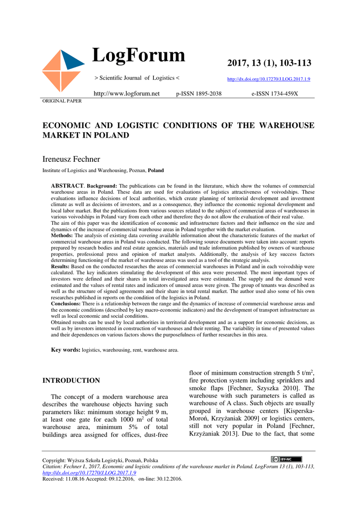 Citation: Fechner I., 2017, Economic and logistic conditions of the warehouse market in Poland. LogForum 13 (1), 103-113,