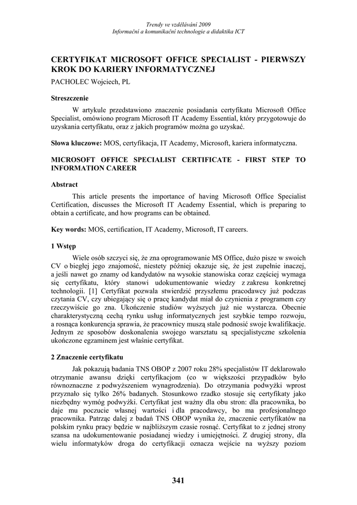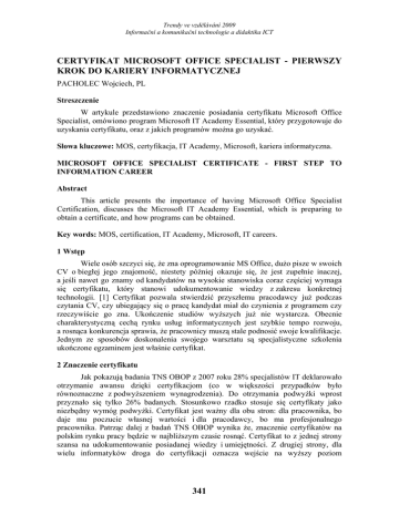 Trendy ve vzdělávání 2009 Informační a komunikační technologie a didaktika ICT CERTYFIKAT MICROSOFT OFFICE SPECIALIST - PIERWSZY KROK DO KARIERY INFORMATYCZNEJ PACHOLEC Wojciech, PL Streszczenie W artykule przedstawiono znaczenie posiadania certyfikatu Microsoft Office Specialist, omówiono program Microsoft IT Academy Essential, który przygotowuje do uzyskania certyfikatu, oraz z jakich programów można go uzyskać. Słowa kluczowe: MOS, certyfikacja, IT Academy, Microsoft, kariera informatyczna. MICROSOFT OFFICE SPECIALIST CERTIFICATE - FIRST STEP TO INFORMATION CAREER Abstract This article presents the importance of having Microsoft Office Specialist Certification, discusses the Microsoft IT Academy Essential, which is preparing to obtain a certificate, and how programs can be obtained. Key words: MOS, certification, IT Academy, Microsoft, IT careers. 1 Wstęp Wiele osób szczyci się, że zna oprogramowanie MS Office, dużo pisze w swoich CV o biegłej jego znajomość, niestety później okazuje się, że jest zupełnie inaczej, a jeśli nawet go znamy od kandydatów na wysokie stanowiska coraz częściej wymaga się certyfikatu, który stanowi udokumentowanie wiedzy z zakresu konkretnej technologii. [1] Certyfikat pozwala stwierdzić przyszłemu pracodawcy już podczas czytania CV, czy ubiegający się o pracę kandydat miał do czynienia z programem czy rzeczywiście go zna. Ukończenie studiów wyższych już nie wystarcza. Obecnie charakterystyczną cechą rynku usług informatycznych jest szybkie tempo rozwoju, a rosnąca konkurencja sprawia, że pracownicy muszą stale podnosić swoje kwalifikacje. Jednym ze sposobów doskonalenia swojego warsztatu są specjalistyczne szkolenia ukończone egzaminem jest właśnie certyfikat. 2 Znaczenie certyfikatu Jak pokazują badania TNS OBOP z 2007 roku 28% specjalistów IT deklarowało otrzymanie awansu dzięki certyfikacjom (co w większości przypadków było równoznaczne z podwyższeniem wynagrodzenia). Do otrzymania podwyżki wprost przyznało się tylko 26% badanych. Stosunkowo rzadko stosuje się certyfikaty jako niezbędny wymóg podwyżki. Certyfikat jest ważny dla obu stron: dla pracownika, bo daje mu poczucie własnej wartości i dla pracodawcy, bo ma profesjonalnego pracownika. Patrząc dalej z badań TNS OBOP wynika że, znaczenie certyfikatów na polskim rynku pracy będzie w najbliższym czasie rosnąć. Certyfikat to z jednej strony szansa na udokumentowanie posiadanej wiedzy i umiejętności. Z drugiej strony, dla wielu informatyków droga do certyfikacji oznacza wejście na wyższy poziom 341 Trendy ve vzdělávání 2009 Informační a komunikační technologie a didaktika ICT zawodowy. Podejście do egzaminu poprzedzone jest długotrwałymi przygotowaniami, przebyciem specjalistycznych kursów oraz zapoznaniem się z fachową literaturą. Efektem mozolnej pracy jest podwyższenie kwalifikacji, a im wyższe kwalifikacje, tym lepsza pozycja na rynku IT.[1] 3 Korzyści z certyfikatu Microsoft Office Specialist Certyfikat Microsoft Office Specialist (specjalisty Microsoft Office) to uznawane na całym świecie zaświadczenie umiejętności obsługi programów merytorycznych z serii Microsoft Office na poziomie eksperckim. Poniżej chciałbym przedstawić informacje o korzyściach płynących z tego certyfikatu dla poszczególnych osób, przedsiębiorstw i placówek naukowych. Korzyści dla osób fizycznych Zdobycie certyfikatu poświadcza umiejętność pracy z programami z rodziny Microsoft Office. Osoby z takim certyfikatem posiadają eksperckie kompetencje i wyższą wydajność i cieszą się większym poważaniem wśród pracodawców, kolegów z pracy i klientów. Dzięki certyfikatowi Office Specialist pracownik może czerpać większą satysfakcję z pracy i robi krok naprzód w karierze, wychodząc daleko przed konkurentów i zyskując szansę na awans bądź otrzymanie atrakcyjniejszej oferty. Korzyści dla przedsiębiorstw Przedsiębiorcy zachęcający swoich pracowników do zdobycia certyfikatu Office Specialist i zatrudniający takich specjalistów w swojej firmie są zadowoleni z wysokiego poziomu kompetencji i wydajności specjalistów Office. Wprowadzenie wymogu posiadania przez pracowników na określonych stanowiskach certyfikatu Office Specialist ułatwia również proces rekrutacji, umożliwiając szybkie określenie, którzy z kandydatów dysponują umiejętnościami umożliwiającymi wydajną pracę od pierwszego dnia. Pracodawcy inwestujący w certyfikaty Office Specialist dla swoich pracowników uzyskują szybki zwrot kosztów egzaminów i szkoleń. Inwestycje takie powodują wzrost morale, pewności siebie i wydajności zatrudnionych, oraz pozytywnie wpływają na wyniki firmy. Jak można wyczytać z niezależnego badania przeprowadzonego wśród uczestników programu Office Specialist wyniki wskazują, że zdobycie certyfikatu specjalisty Office poprawia kompetencje, wydajność i wiarygodność pracownika: − Do 87 procent pracodawców zauważyło wyższy poziom kompetencji pracowników z certyfikatem Office Specialist. − Do 83 procent pracodawców uważa, że ich pracownicy z certyfikatem Office Specialist są bardziej wydajni. − Do 77 procent pracodawców uważa, że zdobycie certyfikatu Office Specialist zwiększa wiarygodność pracownika wśród kolegów z pracy. − Do 74 procent pracodawców uważa, że zdobycie certyfikatu Office Specialist zwiększa wiarygodność pracownika wśród klientów. − Do 82 procent pracodawców sądzi, że certyfikaty Office Specialist bezpośrednio przynoszą korzyść firmie. − Do 67 procent pracodawców uważa że certyfikaty Office Specialist ułatwiają rekrutację i decyzje dotyczące awansu. Korzyści dla placówek naukowych Umieszczenie w ofercie dla uczniów bądź studentów możliwości uzyskania certyfikatu Office Specialist pozwala im zdobyć uznawane międzynarodowo 342 Trendy ve vzdělávání 2009 Informační a komunikační