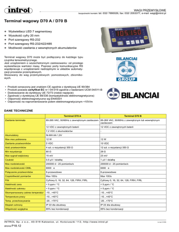 bezpośredni kontakt: WAGI PRZEMYSŁOWE tel. 032/ 7890026, fax: 032/ 2053377, e-mail: [email protected] Terminal wagowy D70 A / D70 B ● ● ● ● ● Wyświetlacz LED 7 segmentowy Wysokość cyfry 20 mm Port szeregowy RS-232 Port szeregowy RS-232/422/485 Możliwość zasilania z wewnętrznych akumulatorów Terminal wagowy D70 może być podłączany do każdego typu czujnika tensometrycznego. Jest urządzeniem o wszechstronnym zastosowaniu: od prostego wyświetlacza wartości masy. Poprzez porty komunikacyjne RS współpracuje z urządzeniami nadrzędnymi w układów automatyzacji procesów przemysłowych. Stosowany do wag przemysłowych: pomostowych, zbiornikowych. • • • • • • Produkt oznaczony jest znakiem CE zgodnie z dyrektywą UE 90/384 Produkt posiada certyfikat EC nr I 04-019 zgodnie z badaniami UCM 04/011-B Dostosowanie do dyrektywy UE 72/73 (niskie napięcie) Zgodność z dyrektywą UE 89/336 (kompatybilność elektromagnetyczna) Odporność elektromagnetyczna wg EN45501 Odporność na napromieniowanie polem elektromagnetycznym <10V/m DANE TECHNICZNE Terminal D70 A Zasilanie terminala Terminal D70 B 85-265 VAC, 50/60Hz z zewnętrznym zasilaczem 85-265 VAC, 50/60Hz z zewnętrznym lub wewnętrznym zasilaczem 12 VDC z zewnętrznych baterii 12 VDC z zewnętrznych baterii 7,2 VDC z akumulatorów - Akumulatory Ni-MH AA 1,5V Max moc pobierana 12 W 12 W Zasilanie przetworników 5 VDC 10 VDC Ilość przetworników 4 szt. o rezystancji 350 Ω 12 szt. o rezystancji 350 Ω Min rezystancja 80 Ω 29 Ω Max sygnał wejściowy 15 mV 23 mV Czułość 0,5 μV / działkę 1 μV / działkę Max rozdzielczość 200000 d - 25 pomiarów/s 200000 d - 25 pomiarów/s Max rozdzielczość OIML 6000 e 6000 e Połączenie przetworników 6-przewodowe 6-przewodowe Częstotliwość pomiarów Max 100/s Max 100/s Filtr Cyfrowy 0, 16, 32, 64, 128, FIRH, FIRL Cyfrowy 0, 16, 32, 64, 128, FIRH, FIRL Stabilność zera < 5 ppm / °C < 5 ppm / °C Stabilność zakresu < 5 ppm / °C < 5 ppm / °C Skompensowany zakres temperatur -10...+40°C -10...+40°C Temperatura pracy -10...+40°C -10...+40°C Temp. przechowywania -20...+70°C -20...+70°C Stopień ochrony IP 22 dla obudowy IP 22 dla obudowy Wilgotność względna 85% bez kondensacji 85% bez kondensacji INTROL Sp. z o.o., 40-519 Katowice, ul. Ko ściusz ki 112, http://www.in trol.pl strona P18.12 k-t ed. 01/05 WAGI PRZEMYSŁOWE bezpośredni kontakt: tel. 032/ 7890026, fax: 032/ 2053377, e-mail: [email protected] Terminal D70 A Terminal D70 B Port szeregowy 1 × RS 232 1 × RS 232 Port szeregowy wybierany 1 × RS 232/422/485 1 × RS 232/422/485 Szybkość transmisji 115200 115200 Dokładność wyjścia analogowego 0,05% Rozdzielczość wyjścia analogowego 10000 punktów Wyjście analogowe 0-10 V 0 (4)-20 mA min 100 kΩ max 250 Ω Klawiatura Foliowa 7 przycisków Foliowa 7 przycisków Masa własna 0,650 kg 0,800 kg z wewnętrznymi akumulatorami 0,650 kg 0,750 kg z wewnętzrnym zasilaczem REALIZOWANE FUNKCJE • • • • • • • • • • • • • • Zabudowa terminala: pulpitowa i panelowa (uchwyty w wyposażeniu standardowym) Zegar Wybór jasności wyświetlacza Autotest systemu po włączeniu zasilania Zerowanie Tara automatyczna Tara wpisana z klawiatury Transmisja wartości wagi Automatyczne przejście w stan czuwania Wyświetlanie parametrów ładowania akumulatorów (model D70 A) Przypisanie używanych funkcji wagi do portu szeregowego Kalibracja: pełna, tylko zera wagi, z linearyzacją, odwrotna Korekta wartości wskazań po kalibracji w zakresie ±1% zakresu pomiarowego Korekta wskazań uwzględniająca położenie geograficzne OPCJE • Zasilacz 12 V • Akumulatory, ładowarka • Uchwyt do montażu ściennego WYMIARY Terminal D70 w zabudowie panelowej • Wymiar „223 mm” dotyczy miejsca w płycie przy zabudowie panelowej • Otwór pod zabudowę panelową posiada wymiary 200 × 104 mm k-t ed. 01/05 INTROL Sp. z o.o., 40-519 Katowice, ul. Ko ściusz ki 112, http://www.in trol.pl strona P18.13 bezpośredni kontakt: WAGI PRZEMYSŁOWE tel. 032/ 7890026, fax: 032/ 2053377, e-mail: [email protected] Terminal D70 w zabudowie stołowej Terminal D70 w zabudowie ściennej INTROL Sp. z o.o., 40-519 Katowice, ul. Ko ściusz ki 112, http://www.in trol.pl strona P18.14 k-t ed. 01/05