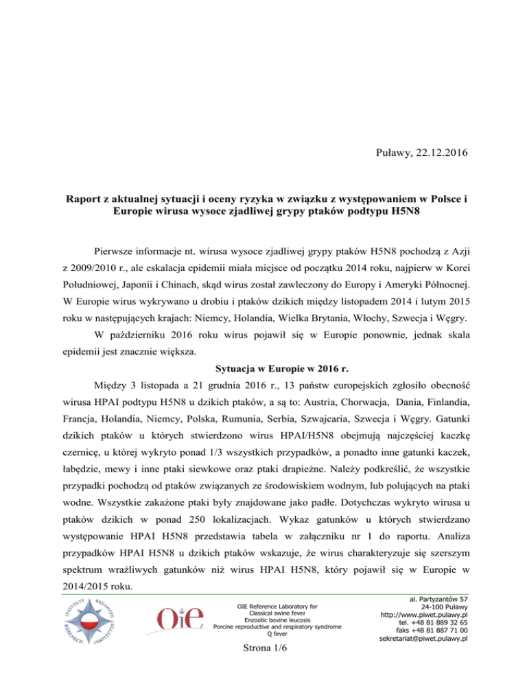 Puławy, 22.12.2016 Raport z aktualnej sytuacji i oceny ryzyka w związku z występowaniem w Polsce i Europie wirusa wysoce zjadliwej grypy ptaków podtypu H5N8 Pierwsze informacje nt. wirusa wysoce zjadliwej grypy ptaków H5N8 pochodzą z Azji z 2009/2010 r., ale eskalacja epidemii miała miejsce od początku 2014 roku, najpierw w Korei Południowej, Japonii i Chinach, skąd wirus został zawleczony do Europy i Ameryki Północnej. W Europie wirus wykrywano u drobiu i ptaków dzikich między listopadem 2014 i lutym 2015 roku w następujących krajach: Niemcy, Holandia, Wielka Brytania, Włochy, Szwecja i Węgry. W październiku 2016 roku wirus pojawił się w Europie ponownie, jednak skala epidemii jest znacznie większa. Sytuacja w Europie w 2016 r. Między 3 listopada a 21 grudnia 2016 r., 13 państw europejskich zgłosiło obecność wirusa HPAI podtypu H5N8 u dzikich ptaków, a są to: Austria, Chorwacja, Dania, Finlandia, Francja, Holandia, Niemcy, Polska, Rumunia, Serbia, Szwajcaria, Szwecja i Węgry. Gatunki dzikich ptaków u których stwierdzono wirus HPAI/H5N8 obejmują najczęściej kaczkę czernicę, u której wykryto ponad 1/3 wszystkich przypadków, a ponadto inne gatunki kaczek, łabędzie, mewy i inne ptaki siewkowe oraz ptaki drapieżne. Należy podkreślić, że wszystkie przypadki pochodzą od ptaków związanych ze środowiskiem wodnym, lub polujących na ptaki wodne. Wszystkie zakażone ptaki były znajdowane jako padłe. Dotychczas wykryto wirusa u ptaków dzikich w ponad 250 lokalizacjach. Wykaz gatunków u których stwierdzano występowanie HPAI H5N8 przedstawia tabela w załączniku nr 1 do raportu. Analiza przypadków HPAI H5N8 u dzikich ptaków wskazuje, że wirus charakteryzuje się szerszym spektrum wrażliwych gatunków niż wirus HPAI H5N8, który pojawił się w Europie w 2014/2015 roku. OIE Reference Laboratory for Classical swine fever Enzootic bovine leucosis Porcine reproductive and respiratory syndrome Q fever Strona 1/6 al. Partyzantów 57 24-100 Puławy http://www.piwet.pulawy.pl tel. +48 81 889 32 65 faks +48 81 887 71 00 [email protected] W ośmiu krajach potwierdzono obecność wirusa HPAI/H5N8 u drobiu: na Węgrzech, w Niemczech, Austrii, Szwecji, Danii, Holandii, Francji, i w Polsce. Ogółem zdiagnozowano ponad 160 ognisk tej choroby. Wirus stwierdzany jest zarówno u drobiu utrzymywanego w systemie przyzagrodowym jak i chowie fermowym. Zazwyczaj stwierdzenie wirusa u drobiu było poprzedzone jego wykryciem w populacji dzikiej. Do zakażenia drobiu dochodzi przez kontakt bezpośredni z ptactwem dzikim, lub pośredni, przez użytkowanie zbiorników wodnych lub obszarów, na których znajdują się odchody dzikich ptaków. W szerzeniu się zakażeń pomiędzy fermami drobiu dużą rolę odgrywa człowiek, gdyż wirus łatwo przenosi się na odzieży, sprzęcie czy środkach transportu. Opis sytuacji w Polsce W dniach 4.11. – 21.12. rozpoznano w Polsce 8 ognisk HPAI H5N8 u drobiu i 4 wystąpienia zakażeń tym wirusem u ptaków dzikich (Ryc. 1). Ryc. 1 Lokalizacja wystąpień HPAI H5N8 u drobiu i dzikich ptaków w Polsce (stan na 21.12.2016) W województwie lubuskim ogniska choroby dotyczą drobiu utrzymywanego w chowie fermowym (indyki i gęsi). W województwie podkarpackim i małopolskim wirus wykryto u drobiu w chowie przyzagrodowym. Objawy kliniczne u drobiu obejmują spadek pobierania paszy i wody, duszność, apatię, zapalenie spojówek i zwiększoną śmiertelność. Wirus u padłych dzikich ptaków wykrywany był w województwie zachodniopomorskim w powiatach Strona 2/6 goleniowskim i świnoujskim (dzikie kaczki, mewa srebrzysta) oraz w województwie mazowieckim w powiecie otwockim (łabędź niemy). Badania pokrewieństwa filogenetycznego w oparciu o cały gen hemaglutyniny (H5) wskazują na: - stosunkowo dużą odrębność genetyczną w stosunku do wirusów wykrywanych w Europie w 2014/2015 r., co wskazuje, że obecna sytuacja nie jest bezpośrednią kontynuacją zdarzeń sprzed 2 lat - najbliższe pokrewieństwo (choć nie identyczność) w stosunku do wirusów wykrywanych w 2016 r. u dzikich kaczek, rybitw, perkozów, czapli i mewy w okolicach jeziora Uws-nur na pograniczu Mongolii i Rosji (Ryc. 2). Ryc. 2 Pokrewieństwo filogenetyczne wirusów grypy ptaków podtypu H5N8 wykrywanych w ostatnich latach w Polsce Wirus HPAI należący do podtypu H5N8 powstał w efekcie tzw. reasortacji, czyli wymieszania się segmentów genomu pochodzących od różnych wirusów „rodzicielskich” zakażających jednocześnie organizm ptaka. Gen hemaglutyniny (HA) wywodzi się od wirusa HPAI/H5N1 „azjatyckiego” z tzw. kladu genetycznego 2.3.4.4, a pierwotnym źródłem pozostałych genów są inne wirusy grypy ptaków o niskiej zjadliwości. Strona 3/6 Mechanizm reasortacji genetycznej przedstawia poniższy schemat: Zagrożenie zdrowia człowieka Jak dotychczas nie stwierdzono na świecie ani jednego przypadku zakażenia wirusem HPAI/H5N8 u człowieka i w chwili obecnej nie ma podstaw do wprowadzania ponadstandardowych środków prewencyjnych w odniesieniu do ludzi. Przeprowadzone w PIWet-PIB w Puławach wstępne badania genetyczne wirusa H5N8 wykrytego w Polsce nad tzw. molekularnymi wskaźnikami przystosowania do organizmu ludzi, wskazują na typowy profil charakterystyczny dla wirusów ptasich i brak głównych cech przystosowawczych do organizmu człowieka. Identyczny wniosek został sformułowany przez wspólnotowe laboratorium referencyjne UE Weybridge, Wielka Brytania, na podstawie badań izolatu węgierskiego i polskiego. Biorąc jednak pod uwagę ewolucyjne pochodzenie wirusów H5N8 od H5N1 oraz generalnie dużą zmienność wirusów grypy, wskazana jest pewna ostrożność, szczególnie u osób zawodowo mających kontakt z drobiem i ptakami dzikimi. Zaleca się stosowanie rutynowych zasad higieny, takich jak mycie rąk ciepłą wodą z mydłem oraz unikanie bezpośredniego kontaktu z drobiem chorym, padłym ptactwem dzikim oraz przedm