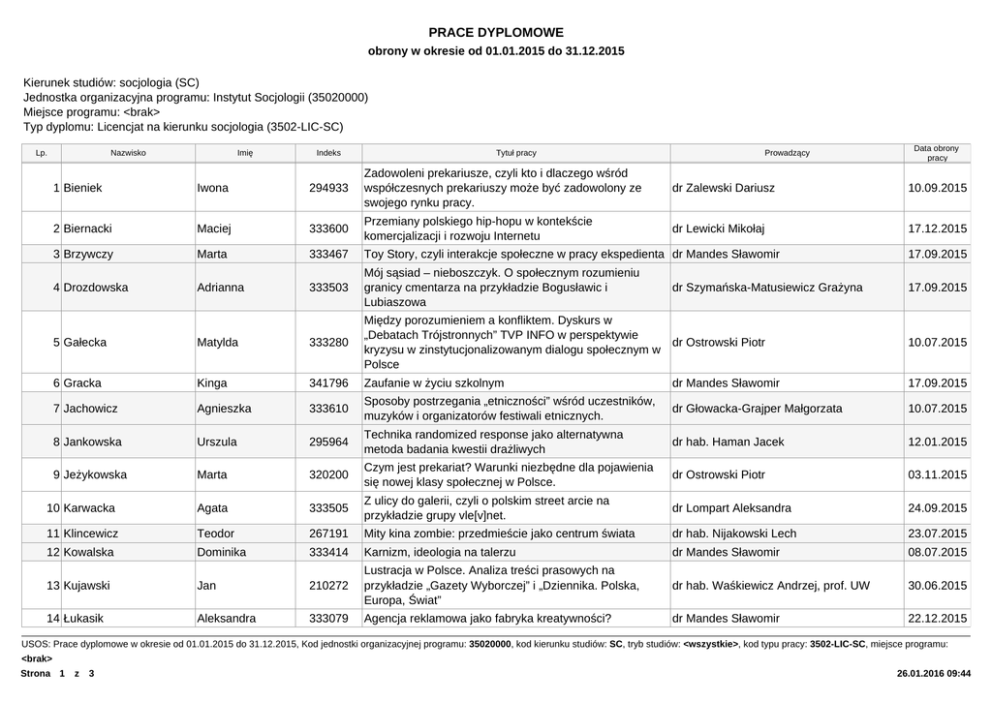 Prace licencjackie 2015 - Instytut Socjologii UW