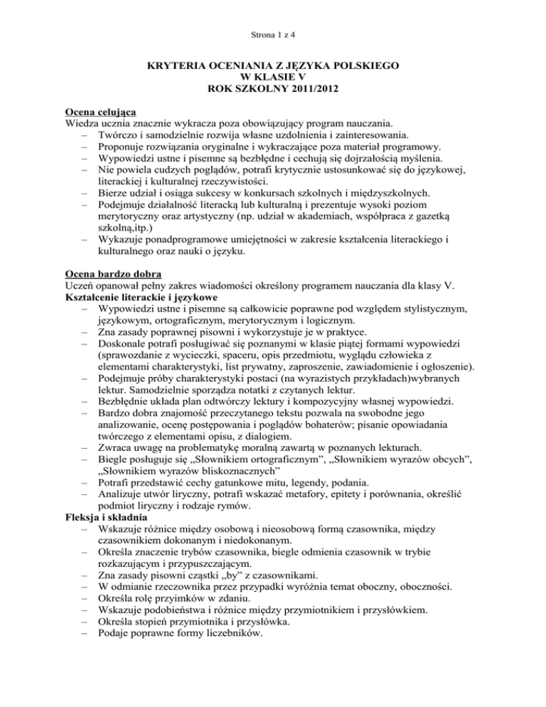 Strona 1 z 4 KRYTERIA OCENIANIA Z JĘZYKA POLSKIEGO W KLASIE V ROK SZKOLNY 2011/2012 Ocena celująca Wiedza ucznia znacznie wykracza poza obowiązujący program nauczania. – Twórczo i samodzielnie rozwija własne uzdolnienia i zainteresowania. – Proponuje rozwiązania oryginalne i wykraczające poza materiał programowy. – Wypowiedzi ustne i pisemne są bezbłędne i cechują się dojrzałością myślenia. – Nie powiela cudzych poglądów, potrafi krytycznie ustosunkować się do językowej, literackiej i kulturalnej rzeczywistości. – Bierze udział i osiąga sukcesy w konkursach szkolnych i międzyszkolnych. – Podejmuje działalność literacką lub kulturalną i prezentuje wysoki poziom merytoryczny oraz artystyczny (np. udział w akademiach, współpraca z gazetką szkolną,itp.) – Wykazuje ponadprogramowe umiejętności w zakresie kształcenia literackiego i kulturalnego oraz nauki o języku. Ocena bardzo dobra Uczeń opanował pełny zakres wiadomości określony programem nauczania dla klasy V. Kształcenie literackie i językowe – Wypowiedzi ustne i pisemne są całkowicie poprawne pod względem stylistycznym, językowym, ortograficznym, merytorycznym i logicznym. – Zna zasady poprawnej pisowni i wykorzystuje je w praktyce. – Doskonale potrafi posługiwać się poznanymi w klasie piątej formami wypowiedzi (sprawozdanie z wycieczki, spaceru, opis przedmiotu, wyglądu człowieka z elementami charakterystyki, list prywatny, zaproszenie, zawiadomienie i ogłoszenie). – Podejmuje próby charakterystyki postaci (na wyrazistych przykładach)wybranych lektur. Samodzielnie sporządza notatki z czytanych lektur. – Bezbłędnie układa plan odtwórczy lektury i kompozycyjny własnej wypowiedzi. – Bardzo dobra znajomość przeczytanego tekstu pozwala na swobodne jego analizowanie, ocenę postępowania i poglądów bohaterów; pisanie opowiadania twórczego z elementami opisu, z dialogiem. – Zwraca uwagę na problematykę moralną zawartą w poznanych lekturach. – Biegle posługuje się „Słownikiem ortograficznym”, „Słownikiem wyrazów obcych”, „Słownikiem wyrazów bliskoznacznych” – Potrafi przedstawić cechy gatunkowe mitu, legendy, podania. – Analizuje utwór liryczny, potrafi wskazać metafory, epitety i porównania, określić podmiot liryczny i rodzaje rymów. Fleksja i składnia – Wskazuje różnice między osobową i nieosobową formą czasownika, między czasownikiem dokonanym i niedokonanym. – Określa znaczenie trybów czasownika, biegle odmienia czasownik w trybie rozkazującym i przypuszczającym. – Zna zasady pisowni cząstki „by” z czasownikami. – W odmianie rzeczownika przez przypadki wyróżnia temat oboczny, oboczności. – Określa rolę przyimków w zdaniu. – Wskazuje podobieństwa i różnice między przymiotnikiem i przysłówkiem. – Określa stopień przymiotnika i przysłówka. – Podaje poprawne formy liczebników. Strona 2 z 4 – Klasyfikuje rodzaje wypowiedzeń, podaje ich przykłady. – Wyróżnia w zdaniu zespoły składniowe i nazywa je. – Nazywa części zdania, wskazuje sposób ich wyrażenia. – Układa zdanie pojedyncze rozwinięte według podanego wykresu. – Przeprowadza klasyfikację zdań złożonych. Fonetyka – Wskazuje różnicę między samogłoską i spółgłoską. – Omawia zależność brzmienia głoski od ruchów i pozycji narządów mowy. – Podaje zasady akcentowania wyrazów w języku polskim oraz zasady wymawiania wyrazów bezakcentowych. Ocena dobra Uczeń opanował wiadomości i umiejętności przewidziane podstawą programową oraz wybrane elementy przewidziane programem nauczania w klasie piątej. Kształcenie literackie, kulturalne i językowe – Czyta poprawnie, stosując zasady prawidłowej intonacji i akcentowania. – Jego wypowiedzi ustne i pisemne mogą zawierać jedynie nieliczne błędy językowe, stylistyczne, logiczne i ortograficzne. – Potrafi samodzielnie poprawić większość własnych błędów. – Podejmuje próby wypowiadania się w formach trudniejszych niż określone podstawą programową (opowiadanie twórcze, opis postaci z elementami charakterystyki). – W wypowiedziach próbuje oceniać i wartościować problemy, zjawiska dotyczące języka, literatury oraz kultury. – Nazywa cechy gatunkowe mitu, legendy, bajki, noweli. – Poprawnie sporządza plan ramowy i szczegółowy lektury. Fleksja i składnia – Określa formę gramatyczną czasowników. – Stosuje w zdaniu czasownik w formie osobowej i nieosobowej. – Tworzy czasownik dokonany od niedokonanego, wyróżnia cząstkę, za pomocą której tworzy ten czasownik. – Omawia budowę form trybu rozkazującego i przypuszczającego. – Wyjaśnia różnice w odmianie pozostałych rzeczowników, wyodrębnia temat i końcówkę. – Uzasadnia pisownię rzeczownika, odwołując się do odmiany. – W zdaniu wskazuje przyimki i wyrażenia przyimkowe, nazywa ich rolę. – Tworzy przysłówki od przymiotników, stosuje je w zdaniach i określa ich rolę. – Określa formę gramatyczną przymiotnika z rzeczownikiem. – Zastępuje słowem liczebniki podane cyfrą i odwrotnie. – Stosuje w zdaniu liczebnik zbiorowy w odpowiednim przypadku. – Przekształca zdanie na równoważnik zdania i odwrotnie. – Rozpoznaje i nazywa rodzaje wypowiedzeń – pojedyncze, złożone, zdania, równoważniki zdań; typy wypowiedzeń – oznajmujące, rozkazujące, wykrzyknikowe – Przedstawia za pomocą wykresu budowę zdania pojedynczego rozwiniętego (na łatwych przykładach) – Przekształca zdanie pojedyncze na złożone i odwrotnie. Fonetyka – Określa cechy głoski. – Rozpoznaje wyrazy bezakcentowe. – Poprawnie akcentuje wyrazy na 3. i 4. sylabie od końca. Strona 3 z 4 Ocena dostateczna Uczeń w zakresie umożliwiającym postępy w dalszym uczeniu się, opanował wiedzę i umiejętności zawarte w podstawie programowej klasy piątej. Kształcenie literackie i językowe – W wypowie