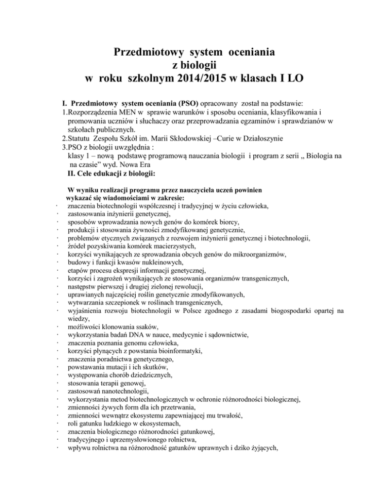 Przedmiotowy system oceniania z biologii w roku szkolnym 2014/2015 w klasach I LO I. Przedmiotowy system oceniania (PSO) opracowany został na podstawie: 1.Rozporządzenia MEN w sprawie warunków i sposobu oceniania, klasyfikowania i promowania uczniów i słuchaczy oraz przeprowadzania egzaminów i sprawdzianów w szkołach publicznych. 2.Statutu Zespołu Szkół im. Marii Skłodowskiej –Curie w Działoszynie 3.PSO z biologii uwzględnia : klasy 1 – nową podstawę programową nauczania biologii i program z serii „ Biologia na na czasie” wyd. Nowa Era II. Cele edukacji z biologii: · · · · · · · · · · · · · · · · · · · · · · · · · · · · · · W wyniku realizacji programu przez nauczyciela uczeń powinien wykazać się wiadomościami w zakresie: znaczenia biotechnologii współczesnej i tradycyjnej w życiu człowieka, zastosowania inżynierii genetycznej, sposobów wprowadzania nowych genów do komórek biorcy, produkcji i stosowania żywności zmodyfikowanej genetycznie, problemów etycznych związanych z rozwojem inżynierii genetycznej i biotechnologii, źródeł pozyskiwania komórek macierzystych, korzyści wynikających ze sprowadzania obcych genów do mikroorganizmów, budowy i funkcji kwasów nukleinowych, etapów procesu ekspresji informacji genetycznej, korzyści i zagrożeń wynikających ze stosowania organizmów transgenicznych, następstw pierwszej i drugiej zielonej rewolucji, uprawianych najczęściej roślin genetycznie zmodyfikowanych, wytwarzania szczepionek w roślinach transgenicznych, wyjaśnienia rozwoju biotechnologii w Polsce zgodnego z zasadami biogospodarki opartej na wiedzy, możliwości klonowania ssaków, wykorzystania badań DNA w nauce, medycynie i sądownictwie, znaczenia poznania genomu człowieka, korzyści płynących z powstania bioinformatyki, znaczenia poradnictwa genetycznego, powstawania mutacji i ich skutków, występowania chorób dziedzicznych, stosowania terapii genowej, zastosowań nanotechnologii, wykorzystania metod biotechnologicznych w ochronie różnorodności biologicznej, zmienności żywych form dla ich przetrwania, zmienności wewnątrz ekosystemu zapewniającej mu trwałość, roli gatunku ludzkiego w ekosystemach, znaczenia biologicznego różnorodności gatunkowej, tradycyjnego i uprzemysłowionego rolnictwa, wpływu rolnictwa na różnorodność gatunków uprawnych i dziko żyjących, · · · · · · · · · · · · · · · · · · · · · · · · · · · · · · · · · · · · · · · · · · · · bezpośrednich dla człowieka korzyści z istniejącej różnorodności gatunkowej i genetycznej, przyczyn i skutków utraty i rozdzielania siedlisk, wprowadzania do ekosystemu gatunków obcych, konsekwencji nadmiernej eksploatacji gatunków, motywów ochrony przyrody, konsekwencji wsobności i dryfu genetycznego, prawnych form ochrony przyrody w Polsce, gorących miejsc różnorodności biologicznej, restytucji gatunków, znajomości koncepcji zrównoważonego rozwoju ludzkości, biernej i czynnej ochrony środowiska przyrodniczego, międzynarodowej współpracy w celu ochrony bioróżnorodności, podstawowych praw ochrony przyrody; wykazać się umiejętnościami w zakresie: wyjaśniania zależności przyczynowo-skutkowych między faktami, formułowania wniosków, wyrażania opinii na temat omawianych zagadnień, analizowania najważniejszych podstaw naukowych biotechnologii, zastosowań klonowania i rekombinowania DNA, dyskutowania na temat żywności GM, wykazania, dlaczego nie wyobrażamy sobie życia bez metod tradycyjnej biotechnologii, przedstawiania problemów etycznych związanych z rozwojem biotechnologii, dyskutowania na temat zagrożeń wynikających ze stosowania technik inżynierii genetycznej, tłumaczenia, jak wykorzystuje się osiągnięcia biologii molekularnej w medycynie, rolnictwie oraz ochronie bioróżnorodności i środowiska, wykazania, że odkrycie Watsona i Cricka otworzyło nową erę w badaniach naukowych, przedstawiania związku między strukturą DNA a jego funkcją, uzasadniania, że replikacja DNA umożliwia rozmnażanie się organizmów i życie na Ziemi, wykazywania różnicy między informacją genetyczną a kodem genetycznym, wyjaśniania, że transkrypcja rozpoczyna proces ekspresji informacji genetycznej, tłumaczenia, jak powstają organizmy transgeniczne, uzasadniania, że inżynieria genetyczna może pomóc w likwidacji głodu na świecie, tłumaczenia, że żywność GM jest w takim samym stopniu bezpieczna i niebezpieczna, jak każda inna żywność, wyjaśniania zastosowania komórek macierzystych w terapii wielu chorób, opisywania otrzymywania zrekombinowanej ludzkiej insuliny, oceniania zalet i wad pierwszej oraz drugiej zielonej rewolucji, uzasadniania konieczności zachowania starych odmian roślin uprawnych i ras zwierząt hodowlanych jako części różnorodności biologicznej, wykazywania, że uprawa roślin GM jest mniej uciążliwa dla środowiska, wyjaśniania, jakie metody stosuje się do tworzenia szczepionek roślinnych, omawiania korzyści wynikających z hodowli zwierząt GM, uzasadniania, dlaczego rozwój biotechnologii w Polsce powinien być zgodny z zasadami biogospodarki opartej na wiedzy, opisywania metody klonowania ssaków na przykładzie owcy Dolly, uzasadniania zakazu klonowania człowieka, przedstawiania dziedzin, w jakich stosuje się badania DNA, formułowania wniosków o doniosłości poznania genomu człowieka, wyrażania swojej opinii na temat korzyści i zagrożeń, jakie wiążą się z poznaniem genomu człowieka, · · · · · · · · · · · · · · · · · · · · · · · · · · · · · · · · · · · · · · · · · · dyskutowania o dużym znaczeniu bioinformatyki dla biotechnologii, analizowania celowości poradnictwa genetycznego, wykazywania, że mutacja jest zmianą informacji genetycznej, uzasadniania, że wiele mutagenów jest równocześnie kancerogenami, analizowania następstw 