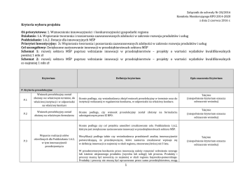 Załącznik do uchwały Nr 28/2016 Komitetu Monitorującego RPO 2014-2020 z dnia 2 czerwca 2016 r. Kryteria wyboru projektu Oś priorytetowa: 1. Wzmocnienie innowacyjności i konkurencyjności gospodarki regionu Działanie: 1.6. Wspieranie tworzenia i rozszerzania zaawansowanych zdolności w zakresie rozwoju produktów i usług Poddziałanie: 1.6.2. Dotacje dla innowacyjnych MŚP Priorytet Inwestycyjny: 3c Wspieranie tworzenia i poszerzania zaawansowanych zdolności w zakresie rozwoju produktów i usług Cel szczegółowy: Zwiększone zastosowanie innowacji w przedsiębiorstwach sektora MŚP Schemat 1: rozwój sektora MŚP poprzez wdrażanie innowacji w przedsiębiorstwie – projekty o wartości wydatków kwalifikowalnych poniżej 1 mln zł Schemat 2: rozwój sektora MŚP poprzez wdrażanie innowacji w przedsiębiorstwie – projekty o wartości wydatków kwalifikowalnych co najmniej 1 mln zł Kryterium Definicja kryterium Opis znaczenia Kryterium P.1 Wniosek preselekcyjny został złożony we właściwym terminie, do właściwej instytucji i w odpowiedzi na właściwy konkurs Ocenie podlega, czy wnioskodawca złożył wniosek preselekcyjny w terminie oraz do instytucji wskazanej w regulaminie konkursu, w odpowiedzi na właściwy konkurs. Tak/nie (niespełnienie kryterium oznacza odrzucenie wniosku) P.2 Wniosek preselekcyjny został złożony na właściwym formularzu Ocenie podlega, czy wniosek preselekcyjny został złożony na formularzu udostępnionym przez IZ RPO. P. Kryteria preselekcyjne Tak/nie (niespełnienie kryterium oznacza odrzucenie wniosku) Ocenie podlega czy cel projektu umożliwi zrealizowanie celu Poddziałania 1.6.2, którym jest zwiększone zastosowanie innowacji w przedsiębiorstwach sektora MŚP. P.3 Wsparcie realizacji celów określonych dla Poddziałania 1.6.2, w tym innowacyjność przedsięwzięcia Weryfikacji podlega także czy wnioskodawca przedstawił analizę innowacyjności potwierdzającą, że przedsięwzięcie, które zamierza zrealizować wpisuje się w definicję innowacji co najmniej w skali regionu, stosowanej krócej niż 3 lata. W przedmiotowym konkursie przez innowację należy rozumieć wdrożenie nowego lub istotnie ulepszonego produktu (wyrobu lub usługi) lub procesu. Produkty i procesy muszą być nowością co najmniej w skali regionu kujawsko-pomorskiego. Produkty i procesy nie muszą być opracowane przez samo przedsiębiorstwo, mogą 1 Tak/nie (niespełnienie kryterium oznacza odrzucenie wniosku) Załącznik do uchwały Nr 28/2016 Komitetu Monitorującego RPO 2014-2020 z dnia 2 czerwca 2016 r. być opracowane przez inne przedsiębiorstwo bądź przez jednostkę o innym 1 charakterze (np. jednostkę naukową, instytucję otoczenia biznesu) . W celu potwierdzenia rozwiązań innowacyjnych zastosowanych w projekcie wnioskodawca przedkłada stosowną opinię o innowacyjności lub spis podstaw/źródeł danych, na podstawie których określono stopień rozwiązań innowacyjnych zastosowanych w projekcie (z podaniem tytułów raportów, roczników statystycznych i dat ich wydania, adresów stron internetowych, roczników publikacji, itp. oraz wskazaniem miejsca ich dostępności w celu zweryfikowania z informacjami przedstawionymi, z zastrzeżeniem, że podstawą stwierdzenia innowacyjności nie mogą być jedynie ogólne teksty reklamowo-opisowe). Dokumentami potwierdzającymi innowacyjność mogą również być pozyskane patenty, wzory użytkowe czy zgłoszenia patentowe lub zgłoszenia wzoru użytkowego. Uzasadnienie innowacyjności powinno zawierać w szczególności: − informację, które z elementów projektu są innowacyjne, a które pełnią rolę uzupełniającą; − analizę informującą na czym polega dana innowacyjność; − porównanie nowej oferty w stosunku do podobnych produktów znajdujących się na rynku. Ocenie w tym kryterium podlegać będzie również zakres i proporcja elementów innowacyjnych w stosunku do całości projektu. Kryterium weryfikowane w oparciu o wniosek preselekcyjny. A. Kryteria Formalne A.1 Wniosek o dofinansowanie projektu został złożony we właściwym terminie i do właściwej instytucji Ocenie podlega czy wnioskodawca złożył wniosek o dofinansowanie projektu w terminie oraz do instytucji wskazanej w regulaminie konkursu, w odpowiedzi na właściwy konkurs. Tak/nie (niespełnienie kryterium oznacza odrzucenie wniosku) Kryterium weryfikowane w oparciu o wniosek o dofinansowanie projektu. A.2 Wniosek o dofinansowanie projektu został złożony na właściwym formularzu Ocenie podlega o dofinansowanie czy wnioskodawca złożył ostateczną wersję wniosku projektu w formie wydruku z generatora wniosków Tak/nie (niespełnienie kryterium oznacza odrzucenie wniosku) 1 Definicja oparta na Oslo Manual, Guidelines for Collecting and Interpreting Innovation Data, wydanie trzecie z 2005 roku, wspólna publikacja OECD (Organisation for Economic Co Operation and Development) oraz Eurostat (Statistical Office of the European Communities). 2 Załącznik do uchwały Nr 28/2016 Komitetu Monitorującego RPO 2014-2020 z dnia 2 czerwca 2016 r. o dofinansowanie projektu udostępniony przez IZ RPO. Wydruk wniosku o dofinansowanie projektu zawierający napis„ wersja próbna” nie jest ostateczną wersją wniosku o dofinansowanie projektu. Kryterium weryfikowane w oparciu o wniosek o dofinansowanie projektu. Ocenie podlega czy wnioskodawca złożył jeden projekt objęty jednym wnioskiem o dofinansowanie projektu w ramach przedmiotowego konkursu. A.3 1 wnioskodawca – 1 wniosek o dofinansowanie projektu W ramach kryterium weryfikacji podlega czy przedsiębiorstwa powiązane w rozumieniu załącznika I do rozporządzenia Komisji (UE) Nr 651/2014 z dnia 17 czerwca 2014 r. uznającego niektóre rodzaje pomocy za zgodne z rynkiem wewnętrznym w zastosowaniu art. 107 i 108 Traktatu (Dz. Urz. UE L 187 z 26.6.2014, dalej: załącznik I do GBER) złożyły maksymalnie jeden wniosek o dofinansowanie projektu. Tak/n