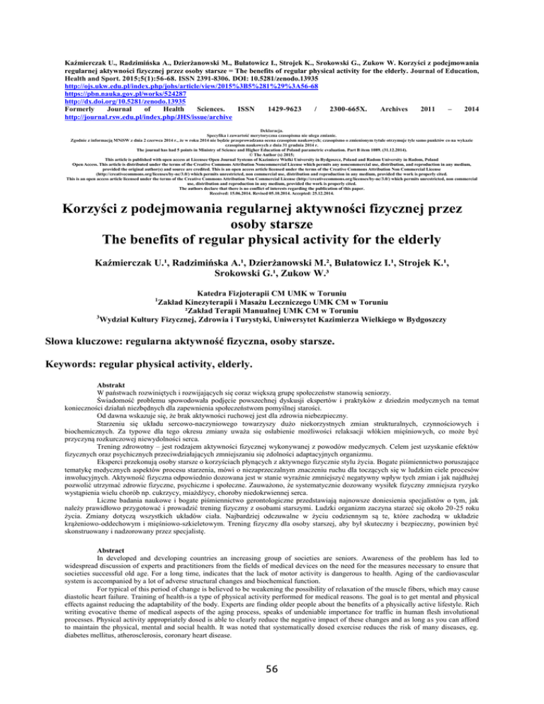Kaźmierczak U., Radzimińska A., Dzierżanowski M., Bułatowicz I., Strojek K., Srokowski G., Zukow W. Korzyści z podejmowania regularnej aktywności fizycznej przez osoby starsze = The benefits of regular physical activity for the elderly. Journal of Education, Health and Sport. 2015;5(1):56-68. ISSN 2391-8306. DOI: 10.5281/zenodo.13935 http://ojs.ukw.edu.pl/index.php/johs/article/view/2015%3B5%281%29%3A56-68 https://pbn.nauka.gov.pl/works/524287 http://dx.doi.org/10.5281/zenodo.13935 Formerly Journal of Health Sciences. ISSN 1429-9623 / 2300-665X. Archives 2011 – 2014 http://journal.rsw.edu.pl/index.php/JHS/issue/archive Deklaracja. Specyfika i zawartość merytoryczna czasopisma nie ulega zmianie. Zgodnie z informacją MNiSW z dnia 2 czerwca 2014 r., że w roku 2014 nie będzie przeprowadzana ocena czasopism naukowych; czasopismo o zmienionym tytule otrzymuje tyle samo punktów co na wykazie czasopism naukowych z dnia 31 grudnia 2014 r. The journal has had 5 points in Ministry of Science and Higher Education of Poland parametric evaluation. Part B item 1089. (31.12.2014). © The Author (s) 2015; This article is published with open access at Licensee Open Journal Systems of Kazimierz Wielki University in Bydgoszcz, Poland and Radom University in Radom, Poland Open Access. This article is distributed under the terms of the Creative Commons Attribution Noncommercial License which permits any noncommercial use, distribution, and reproduction in any medium, provided the original author(s) and source are credited. This is an open access article licensed under the terms of the Creative Commons Attribution Non Commercial License (http://creativecommons.org/licenses/by-nc/3.0/) which permits unrestricted, non commercial use, distribution and reproduction in any medium, provided the work is properly cited. This is an open access article licensed under the terms of the Creative Commons Attribution Non Commercial License (http://creativecommons.org/licenses/by-nc/3.0/) which permits unrestricted, non commercial use, distribution and reproduction in any medium, provided the work is properly cited. The authors declare that there is no conflict of interests regarding the publication of this paper. Received: 15.06.2014. Revised 05.10.2014. Accepted: 25.12.2014. Korzyści z podejmowania regularnej aktywności fizycznej przez osoby starsze The benefits of regular physical activity for the elderly Kaźmierczak U.¹, Radzimińska A.¹, Dzierżanowski M.², Bułatowicz I.¹, Strojek K.¹, Srokowski G.¹, Zukow W.³ Katedra Fizjoterapii CM UMK w Toruniu Zakład Kinezyterapii i Masażu Leczniczego UMK CM w Toruniu ²Zakład Terapii Manualnej UMK CM w Toruniu 3 Wydział Kultury Fizycznej, Zdrowia i Turystyki, Uniwersytet Kazimierza Wielkiego w Bydgoszczy 1 Słowa kluczowe: regularna aktywność fizyczna, osoby starsze. Keywords: regular physical activity, elderly. Abstrakt W państwach rozwiniętych i rozwijających się coraz większą grupę społeczeństw stanowią seniorzy. Świadomość problemu spowodowała podjęcie powszechnej dyskusji ekspertów i praktyków z dziedzin medycznych na temat konieczności działań niezbędnych dla zapewnienia społeczeństwom pomyślnej starości. Od dawna wskazuje się, że brak aktywności ruchowej jest dla zdrowia niebezpieczny. Starzeniu się układu sercowo-naczyniowego towarzyszy dużo niekorzystnych zmian strukturalnych, czynnościowych i biochemicznych. Za typowe dla tego okresu zmiany uważa się osłabienie możliwości relaksacji włókien mięśniowych, co może być przyczyną rozkurczowej niewydolności serca. Trening zdrowotny – jest rodzajem aktywności fizycznej wykonywanej z powodów medycznych. Celem jest uzyskanie efektów fizycznych oraz psychicznych przeciwdziałających zmniejszaniu się zdolności adaptacyjnych organizmu. Eksperci przekonują osoby starsze o korzyściach płynących z aktywnego fizycznie stylu życia. Bogate piśmiennictwo poruszające tematykę medycznych aspektów procesu starzenia, mówi o niezaprzeczalnym znaczeniu ruchu dla toczących się w ludzkim ciele procesów inwolucyjnych. Aktywność fizyczna odpowiednio dozowana jest w stanie wyraźnie zmniejszyć negatywny wpływ tych zmian i jak najdłużej pozwolić utrzymać zdrowie fizyczne, psychiczne i społeczne. Zauważono, że systematycznie dozowany wysiłek fizyczny zmniejsza ryzyko wystąpienia wielu chorób np. cukrzycy, miażdżycy, choroby niedokrwiennej serca. Liczne badania naukowe i bogate piśmiennictwo gerontologiczne przedstawiają najnowsze doniesienia specjalistów o tym, jak należy prawidłowo przygotować i prowadzić trening fizyczny z osobami starszymi. Ludzki organizm zaczyna starzeć się około 20-25 roku życia. Zmiany dotyczą wszystkich układów ciała. Najbardziej odczuwalne w życiu codziennym są te, które zachodzą w układzie krążeniowo-oddechowym i mięśniowo-szkieletowym. Trening fizyczny dla osoby starszej, aby był skuteczny i bezpieczny, powinien być skonstruowany i nadzorowany przez specjalistę. Abstract In developed and developing countries an increasing group of societies are seniors. Awareness of the problem has led to widespread discussion of experts and practitioners from the fields of medical devices on the need for the measures necessary to ensure that societies successful old age. For a long time, indicates that the lack of motor activity is dangerous to health. Aging of the cardiovascular system is accompanied by a lot of adverse structural changes and biochemical function. For typical of this period of change is believed to be weakening the possibility of relaxation of the muscle fibers, which may cause diastolic heart failure. Training of health-is a type of physical activity performed for medical reasons. The goal is to get mental and physical effects against reducing the adaptability of the body. Experts are finding older people about the benefits of a physically active lifestyle. Rich writing evocative theme 