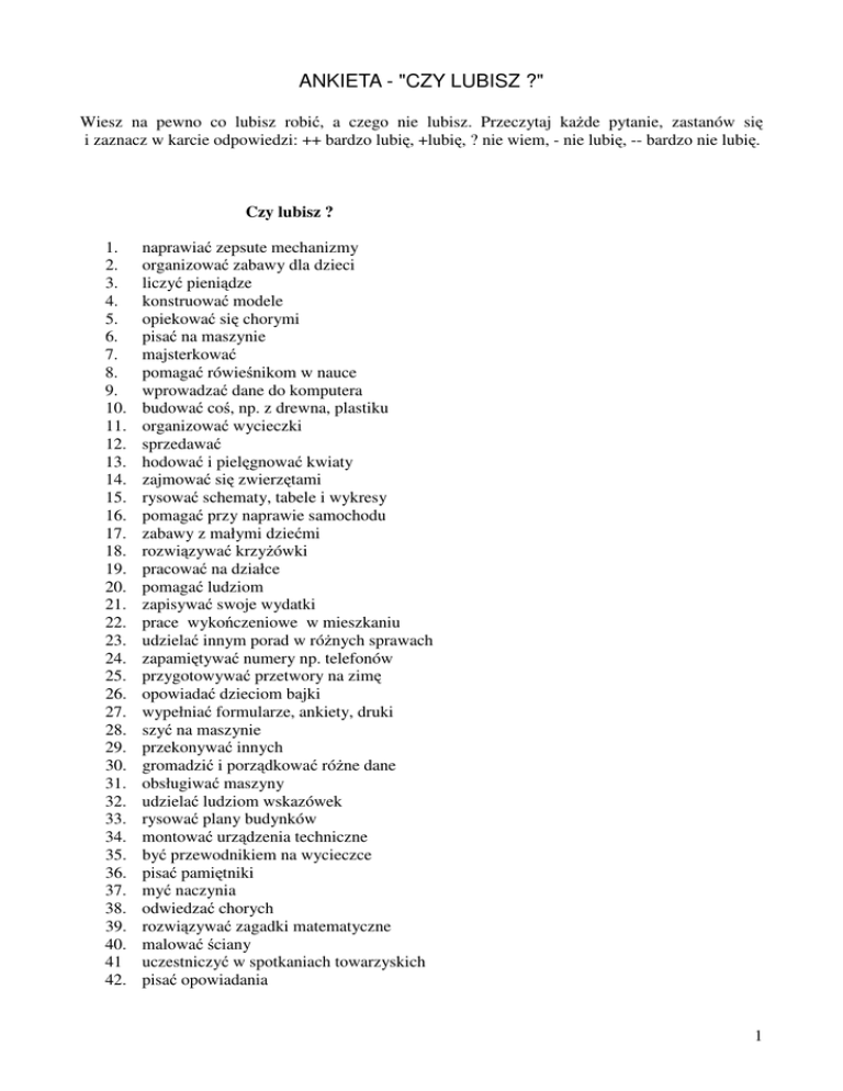 ANKIETA - "CZY LUBISZ ?" Wiesz na pewno co lubisz robi , a czego nie lubisz. Przeczytaj ka de pytanie, zastanów si i zaznacz w karcie odpowiedzi: ++ bardzo lubi , +lubi , ? nie wiem, - nie lubi , -- bardzo nie lubi . Czy lubisz ? 1. 2. 3. 4. 5. 6. 7. 8. 9. 10. 11. 12. 13. 14. 15. 16. 17. 18. 19. 20. 21. 22. 23. 24. 25. 26. 27. 28. 29. 30. 31. 32. 33. 34. 35. 36. 37. 38. 39. 40. 41 42. naprawia zepsute mechanizmy organizowa zabawy dla dzieci liczy pieni dze konstruowa modele opiekowa si chorymi pisa na maszynie majsterkowa pomaga rówie nikom w nauce wprowadza dane do komputera budowa co , np. z drewna, plastiku organizowa wycieczki sprzedawa hodowa i piel gnowa kwiaty zajmowa si zwierz tami rysowa schematy, tabele i wykresy pomaga przy naprawie samochodu zabawy z małymi dzie mi rozwi zywa krzy ówki pracowa na działce pomaga ludziom zapisywa swoje wydatki prace wyko czeniowe w mieszkaniu udziela innym porad w ró nych sprawach zapami tywa numery np. telefonów przygotowywa przetwory na zim opowiada dzieciom bajki wypełnia formularze, ankiety, druki szy na maszynie przekonywa innych gromadzi i porz dkowa ró ne dane obsługiwa maszyny udziela ludziom wskazówek rysowa plany budynków montowa urz dzenia techniczne by przewodnikiem na wycieczce pisa pami tniki my naczynia odwiedza chorych rozwi zywa zagadki matematyczne malowa ciany uczestniczy w spotkaniach towarzyskich pisa opowiadania 1 ARKUSZ ODPOWIEDZI DO ANKIETY "CZY LUBISZ ?" Rzeczy Ludzie Dane 1. 2. 3. 4. 5. 6. 7. 8. 9. 10. 11. 12. 13. 14. 15. 16. 17. 18. 19. 20. 21. 22. 23. 24. 25. 26. 27. 28. 29. 30. 31. 32. 33. 34. 35. 36. 37. 38. 39. 40. 41. 42. Razem: Razem: Razem: Dodaj do siebie w 3 kolumnach wszystkie "+" i "-", za warto bezwzgl dn wpisz na dole w kratce "Razem". Warto bezwzgl dna oznacza, e je li np. w kolumnie rzeczy otrzymałe 12 "+" i 8 "-" to wpisujesz +4 punkty. Najwa niejsz sfer dla ciebie b dzie ta, w której uzyskałe najwi cej punktów. 2
