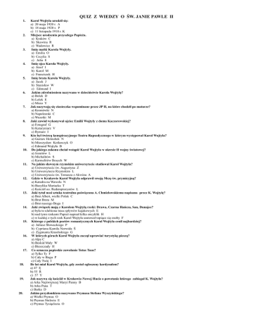 QUIZ Z WIEDZY O ŚW. JANIE PAWLE II 1. 2. 3. 4. 5. 6. 7. 8. 9. 10. 11. 12. 13. 14. 15. 16. 17. 18. 19. 20. Karol Wojtyła urodził się: a) 20 maja 1920 r. A b) 18 maja 1920 r. P c) 11 listopada 1918 r. K Miejsce urodzenia przyszłego Papieża. a) Kraków C b) Skawina R c) Wadowice R Imię matki Karola Wojtyły. a) Emilia O b) Cecylia S c) Julia E Imię ojca Karola Wojtyły. a) Józef I b) Karol M c) Franciszek H Imię brata Karola Wojtyły. a) Jacek J b) Stanisław W c) Edmund I Jakim zdrobnieniem nazywano w dzieciństwie Karola Wojtyłę? a) Bolek D b) Lolek E c) Misio Y Jak nazywają się ciasteczka wspominane przez JP II, na które chodził po maturze? a) Kremówki N b) Napoleonki C c) Wuzetki M Jaki zawód wykonywał ojciec Emilii Wojtyły z domu Kaczorowskiej? a) Fotograf G b) Kataryniarz V c) Rymarz I Kto był twórcą konspiracyjnego Teatru Rapsodycznego w którym występował Karol Wojtyła? a) Gustaw Holoubek N b) Mieczysław Kotlarczyk O c) Edmund Wojtyła B Do jakiego zakonu chciał wstąpić Karol Wojtyła w okresie II wojny światowej? a) Jezuitów L b) Michalitów S c) Karmelitów Bosych W Na jakim sławnym rzymskim uniwersytecie studiował Karol Wojtyła? a) Uniwersytecie św. Augustyna Z b) Uniwersytecie Rzymskim L c) Uniwersytecie św. Tomasza z Akwinu A Gdzie w Krakowie Karol Wojtyła odprawił swoją Mszę św. prymicyjną? a) Katedra na Wawelu N b) Bazylika Mariacka T c) Kościół oo. Redemptorystów Ł Jaki tytuł nosi sztuka teatralna poświęcona A. Chmielowskiemu napisana przez K. Wojtyłę? a) Brat Albert, wielki Polak C b) Brat Brata M c) Brat naszego Boga I Jaki związek mają z Karolem Wojtyłą rzeki: Drawa, Czarna Hańcza, San, Dunajec? a) była to ulubiona trasa spływów kajakowych E b) nad tymi rzekami Papież napisał kilka encyklik H c) w każdej z tych rzek Karol Wojtyła uratował topiące się osoby F Którego z polskich poetów romantycznych Karol Wojtyła cenił najbardziej? a) Juliusz Słowackiego P b) Cypriana Kamila Norwida Ś c) Zygmunta Krasińskiego G W których górach Karol Wojtyła zaczął uprawiać turystykę pieszą? a) Alpy C b) Beskid Mały W c) Bieszczady H Co oznacza papieskie zawołanie Totus Tuus? a) Tylko Ty F b) Cały w Bogu P c) Cały Twój I Ile lat miał Karol Wojtyła, gdy został ogłoszony kardynałem? a) 47 Ę b) 55 R c) 57 Y Jak nazywa się kościół w Krakowie-Nowej Hucie o powstanie którego zabiegał K. Wojtyła? a) Arka Najświętszej Maryi Panny B b) Arka Pana T c) Barka D Jakim przydomkiem nazywano Prymasa Stefana Wyszyńskiego? a) Wielki Prymas O b) Prymas Stulecia E c) Prymas Tysiąclecia O 21. 22. 23. 24. 25. 26. 27. 28. 29. 30. 31. 32. 33. 34. 35. 36. 37. 38. 39. 40. Dlaczego JP II nie mógł przyjechać na uroczystości pogrzebowe kard. S. Wyszyńskiego? a) z powodu rekonwalescencji po zamachu na swoje życie Ś b) Papież uczestniczył wówczas w obradach ONZ M c) Jan Paweł II udał się w zaplanowaną pielgrzymkę C Herb papieski został zaprojektowany dla JP II przez: a) Ks. Bruno Bernard Heim C b) Arturo Mari N c) Władysław Aleksander Semkowicz G Jak nazywa się polska himalaistka, która 16 X 1978 r. zdobyła Mount Everest? a) Wanda Rutkowska I b) Anna Czerwińska L c) Mirella Miriańska B Jan Paweł II w ślad za Pawłem VI zrezygnował z noszenia tiary, jak nazywa się obecnie to nakrycie głowy? a) Burka Y b) Camauro M c) Mitra J JP II udzielał uroczystego błogosławieństwa "Urbi et Orbi", co oznaczają te słowa: a) Miastu i Światu A b) Tobie i Mnie C c) Dobrym i Złym Y Jaką funkcję u boku JP II pełnił ks. Stanisław Dziwisz? a) Rzecznika prasowego Z b) Przewodniczącego Papieskiej Rady ds. Świeckich G c) Osobistego sekretarza N Jak określa się czas, w którym Stolica Apostolska pozostaje bez Papieża? a) Interregnum I b) Sede vacante A c) Interrex W Jak nazywa się kardynał pełniący funkcję tymczasowej głowy Państwa Watykańskiego? a) Kamerling P b) Dziekan Kolegium Prałatów J c) Prefekt Domu Papieskiego R JP II napisał wiele dokumentów. Jakiego koloru atramentem podpisywał encykliki? a) Czarnym K b) Niebieskim A c) Złotym M JP II spotykał się z różnymi ludźmi. Jak nazywał się prezydent ZSRR, któremu Papież udzielił audiencji w 1990 r.? a) Borys Jelcyn O b) Leonid Breżniew F c) Michaił Gorbaczow W Jak nazywa się letnia rezydencja papieży? a) Castel Gandolfo Ł b) Folgarida-Marilleva N c) Monte Bondone I Do którego państwa nie udało się JP II przybyć z oficjalną pielgrzymką? a) Burkina Faso D b) Filipiny G c) Rosja A Gdzie JP II udał się w ostatnią zagraniczną pielgrzymkę? a) Francja D b) Meksyk E c) Słowacja S Jaki gest wykonywał JP II na początku każdej pielgrzymki, wysiadając z samolotu? a) całował ziemię kraju, do którego przyjeżdżał R b) tańczył z radości Ł c) rozdawał prezenty witającym go ludziom H Na którym kontynencie żyje najwięcej katolików? a) Ameryka Południowa U b) Azja G c) Europa E Jak nazywa się włoski klasztor, który został zdobyty przez polskich żołnierzy podczas II wojny światowej? JP II odwiedził to miejsce. a) Monte Cassino G b) Monte Carlo L c) Monte Negro I Gdzie został złożony zakrwawiony pas sutanny, który papież miał na sobie w dniu zamachu? a) na Jasnej Górze I b) w Lourdes P c) w Fatimie M Pod jakim hasłem odbyła się ostatnia pielgrzymka JP II do Polski? a) Bogu dziękujcie, ducha nie gaście O b) Chrystus wczoraj, dziś i na wieki J c) Bóg bogaty w miłosierdzie E Gdzie JP II zawierzył świat Bożemu Miłosierdziu? a) we Francji W b) w krakowskich Łagiewnikach G c) w Watykanie A Trumna, w której złożono JP II została wykonana z drzewa cyprysowego. Czego symbolem jest to drzewo? a) Miłosierdzia P b) Nieśmiertelności O c) Pielgrzymek JP II na Bliski Wschód B Utwórz hasło konkursowe z liter zamieszczonych obok prawidłowych odpowiedzi od 1 do 40.