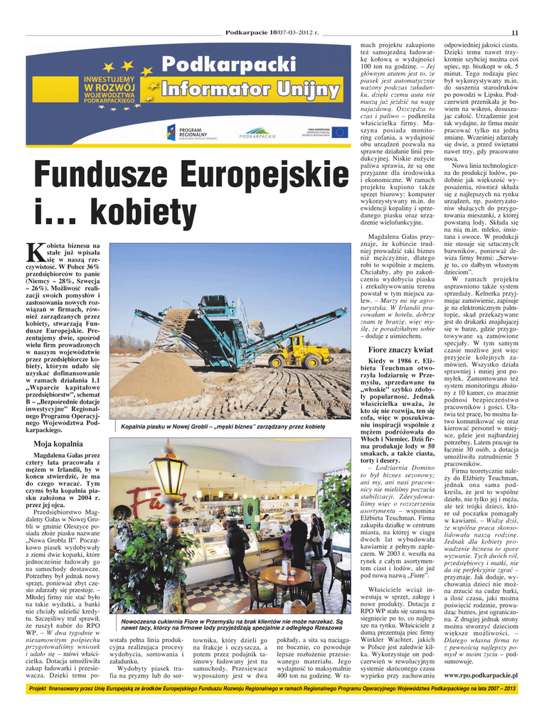 P dk Podkarpacie i 10/ 10/07-03-2012 07 03 2012 r. Fundusze Europejskie i... kobiety Fiore znaczy kwiat Kopalnia piasku w Nowej Grobli – „męski biznes” zarządzany przez kobietę Moja kopalnia Magdalena Gałas przez cztery lata pracowała z mężem w Irlandii, by w końcu stwierdzić, że ma do czego wracać. Tym czymś była kopalnia piasku założona w 2004 r. przez jej ojca. Przedsiębiorstwo Magdaleny Gałas w Nowej Grobli w gminie Oleszyce posiada złoże piasku nazwane „Nowa Grobla II”. Początkowo piasek wydobywały z ziemi dwie koparki, które jednocześnie ładowały go na samochody dostawcze. Potrzebny był jednak nowy sprzęt, ponieważ zbyt często zdarzały się przestoje. – Młodej firmy nie stać było na takie wydatki, a banki nie chciały udzielić kredytu. Szczęśliwy traf sprawił, że ruszył nabór do RPO WP. – W dwa tygodnie w niesamowitym pośpiechu przygotowaliśmy wniosek i udało się – mówi właścicielka. Dotacja umożliwiła zakup ładowarki i przesiewacza. Dzięki temu po- mach projektu zakupiono też samojezdną ładowarkę kołową o wydajności 100 ton na godzinę. – Jej głównym atutem jest to, że piasek jest automatycznie ważony podczas załadunku, dzięki czemu auta nie muszą już jeździć na wagę najazdową. Oszczędza to czas i paliwo – podkreśla właścicielka firmy. Maszyna posiada monitoring cofania, a wydajność obu urządzeń pozwala na sprawne działanie linii produkcyjnej. Niskie zużycie paliwa sprawia, że są one przyjazne dla środowiska i ekonomiczne. W ramach projektu kupiono także sprzęt biurowy: komputer wykorzystywany m.in. do ewidencji kopaliny i sprzedanego piasku oraz urządzenie wielofunkcyjne. Magdalena Gałas przyznaje, że kobiecie trudniej prowadzić taki biznes niż mężczyźnie, dlatego robi to wspólnie z mężem. Chciałaby, aby po zakończeniu wydobycia piasku i zrekultywowaniu terenu powstał w tym miejscu zalew. – Marzy mi się agroturystyka. W Irlandii pracowałam w hotelu, dobrze znam tę branżę, więc myślę, że poradziłabym sobie – dodaje z uśmiechem. K obieta biznesu na stałe już wpisała się w naszą rzeczywistość. W Polsce 36% przedsiębiorców to panie (Niemcy – 28%, Szwecja – 26%). Możliwość realizacji swoich pomysłów i zastosowania nowych rozwiązań w firmach, również zarządzanych przez kobiety, stwarzają Fundusze Europejskie. Prezentujemy dwie, spośród wielu firm prowadzonych w naszym województwie przez przedsiębiorcze kobiety, którym udało się uzyskać dofinansowanie w ramach działania 1.1 „Wsparcie kapitałowe przedsiębiorstw”, schemat B – „Bezpośrednie dotacje inwestycyjne” Regionalnego Programu Operacyjnego Województwa Podkarpackiego. 11 Nowoczesna cukiernia Fiore w Przemyślu na brak klientów nie może narzekać. Są nawet tacy, którzy na firmowe lody przyjeżdżają specjalnie z odległego Rzeszowa wstała pełna linia produkcyjna realizująca procesy wydobycia, sortowania i załadunku. Wydobyty piasek trafia na pryzmy lub do sor- townika, który dzieli go na frakcje i oczyszcza, a potem przez podajnik taśmowy ładowany jest na samochody. Przesiewacz wyposażony jest w dwa pokłady, a sita są naciągane bocznie, co powoduje lepsze rozłożenie przesiewanego materiału. Jego wydajność to maksymalnie 400 ton na godzinę. W ra- Kiedy w 1986 r. Elżbieta Teuchman otworzyła lodziarnię w Przemyślu, sprzedawane tu „włoskie” szybko zdobyły popularność. Jednak właścicielka uważa, że kto się nie rozwija, ten się cofa, więc w poszukiwaniu inspiracji wspólnie z mężem podróżowała do Włoch i Niemiec. Dziś firma produkuje lody w 50 smakach, a także ciasta, torty i desery. – Lodziarnia Domino to był biznes sezonowy; ani my, ani nasi pracownicy nie mieliśmy poczucia stabilizacji. Zdecydowaliśmy więc o rozszerzeniu asortymentu – wspomina Elżbieta Teuchman. Firma zakupiła działkę w centrum miasta, na której w ciągu dwóch lat wybudowała kawiarnię z pełnym zapleczem. W 2003 r. weszła na rynek z całym asortymentem ciast i lodów, ale już pod nową nazwą „Fiore”. Właściciele wciąż inwestują w sprzęt, załogę i nowe produkty. Dotacja z RPO WP stała się szansą na sięgnięcie po to, co najlepsze na rynku. Właściciele z dumą prezentują piec firmy Winkler Wachter, jakich w Polsce jest zaledwie kilka. Wykorzystuje on podczerwień w rewolucyjnym systemie skróconego czasu wypieku przy zachowaniu odpowiedniej jakości ciasta. Dzięki temu nawet trzykrotnie szybciej można coś upiec, np. biszkopt w ok. 5 minut. Tego rodzaju piec był wykorzystywany m.in. do suszenia starodruków po powodzi w Lipsku. Podczerwień przenikała je bowiem na wskroś, dosuszając całość. Urządzenie jest tak wydajne, że firma może pracować tylko na jedną zmianę. Wcześniej zdarzały się dwie, a przed świętami nawet trzy, gdy pracowano nocą. Nowa linia technologiczna do produkcji lodów, podobnie jak większość wyposażenia, również składa się z najlepszych na rynku urządzeń, np. pasteryzatorów służących do przygotowania mieszanki, z której powstaną lody. Składa się na nią m.in. mleko, śmietana i owoce. W produkcji nie stosuje się sztucznych barwników, ponieważ dewiza firmy brzmi: „Serwuję to, co dałbym własnym dzieciom”. W ramach projektu usprawniono także system sprzedaży. Kelnerka przyjmując zamówienie, zapisuje je na elektronicznym palmtopie, skąd przekazywane jest do drukarki znajdującej się w barze, gdzie przygotowywane są zamówione specjały. W tym samym czasie możliwe jest więc przyjęcie kolejnych zamówień. Wszystko działa sprawniej i mniej jest pomyłek. Zamontowano też system monitoringu złożony z 10 kamer, co znacznie podnosi bezpieczeństwo pracowników i gości. Ułatwia też pracę, bo można łatwo komunikować się oraz kierować personel w miejsce, gdzie jest najbardziej potrzebny. Latem pracuje tu łącznie 30 osób, a dotacja 