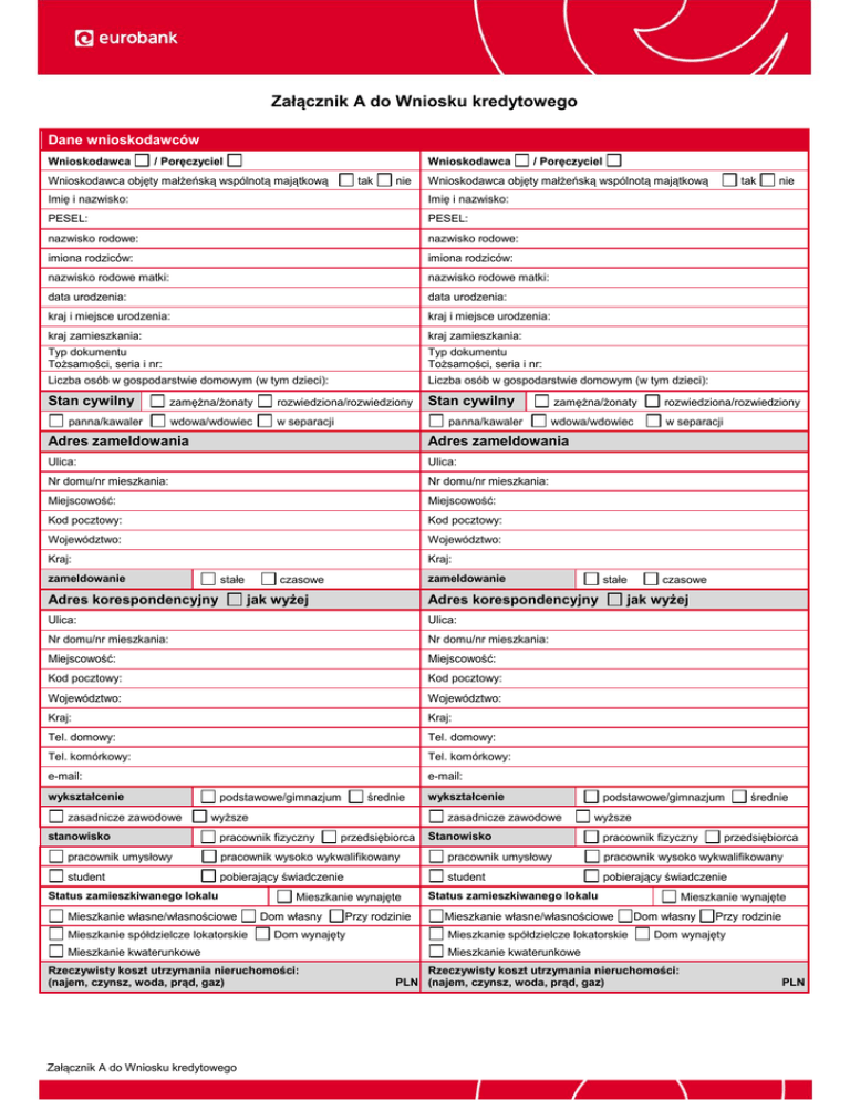 Załącznik A do Wniosku kredytowego Dane wnioskodawców Wnioskodawca / Poręczyciel Wnioskodawca Wnioskodawca objęty małżeńską wspólnotą majątkową tak nie / Poręczyciel Wnioskodawca objęty małżeńską wspólnotą majątkową Imię i nazwisko: Imię i nazwisko: PESEL: PESEL: nazwisko rodowe: nazwisko rodowe: imiona rodziców: imiona rodziców: nazwisko rodowe matki: nazwisko rodowe matki: data urodzenia: data urodzenia: kraj i miejsce urodzenia: kraj i miejsce urodzenia: kraj zamieszkania: kraj zamieszkania: Typ dokumentu Tożsamości, seria i nr: Typ dokumentu Tożsamości, seria i nr: Liczba osób w gospodarstwie domowym (w tym dzieci): Liczba osób w gospodarstwie domowym (w tym dzieci): Stan cywilny panna/kawaler zamężna/żonaty rozwiedziona/rozwiedziony wdowa/wdowiec w separacji rozwiedziona/rozwiedziony wdowa/wdowiec w separacji Adres zameldowania Adres zameldowania Ulica: Ulica: Nr domu/nr mieszkania: Nr domu/nr mieszkania: Miejscowość: Miejscowość: Kod pocztowy: Kod pocztowy: Województwo: Województwo: Kraj: Kraj: stałe zameldowanie jak wyżej Adres korespondencyjny Ulica: Nr domu/nr mieszkania: Nr domu/nr mieszkania: Miejscowość: Miejscowość: Kod pocztowy: Kod pocztowy: Województwo: Województwo: Kraj: Kraj: Tel. domowy: Tel. domowy: Tel. komórkowy: Tel. komórkowy: e-mail: e-mail: zasadnicze zawodowe średnie podstawowe/gimnazjum wyższe stanowisko wykształcenie zasadnicze zawodowe pracownik fizyczny przedsiębiorca czasowe jak wyżej Adres korespondencyjny Ulica: wykształcenie stałe zameldowanie czasowe nie zamężna/żonaty Stan cywilny panna/kawaler tak podstawowe/gimnazjum średnie wyższe Stanowisko pracownik fizyczny przedsiębiorca pracownik umysłowy pracownik wysoko wykwalifikowany pracownik umysłowy pracownik wysoko wykwalifikowany student pobierający świadczenie student pobierający świadczenie Status zamieszkiwanego lokalu Mieszkanie własne/własnościowe Mieszkanie spółdzielcze lokatorskie Mieszkanie wynajęte Dom własny Mieszkanie kwaterunkowe Rzeczywisty koszt utrzymania nieruchomości: (najem, czynsz, woda, prąd, gaz) Załącznik A do Wniosku kredytowego Przy rodzinie Dom wynajęty Mieszkanie wynajęte Status zamieszkiwanego lokalu Mieszkanie własne/własnościowe Mieszkanie spółdzielcze lokatorskie Dom własny Przy rodzinie Dom wynajęty Mieszkanie kwaterunkowe Rzeczywisty koszt utrzymania nieruchomości: PLN (najem, czynsz, woda, prąd, gaz) PLN Źródła dochodów (można zaznaczyć więcej niż jedną odpowiedź oznaczająć cyframi przybliżone pierwszeństwo źródeł ze względu na wielkość uzykiwanego dochodu) umowa o pracę działalność gospodarcza działalność gospodarcza – wolny zawód umowy najmu-dzierżawy Źródła dochodów (można zaznaczyć więcej niż jedną odpowiedź oznaczająć cyframi przybliżone pierwszeństwo źródeł ze względu na wielkość uzykiwanego dochodu) umowa o pracę renta działalność gospodarcza działalność gospodarcza – wolny zawód emerytura umowy cywilno-prawne umowy najmu-dzierżawy działalność rolnicza renta emerytura umowy cywilno-prawne działalność rolnicza Dochody Dochody / Poręczyciel Wnioskodawca / Poręczyciel Wnioskodawca Nazwa zakładu pracy Nazwa zakładu pracy Forma organizacyjna Forma organizacyjna Adres Adres Telefon Telefon Branża Branża Stanowisko Stanowisko / Poręczyciel Wnioskodawca / Poręczyciel Wnioskodawca Nazwa zakładu pracy Nazwa zakładu pracy Forma organizacyjna Forma organizacyjna Adres Adres Telefon Telefon Branża Branża Stanowisko Stanowisko Łączny staż pracy do dnia złożenia wniosku Łączny staż pracy do dnia złożenia wniosku m-cy (dopuszczalna przerwa w zatrudnieniu 31 dni) m-cy (dopuszczalna przerwa w zatrudnieniu 31 dni) Obciążenia (karty kredytowe, limity odnawialne, kredyty, inne), Obciążenia (karty kredytowe, limity odnawialne, kredyty, inne), posiadane w Bankach oraz innych podmiotach, nie będących Bankami a prowadzących działalność w zakresie udzielania kredytów i pożyczek. Nie dotyczy zobowiązań konsolidowanych i refinansowanych. posiadane w Bankach oraz innych podmiotach, nie będących Bankami a prowadzących działalność w zakresie udzielania kredytów i pożyczek. Nie dotyczy zobowiązań konsolidowanych i refinansowanych. Obciążenia Obciążenia kredyt/pożyczka Karta kredytowa limit odnawialy w ROR inne:________________________________ kredyt/pożyczka Karta kredytowa limit odnawialy w ROR inne:_________________________________ Status Wnioskodawcy/Poręczyciela: Kredytobiorca Status Wnioskodawcy/Poręczyciela: Kredytobiorca Status Wnioskodawcy/Poręczyciela: Poręczyciel Status Wnioskodawcy/Poręczyciela: Poręczyciel Wierzyciel (nazwa) Wierzyciel (nazwa) Kwota zobowiązania Kwota zobowiązania Data podpisania umowy Data podpisania umowy Aktualne saldo zadłużenia Aktualne saldo zadłużenia Kwota raty Kwota raty Obciążenia kredyt/pożyczka Karta kredytowa limit odnawialy w ROR inne:________________________________ Obciążenia kredyt/pożyczka Karta kredytowa limit odnawialy w ROR inne:________________________________ Status Wnioskodawcy/Poręczyciela: Kredytobiorca Status Wnioskodawcy/Poręczyciela: Kredytobiorca Status Wnioskodawcy/Poręczyciela: Poręczyciel Status Wnioskodawcy/Poręczyciela: Poręczyciel Wierzyciel (nazwa) Wierzyciel (nazwa) Kwota zobowiązania Kwota zobowiązania Data podpisania umowy Data podpisania umowy Aktualne saldo zadłużenia Aktualne saldo zadłużenia Kwota raty Kwota raty Obciążenia kredyt/pożyczka Karta kredytowa limit odnawialy w ROR inne:________________________________ Status Wnioskodawcy/Poręczyciela: Załącznik A do Wniosku kredytowego Kredytobiorca Obciążenia kredyt/pożyczka Karta kredytowa limit odnawialy w ROR inne:________________________________ Status Wnioskodawcy/Poręczyciela: Kredytobiorca Status Wnioskodawcy/Poręczyciela: Poręczyciel Status Wnioskodawcy/Poręczyciela: Wierzyciel (nazwa) Wierzyciel (nazwa) Kwota zobow