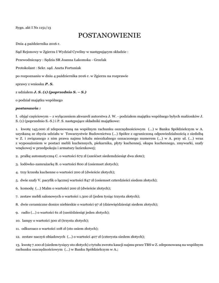 Sygn. akt I Ns 1151/13 POSTANOWIENIE Dnia 4 października 2016 r. Sąd Rejonowy w Zgierzu I Wydział Cywilny w następującym składzie : Przewodniczący : Sędzia SR Joanna Łakomska - Grzelak Protokolant : Sekr. sąd. Aneta Fortuniak po rozpoznaniu w dniu 4 października 2016 r. w Zgierzu na rozprawie sprawy z wniosku P. S. z udziałem J. S. (1) (poprzednio S. – S.) o podział majątku wspólnego postanawia : I. objąć częściowym – z wyłączeniem akwareli autorstwa J. W. - podziałem majątku wspólnego byłych małżonków J. S. (1) (poprzednio S.-S.) i P. S. następujące składniki majątkowe: 1. kwotę 145.000 zł zdeponowaną na wspólnym rachunku oszczędnościowym (...) w Banku Spółdzielczym w A. uzyskaną ze zbycia udziału w Towarzystwie Budownictwa (...) Spółce z ograniczoną odpowiedzialnością z siedzibą w Z. i związanego z nim prawa najmu lokalu mieszkalnego oznaczonego numerem (...) w A. przy ul. (...) wraz z wyposażeniem w postaci mebli kuchennych, piekarnika, płyty kuchennej, okapu kuchennego, zmywarki, szafy wnękowej w przedpokoju i armatury łazienkowej; 2. pralkę automatyczną C. o wartości 672 zł (sześćset siedemdziesiąt dwa złote); 3. lodówko-zamrażarkę B. o wartości 800 zł (osiemset złotych); 4. trzy krzesła kuchenne o wartości 200 zł (dwieście złotych); 5. dwie szafy V. pacyfik o łącznej wartości 847 zł (osiemset czterdzieści siedem złotych); 6. komodę (...) Malm o wartości 200 zł (dwieście złotych); 7. zestaw mebli salonowych o wartości 1.300 zł (jeden tysiąc trzysta złotych); 8. dwie ceramiczne donice niebieskie o wartości 97 zł (dziewięćdziesiąt siedem złotych); 9. radio (...) o wartości 61 zł (sześćdziesiąt jeden złotych); 10. lampy o wartości 300 zł (trzysta złotych); 11. odkurzacz o wartości 108 zł (sto osiem złotych); 12. zestaw naczyń obiadowych (...) o wartości 407 zł (czterysta siedem złotych); 13. kwotę 7.100 zł (siedem tysięcy sto złotych) z tytułu zwrotu kaucji najmu przez TBS w Z. zdeponowaną na wspólnym rachunku oszczędnościowym (...) w Banku Spółdzielczym w A.; II. dokonać podziału majątku wspólnego byłych małżonków J. S. (1) (poprzednio S.-S.) i P. S. w ten sposób, że: 1. przyznać na wyłączność J. S. (1) składniki majątkowe szczegółowo opisane w punktach I.2, I.4, I.5, I.8, I.9, I.11 i I.12 oraz połowę składników opisanych w punkcie I.1 i I.13; 2. przyznać na wyłączność P. S. składniki majątkowe szczegółowo opisane w punktach I.3, I.6, I.7 i I.10 oraz połowę składników opisanych w punkcie I.1 i I.13; 3. zasądzić od P. S. na rzecz J. S. (1) kwotę 208 zł (dwieście osiem złotych) tytułem dopłaty do jej udziału w majątku wspólnym płatną w terminie dwóch tygodni od uprawomocnienia się niniejszego postanowienia z ustawowymi odsetkami za opóźnienie w razie uchybienia terminowi płatności; III. ustalić, że kwota 38.000 zł uiszczona w związku z nabyciem udziału w TBS i prawa najmu lokalu stanowiła w równych częściach nakład z majątków osobistych J. S. (1) i P. S. na ich majątek wspólny; IV. zasądzić od J. S. (1) na rzecz P. S. kwotę 500 zł (pięćset złotych) tytułem zwrotu połowy opłaty sądowej od wniosku; V. ustalić, że w pozostałej części uczestnicy ponoszą we własnym zakresie koszty związane ze swoim udziałem w sprawie; VI. nakazać pobranie od J. S. (1) i P. S. na rzecz Skarbu Państwa – Sądu Rejonowego w Zgierzu kwot po 1.147,28 zł (jeden tysiąc sto czterdzieści siedem złotych 28/100) tytułem nieuiszczonych wydatków sądowych. Sygn. akt I Ns 1151/13 UZASADNIENIE Wnioskiem z 14 sierpnia 2013 r. P. S. wystąpił o podział majątku wspólnego wnioskodawcy i jego byłej żony J. S. (2) (obecnie S.). Wniósł o stwierdzenie, że w skład majątku wspólnego wchodzą: prawo najmu lokalu mieszkalnego położonego w A. na ul. (...) o wartości 240.000 zł, prawo majątkowe w postaci prawa do zwrotu kaucji zabezpieczającej czynsz najmu mieszkania w kwocie 6.400 zł oraz wymienione we wniosku ruchomości. Wnioskodawca wystąpił o przyznanie powyższych składników majątkowych uczestniczce ze spłatą wnioskodawcy oraz o ustalenie, iż poczynił nakłady z majątku osobistego na majątek wspólny w kwocie 38.000 zł oraz zasądzenie na rzecz wnioskodawcy kosztów postępowania. (wniosek – k. 3-8) W odpowiedzi na wniosek J. S. (1) przyłączyła się do wniosku co do zasady. Zakwestionowała zasadność wskazania jako składniki majątku wspólnego prawa do lokalu i części ruchomości wskazanych przez wnioskodawcę oraz ich wartość. Wniosła o przyznanie ruchomości stanowiących majątek wspólny na jej własność ze spłatą wnioskodawcy kwotą 4.465 zł, ustalenie, że kwota 19.000 zł stanowiła nakład z majątku osobistego wnioskodawcy na majątek osobisty uczestniczki w postaci przysługującego jej prawa najmu lokalu mieszkalnego nr (...) położonego w A. na ul. (...), zasądzenie od uczestniczki na rzecz wnioskodawcy spłaty w kwocie 19.000 zł oraz kwoty 3.200 zł tytułem rozliczenia kaucji mieszkaniowej pochodzącej z majątku wspólnego. (odpowiedź na wniosek – k. 125-129) Pismem z dnia 18 marca 2015 r. uczestniczka wskazała, że strony zgodnie ustaliły wartość części ruchomości i sposób ich podziału. Jednocześnie uczestniczka podniosła co jej zdaniem nie podlega podziałowi. (pismo pełnomocnika uczestniczki – k. 353-353v) W toku postępowania doszło do zbycia udziału w Spółce (...) w Z. oraz prawa najmu lokalu z częścią wyposażenia i w pismach z dnia 12 maja 2016 r. oraz z dnia 13 czerwca 2016 r. wnioskodawca i uczestniczka sprecyzowali jakie składniki powinny ich zdaniem podlegać podziałowi oraz częściowo zgodny sposób ich podziału. (pismo wnioskodawcy – k. 423-425, pismo uczestniczki – k. 429-431). Na terminie rozprawy 23 września 2016 r. uczestnicy wnieśli o dokonanie częściowego podziału majątku z wyłączeniem ru