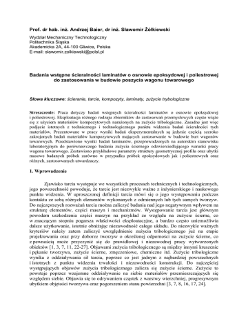 Prof. dr hab. inż. Andrzej Baier, dr inż. Sławomir Żółkiewski Wydział Mechaniczny Technologiczny Politechnika Śląska Akademicka 2A, 44-100 Gliwice, Polska E-mail: [email protected] Badania wstępne ścieralności laminatów o osnowie epoksydowej i poliestrowej do zastosowania w budowie poszycia wagonu towarowego Słowa kluczowe: ścieranie, tarcie, kompozyty, laminaty, zużycie trybologiczne Streszczenie: Praca dotyczy badań wstępnych ścieralności laminatów o osnowie epoksydowej i poliestrowej. Eksploatacja różnego rodzaju zbiorników do zastosowań przemysłowych często wiąże się z użyciem materiałów kompozytowych narażonych na zużycie tribologiczne. Zasadne jest więc podjęcie istotnych z technicznego i technologicznego punktu widzenia badań ścieralności tych materiałów. Prezentowane w pracy wyniki badań eksperymentalnych są jedynie częścią szeroko zakrojonych badań materiałów kompozytowych mających zastosowanie w budowie burt wagonów towarowych. Przedstawiono wyniki badań laminatów, przeprowadzonych na autorskim stanowisku laboratoryjnym do porównawczego badania zużycia ściernego odzwierciedlającego warunki pracy wagonu towarowego. Zestawiono przykładowe parametry struktury geometrycznej profilu oraz ubytki masowe badanych próbek zarówno w przypadku próbek epoksydowych jak i poliestrowych oraz różnych, zastosowanych utwardzaczy. 1. Wprowadzenie Zjawisko tarcia występuje we wszystkich procesach technicznych i technologicznych, jego powszechność powoduje, że tarcie jest niezwykle ważne z inżynierskiego i naukowego punktu widzenia. W uproszczonej definicji tarcia mówi się o jego występowaniu podczas kontaktu ze sobą różnych elementów wykonanych z odmiennych lub tych samych tworzyw. Do najczęstszych rozważań tarcia można zaliczyć badania nad jego negatywnym wpływem na strukturę elementów, części maszyn i mechanizmów. Występowanie tarcia jest głównym powodem uszkodzenia części maszyn na przykład ze względu na zużycie ścierne, co w znaczącym stopniu pogarsza właściwości eksploatacyjne, a bardzo często uniemożliwia dalsze użytkowanie, istotnie obniżając niezawodność całego układu. Do niezwykle ważnych kryteriów należy zatem zaliczyć uwzględnienie zużycia tribologicznego już na etapie projektowania oraz przy doborze tworzyw o określonej odporności na zużycie ścierne, co z pewnością może przyczynić się do prawidłowej i niezawodnej pracy wytworzonych obiektów [1, 3, 7, 11, 22-27]. Objawami zużycia tribologicznego są między innymi kruszenie i pękanie tworzywa, zużycie ścierne, zmęczeniowe, chemiczne itd. Zużycie tribologiczne wynika z oddziaływania sił tarcia, poprzez co jest jednym z najbardziej powszechnych i istotnych z punktu widzenia trwałości i niezawodności konstrukcji. Do najczęściej występujących objawów zużycia tribologicznego zalicza się zużycie ścierne. Zużycie to powstaje poprzez wzajemne oddziaływanie na siebie materiałów przemieszczających się względem siebie. Objawia się to odrywaniem cząstek z warstwy wierzchniej, progresywnym ubytkiem objętości tworzywa oraz pogorszeniem stanu powierzchni [3, 7, 8, 16, 17, 24]. Badania eksperymentalne materiałów kompozytowych wciąż są nieodzowne i są ściśle związane z wyznaczaniem wielu parametrów i właściwości materiałowych. Kompozyty na bazie zbrojenia włóknem są stosowane w rozlicznych układach technicznych. W układach tych zużycie ścierne bardzo często zapoczątkowuje poważne uszkodzenia całego systemu technicznego. Do rozlicznych tego typu przykładów można zaliczyć: przenośniki taśmowe, łopatki, przekładnie, panewki, tuleje, uszczelki, łożyska, pompy ściekowe z różnego rodzaju zawiesinami i płynami zawierającymi ścierniwo, pokrycia zsuwni stosowanych z sprzęcie rolniczym, sprzęt do robót ziemnych, itp. [2, 5, 6, 9, 18, 21, 22]. W pracy [19] autorzy prezentują wyniki badań określających wzrost zużycia ściernego kompozytów na bazie aluminium wraz ze wzrostem obciążenia, wzrostem rozmiaru ścierniwa oraz zmniejszeniem odległości od mechanizmu ścierającego. Autorzy pracy [4] przedstawili wyniki badań eksperymentalnych wieloprzebiegowego ścierania dwóch elementów, badając zużycie ścierne poliestrowego kompozytu zbrojonego włóknem szklanym. Autorzy wykazali, że dominującymi mechanizmami ścierania są: mikroskrawanie, mikropękanie, mikrozmęcznie występujące w formie oraz na końcówkach włókien. Badania przeprowadzono przy różnych parametrach takich jak: różne obciążenia, zadane prędkości obrotowe oraz różne rozmiary cząstek ścierniwa. W ostatnich latach rozwijana jest metodologia projektowania i badania materiałów kompozytowych w aspekcie doboru pożądanych parametrów, które są decydujące w wydajności układu. W pracy [20] podjęto próbę przeanalizowania wpływu kilku wybranych parametrów (wraz z uwzględnieniem ich wzajemnego oddziaływania) na zużycie udarowe materiałów kompozytowych z włókien szklanych w osnowie epoksydowej. Metodę tę wykorzystano również do oceny parametrów związanych z wytrzymałością udarową kompozytów polimerowych [10, 12]. Celem pracy było wstępne zbadanie ścieralności wybranych próbek kompozytowych o osnowie epoksydowej i poliestrowej, poprzez porównanie ubytku masowego próbek oraz zestawienie parametrów profilu geometrycznego przed i po badaniach. Porównano wstępnie właściwości ścierne wybranych laminatów wykonanych z tkanin z włókna szklanego i węglowego, o różnym rodzaju splotu i gramaturze, a także przy zastosowaniu różnych utwardzaczy. 2. Koncepcja stanowiska do badania ścieralności oraz metodyka badań Tworzywa wykorzystywane do budowy poszycia wagonów towarowych powinny charakteryzować się na tyle dużą odpornością, aby przesypujący się po nich ładunek nie spowodował zniszczenia ich powierzchni, co w konsekwencji uniemoż