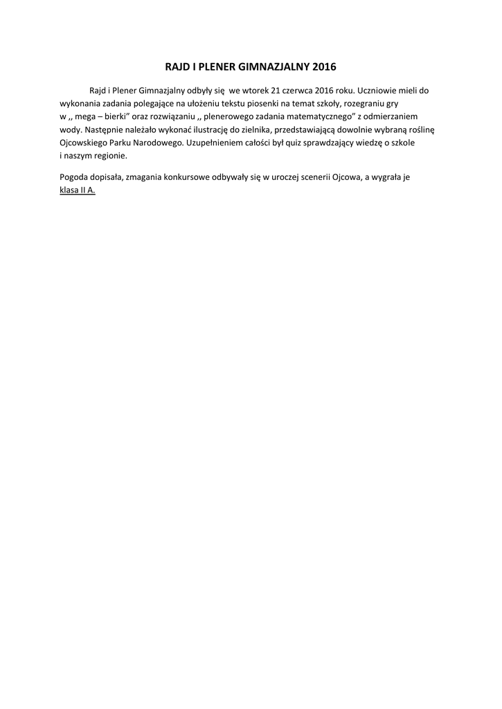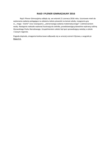 RAJD I PLENER GIMNAZJALNY 2016 Rajd i Plener Gimnazjalny odbyły się we wtorek 21 czerwca 2016 roku. Uczniowie mieli do wykonania zadania polegające na ułożeniu tekstu piosenki na temat szkoły, rozegraniu gry w ,, mega – bierki” oraz rozwiązaniu ,, plenerowego zadania matematycznego” z odmierzaniem wody. Następnie należało wykonać ilustrację do zielnika, przedstawiającą dowolnie wybraną roślinę Ojcowskiego Parku Narodowego. Uzupełnieniem całości był quiz sprawdzający wiedzę o szkole i naszym regionie. Pogoda dopisała, zmagania konkursowe odbywały się w uroczej scenerii Ojcowa, a wygrała je klasa II A.