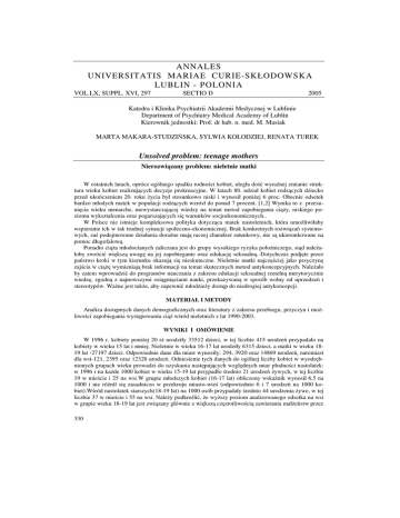 ANNALES UNIVERSITATIS MARIAE CURIE-SKŁODOWSKA LUBLIN - POLONIA VOL.LX, SUPPL. XVI, 297 SECTIO D 2005 Katedra i Klinika Psychiatrii Akademii Medycznej w Lublinie Department of Psychiatry Medical Academy of Lublin Kierownik jednostki: Prof. dr hab. n. med. M. Masiak MARTA MAKARA-STUDZIŃSKA, SYLWIA KOŁODZIEJ, RENATA TUREK Unsolved problem: teenage mothers Nierozwiązany problem: nieletnie matki W ostatnich latach, oprócz ogólnego spadku rodności kobiet, uległa dość wyraźnej zmianie struktura wieku kobiet realizujących decyzje prokreacyjne. W latach 80. udział kobiet rodzących dziecko przed ukończeniem 20. roku życia był stosunkowo niski i wynosił poniżej 6 proc. Obecnie odsetek bardzo młodych matek w populacji rodzących wzrósł do ponad 7 procent. [1,2] Wynika to z przesunięcia wieku menarche, niewystarczającej wiedzy na temat metod zapobiegania ciąży, niskiego poziomu wykształcenia oraz pogarszających się warunków socjoekonomicznych.. W Polsce nie istnieje kompleksowa polityka dotycząca matek nastoletnich, która umożliwiłaby wspieranie ich w tak trudnej sytuacji społeczno-ekonomicznej. Brak konkretnych rozwiązań systemowych, zaś podejmowane działania doraźne mają raczej charakter ratunkowy, nie są ukierunkowane na pomoc długofalową. Ponadto ciąża młodocianych zaliczana jest do grupy wysokiego ryzyka położniczego, stąd należałoby zwrócić większą uwagę na jej zapobieganie oraz edukację seksualną. Dotychczas podjęte przez państwo kroki w tym kierunku okazują się nieskuteczne. Nieletnie matki najczęściej jako przyczynę zajścia w ciążę wymieniają brak informacji na temat skutecznych metod antykoncepcyjnych. Należało by zatem wprowadzić do programów nauczania z zakresu edukacji seksualnej rzetelną merytorycznie wiedzę, zgodną z najnowszymi osiągnięciami nauki, przekazywaną w sposób wolny od uprzedzeń i stereotypów. Ważne jest także, aby zapewnić młodzieży dostęp do niedrogiej antykoncepcji. MATERIAŁ I METODY Analiza dostępnych danych demograficznych oraz literatury z zakresu przebiegu, przyczyn i możliwości zapobiegania występowaniu ciąż wśród nieletnich z lat 1990-2003. WYNIKI I OMÓWIENIE W 1996 r. kobiety poniżej 20 rż urodziły 33512 dzieci, w tej liczbie 415 urodzeń przypadało na kobiety w wieku 15 lat i mniej. Nieletnie w wieku 16-17 lat urodziły 6315 dzieci, a matki w wieku 1819 lat -27197 dzieci. Odpowiednie dane dla miast wynosiły: 294, 3920 oraz 14869 urodzeń, natomiast dla wsi-121, 2395 oraz 12328 urodzeń. Odniesienie tych danych do ogólnej liczby kobiet w wyodrębnionych grupach wieku prowadzi do uzyskania następujących względnych miar płodności nastolatek: w 1996 r na każde 1000 kobiet w wieku 15-19 lat przypadło średnio 21 urodzeń żywych, w tej liczbie 19 w mieście i 25 na wsi.W grupie młodszych kobiet (16-17 lat) obliczony wskaźnik wynosił 6,5 na 1000 i nie różnił się zasadniczo w przekroju miasto-wieś (odpowiednio 6 i 7 urodzeń na 1000 kobiet).Wśród nastolatek starszych(18-19 lat) na 1000 osób przypadały średnio 44 urodzenia żywe, w tej liczbie 37 w mieście i 55 na wsi. Należy podkreślić, że wyższy poziom analizowanego odsetka na wsi w grupie wieku 18-19 lat jest związany głównie z większą częstotliwością zawierania małżeństw przez 330 osoby w wieku poniżej 20 rż: na 100 kobiet w tej grupie wieku w 1996 r. na wsi zawarło małżeństwo średnio 28 kobiet, a w mieście 17 kobiet. [3] W 2001 roku liczba urodzeń żywych przez dziewczynki w wieku do 15 roku życia wynosiła 349, aż 55 urodzeń dotyczy dziewczynek w wieku 14 lat i mniej, w tym wśród 13-latek odnotowano aż 7 urodzeń. Jedno dziecko zostało urodzone przez 12- latkę. Liczba urodzeń żywych w grupie dziewcząt między 15 a 19 rokiem życia w 2001 roku wynosiła 25777.[1,4] Należy tu wspomnieć, że nie ma oficjalnych danych co do liczby nielegalnych aborcji wykonanych u dziewczynek w tych grupach wiekowych, tak więc rzeczywista liczba nastoletnich ciąż jest z pewnością wyższa. W obliczu restrykcyjnej ustawy antyaborcyjnej, rzadko podkreśla się publicznie fakt, iż przedwczesne macierzyństwo może spowodować poważne konsekwencje zdrowotne, istnieje bowiem znaczne ryzyko komplikacji z powodu fizycznego niedorozwoju młodych matek. Należy pamiętać, że szyjka macicy oraz macica w tym wieku jest jeszcze niedojrzała. Prowadzi to do częstszego występowania porodów przedwczesnych, zatrucia ciążowego, anemii, czy zakażenia dróg moczowych. Największym jednak problemem jest częste występowanie wewnątrzmacicznego opóźnienia rozwoju płodu ( u 1/3 rodzących poniżej 16 rż, 1/5 pomiędzy 17 a 18 rż.) .[5,6,7,8] Kolejnym problemem jaki staje przed nastoletnią matką jest odbiór jej stanu przez najbliższe otoczenie .Te rodziny dziewcząt w ciąży, które godzą się z faktem, najczęściej są zmuszone utrzymywać dzieci swoich niepełnoletnich dzieci. Czasem ciężarne uciekają z domu, żeby fakt ciąży nie wyszedł na światło dzienne. Trafiają do ośrodków wychowawczych, domów samotnej matki, nie mają kontaktu z rodziną, są samotne i odizolowane społecznie. Dziewczyna może także zdecydować się na małżeństwo, niejednokrotnie wymuszone. Jednakże, jak pokazują statystyki, „rozpada się 80 % małżeństw zawartych przez nieletnich, którym przydarzyło się dziecko.”[9] Co więcej, niepełnoletnie matki często nie mają możliwości kontynuowania nauki na kolejnych etapach kształcenia, więc ich szanse na rynku pracy znacznie maleją, a co za tym idzie, są jeszcze bardziej zagubione i bezradne. WNIOSKI Problem ciąż wśród nieletnich jest w Polsce ciągle nie rozwiązany. Należałoby opracować strategię działań mających na celu ograniczenie tego niekorzystnego zjawiska, w tym przystępną oświatę i poradnictwo w zakresie zdrowia seksualnego oraz umożliwić młodym ludziom dostęp do taniej i skutecznej antyko