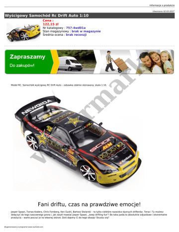 Informacje o produkcie Utworzono 02-03-2017 Wyścigowy Samochód Rc Drift Auto 1:10 Cena : 122,15 zł er m ar k Nr katalogowy : 757-4wd01a Stan magazynowy : brak w magazynie Średnia ocena : brak recenzji w at Model RC. Samochód wyścigowy RC Drift Auto – zabawka zdalnie sterowana, skala 1:10. Fani driftu, czas na prawdziwe emocje! Jasper Spaan, Tomas Kodera, Chris Forsberg, Ken Gushi, Bartosz Stolarski – to tylko niektóre nazwiska słynnych drifterów. Teraz i Ty możesz dołączyć do tego szacownego grona i, jak zwykł mawiać Jasper Spaan, „keep drifting fun”! Bo taka jazda to absolutnie odjazdowe i ekstremalne przeżycia – warto poczuć je na własnej skórze. Dziś dajemy Ci do tego okazję! Skusisz się? Wygenerowano w programie www.oscGold.com Totalny odjazd! er m ar k Zapraszamy Cię za kółko znakomitego samochodu zdalnie sterowanego, który oferuje Ci wszystko, o czym marzysz plus kilka niesamowitych dodatków, których pewnie się nie spodziewasz. Rzut oka na karoserię ● ● w ● karoseria o sportowym, agresywnym wyglądzie wykonana jest z wytrzymałego, elastycznego materiału: metalu i tworzywa, dzięki czemu Twoja super fura sprawdzi się podczas szalonego driftu lub ekstremalnych wyścigów i nie ulegnie uszkodzeniom, spojler – no ba! Wiadomo: jak wyścigówka, to musi być spojler, który idealnie poprawi przyczepność auta do podłoża przy dużych prędkościach, drapieżna kolorystyka – samochód jest dostępny w kolorze czarnym z żółtymi zderzakami i kolorowymi napisami oraz grafikami, dodającymi mu niebanalnego charrrakterku, wymienna karoseria – jeśli tylko znudzi Ci się samochód w tym malowaniu, albo karoseria ulegnie uszkodzeniu, możesz u nas kupić wymienną karoserię. at ● 4 kółka - podwozie, które powali Cię na kolana W opakowaniu znajdziesz dodatkowy zestaw opon: ● do rajdów. Niskoprofilowe, gładkie koła sprawiają, że auto gładko wchodzi w ostre zakręty i świetnie radzi sobie podczas poślizgu. Poczuj adrenalinę, wchodząc w zakręt na poślizgu kontrolowanym! Teraz masz jeszcze więcej możliwości doskonałej zabawy i szybkiej jazdy, której nikt Ci nie zabroni – nikomu włos z głowy nie spadnie, ani nikt nie będzie musiał rwać włosów z głowy, bo jeżdżąc tym samochodem jesteś całkowicie bezpieczny. Pokaż kotku, co masz w środku Kotek? Nie żartuj. Ten samochód to prawdziwy kocur! Taki z pazurkami. Jak to mawiali bohaterowie animowanej popkultury z początku lat 90., Motomyszy z Marsa: GAZ DO DECHY! Gaz jest dwustopniowy - pozwala na ustawienie średniej i maksymalnej prędkości w jeździe do przodu. Osiągi, jakie gwarantuje zastosowanie aż dwóch mocnych silników typu 280S i 380, onieśmielą każdego przeciwnika. Napęd 4WD (4x4) pozwala Informacje o produkcie na osiągnięcie prędkości aż do 20 km/h. Zacznij przygodę z emocjonującą jazdą! Koniecznie zobacz film!!! Samochód doskonały dla amatorów i wymagających wielbicieli driftu. Must have? No jasne! er m ar k Zwrotność i zwinność 1 klasa Wykonany z wyjątkową dbałością o estetykę i prostotę obsługi pilot czterokanałowy, zapewnia szybki i wygodny dostęp do wszystkich parametrów jazdy wraz z ich precyzyjną regulacją. Samochód jest wyjątkowo czuły na zmiany ustawień i odznacza się niesamowitą wręcz zwrotnością podczas jazdy w 4 kierunkach: ● ● przód/tył, skręty lewo/prawo. Sterowanie pozwala na maksymalne odchylenie kół w lewo lub w prawo. Samochód od razu gotowy do zabawy! at Kupując u nas, otrzymujesz świetną zabawkę, zapakowaną w oryginalne opakowanie, które doskonale nadaje się na prezent. Po rozpakowaniu, wystarczy podładować akumulator i umieścić baterie w pilocie, by móc oddać się pełnej frajdy zabawie! Jakość i bezpieczeństwo w Samochód wyścigowy Drift Auto to zabawka RC renomowanego producenta Newqida (NQD). Produkty tej marki cechują się starannością wykonania i dobrą jakością. Łączą w sobie funkcjonalność i ciekawy wygląd, czym przyciągają uwagę dzieci, jak również dorosłych. Poza sporą dozą doskonałej zabawy, samochód pozwoli rozwinąć zdolności manualne i koordynację ruchowo-zmysłową. Samochód wykonano z wysokiej jakości, estetycznych i bezpiecznych materiałów. Model nie posiada żadnych nierówności, widocznych spawów czy ostrych krawędzi – idealnie nadaje się do zabawy dla dzieci (od 6 lat) i dorosłych. Pełne bezpieczeństwo użytkowania gwarantuje certyfikat CE. Wygenerowano w programie www.oscGold.com Zawartość zestawu: Specyfikacja: Skala: 1:10 Waga: 3 kg Wymiary samochodu: Rozstaw osi: Silnik: 45 (dł.) x 19,5 (szer.) x 14 (wys.) cm 5 cm 2 profesjonalne silniki elektryczne, klasa 280S i 380 Moment obrotowy: 234 do 20 km/h 4x4 (4WD) at Przyspieszenie: Napęd: er m ar k • samochód wyścigowy RC Drift Auto NQD 1:10 • niskoprofilowe opony slick do rajdów (4 szt.) • aparatura zdalnego sterowania – pilot • pakiet zasilający 9,6V – akumulator • oryginalne opakowanie 4: przód/ tył, dynamiczne skręty lewo/prawo Tryb regulatora: MODE 1, MODE 2 Sterowanie: radiowe, czterokanałowe; ergonomiczna, pistoletowa aparatura sterująca w Kierunki jazdy: Częstotliwość nadajnika: 27 MHz, 40 MHz Zasięg: ok. 25 m Czas jazdy: ok. 5 - 10 minut Czas ładowania: brak informacji producenta Zasilanie: samochód: akumulator 9.6 V + ładowarka sieciowa; pilot: baterie 2 szt. AA 1.5V Materiał konstrukcyjny: metal, tworzywo, guma, komponenty elektroniczne Minimalny wiek użytkownika: od 3 lat Stan: model od razu gotowy do zabawy