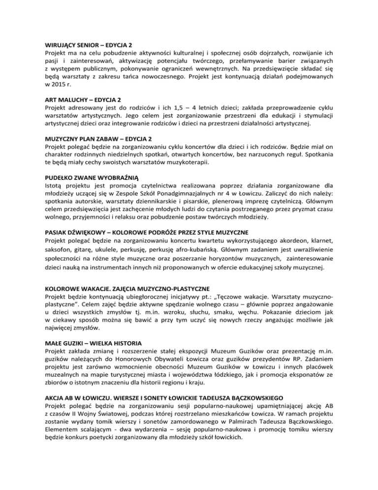 WIRUJĄCY SENIOR – EDYCJA 2 Projekt ma na celu pobudzenie aktywności kulturalnej i społecznej osób dojrzałych, rozwijanie ich pasji i zainteresowań, aktywizację potencjału twórczego, przełamywanie barier związanych z występem publicznym, pokonywanie ograniczeń wewnętrznych. Na przedsięwzięcie składać się będą warsztaty z zakresu tańca nowoczesnego. Projekt jest kontynuacją działań podejmowanych w 2015 r. ART MALUCHY – EDYCJA 2 Projekt adresowany jest do rodziców i ich 1,5 – 4 letnich dzieci; zakłada przeprowadzenie cyklu warsztatów artystycznych. Jego celem jest zorganizowanie przestrzeni dla edukacji i stymulacji artystycznej dzieci oraz integrowanie rodziców i dzieci na przestrzeni działalności artystycznej. MUZYCZNY PLAN ZABAW – EDYCJA 2 Projekt polegać będzie na zorganizowaniu cyklu koncertów dla dzieci i ich rodziców. Będzie miał on charakter rodzinnych niedzielnych spotkań, otwartych koncertów, bez narzuconych reguł. Spotkania te będą miały cechy swoistych warsztatów muzykoterapii. PUDEŁKO ZWANE WYOBRAŹNIĄ Istotą projektu jest promocja czytelnictwa realizowana poprzez działania zorganizowane dla młodzieży uczącej się w Zespole Szkół Ponadgimnazjalnych nr 4 w Łowiczu. Zaliczyć do nich należy: spotkania autorskie, warsztaty dziennikarskie i pisarskie, plenerową imprezę czytelniczą. Głównym celem przedsięwzięcia jest zachęcenie młodych ludzi do czytania postrzeganego przez pryzmat czasu wolnego, przyjemności i relaksu oraz pobudzenie postaw twórczych młodzieży. PASIAK DŹWIĘKOWY – KOLOROWE PODRÓŻE PRZEZ STYLE MUZYCZNE Projekt polegać będzie na zorganizowaniu koncertu kwartetu wykorzystującego akordeon, klarnet, saksofon, gitarę, ukulele, perkusję, perkusję afro-kubańską. Głównym zadaniem jest uwrażliwienie społeczności na różne style muzyczne oraz poszerzanie horyzontów muzycznych, zainteresowanie dzieci nauką na instrumentach innych niż proponowanych w ofercie edukacyjnej szkoły muzycznej. KOLOROWE WAKACJE. ZAJĘCIA MUZYCZNO-PLASTYCZNE Projekt będzie kontynuacją ubiegłorocznej inicjatywy pt.: „Tęczowe wakacje. Warsztaty muzycznoplastyczne”. Celem zajęć będzie aktywne spędzanie wolnego czasu – głównie poprzez angażowanie u dzieci wszystkich zmysłów tj. m.in. wzroku, słuchu, smaku, węchu. Pokazanie dzieciom jak w ciekawy sposób można się bawić a przy tym uczyć się nowych rzeczy angażując możliwie jak najwięcej zmysłów. MAŁE GUZIKI – WIELKA HISTORIA Projekt zakłada zmianę i rozszerzenie stałej ekspozycji Muzeum Guzików oraz prezentację m.in. guzików należących do Honorowych Obywateli Łowicza oraz guzików prezydentów RP. Zadaniem projektu jest zarówno wzmocnienie obecności Muzeum Guzików w Łowiczu i innych placówek muzealnych na mapie turystycznej miasta i województwa łódzkiego, jak i promocja eksponatów ze zbiorów o istotnym znaczeniu dla historii regionu i kraju. AKCJA AB W ŁOWICZU. WIERSZE I SONETY ŁOWICKIE TADEUSZA BĄCZKOWSKIEGO Projekt polegać będzie na zorganizowaniu sesji popularno-naukowej upamiętniającej akcję AB z czasów II Wojny Światowej, podczas której rozstrzelano mieszkańców Łowicza. W ramach projektu zostanie wydany tomik wierszy i sonetów zamordowanego w Palmirach Tadeusza Bączkowskiego. Elementem scalającym - dwa wydarzenia – sesję popularno-naukowa i promocję tomiku wierszy będzie konkurs poetycki zorganizowany dla młodzieży szkół łowickich. WAKACYJNA PRZETWÓRNIA MŁODYCH TALENTÓW Warsztaty muzyczne skierowane mieszkańców Łowicza oraz okolic połączone z dwoma koncertami. Pierwszą i najważniejszą zasadą warsztatów będzie brak granicy wiekowej oraz stopnia zaawansowania w sztuce muzycznej - od zupełnych amatorów, aż po zawodowców pragnących podszkolić swój warsztat. Chętni będą mogli zgłaszać się do trzech prowadzących zajmujących się odmiennymi muzycznymi stylistykami. SIŁA W SEKCJI – KWARTETY ORKIESTRTY MIASTA ŁOWICZA Projekt polegać będzie na zorganizowaniu i przeprowadzeniu dwóch koncertów kwartetowych na klarnet i puzon. Podczas koncertów muzycy będę wykonywać utwory na rożnych odmianach\typach tych instrumentów. Będzie zaprezentowany m.in. puzon basowy oraz klarnet basowy. KOMU PIOSENKĘ – PROFESJONALE WARSZTATY WOKALNE Projekt będzie polegać na przeprowadzeniu profesjonalnych warsztatów. Uczestnicy warsztatów poznają techniki umożliwiające jak najlepsze wykorzystanie własnego ciała, głosu i wyobraźni w celu wydobycia własnego zamysłu artystycznego. Przedsięwzięcie kierowane jest do dzieci od 12 roku życia oraz młodzieży w wieku gimnazjalnym i licealnym. O ANIELI PRZY ANIELI – PORTRET DZIELNICY Celem projektu jest poznanie patronów ulic oraz ukazanie ich związku z historią kraju i Łowicza oraz wzmacnianie poczucia tożsamości lokalnej. W ramach projektu ukaże się broszura informacyjna dotycząca patronów ulic (m. in. Chmielińskiej, Rybackiego, Oczykowskiego), odbędą się spacery przewodnickie ulicami Przedmieścia, plener malarski, wystawa oraz potańcówka międzypokoleniowa. ANIELA CHMIELIŃSKA – PRZYCZYNEK DO BIOGRAFII Projekt dotyczy wydania publikacji w związku z przypadającą w 2016 roku 80. rocznicą śmierci Anieli Chmielińskiej, działaczki społecznej, ludoznawczyni i etnografki nierozerwalnie związanej z Łowiczem. Propagatorki łowickiej sztuki ludowej i działaczki Polskiego Towarzystwa Krajoznawczego. Założycielki Muzeum Ziemi Łowickiej PTK w Łowiczu. Książka liczy około 120 stron, ukazuje postać i działalność Anieli Chmielińskiej w świetle źródeł i materiałów prasowych. ŁOWICZ W STARYM KINIE – projekt będzie sfinansowany ze środków Sieci Kin Studyjnych Ł FESTIVAL 2016 - Projekt zostanie sfinansowany ze środków Łowickiego Ośrodka Kultury przeznaczonych na realizację koncertów. MY NA CHWAŁĘ TWOJĄ GRAMY - KONCERTY MUZYKI LITURGICZNEJ I PRELEKCJE - zapewnim