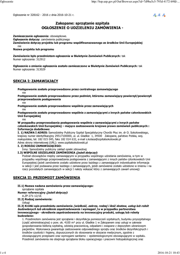 Zakopane: sprzątanie szpitala OGŁOSZENIE O UDZIELENIU