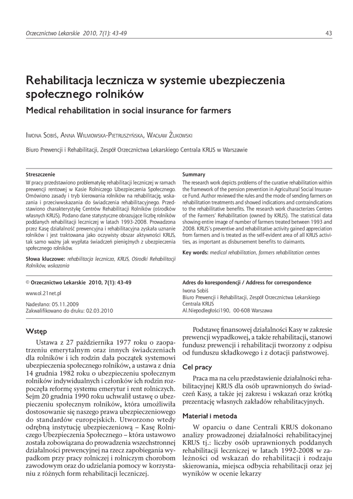 Sobiś I, Wilmowska-Pietruszyńska Orzecznictwo Lekarskie 2010, 7(1): A, Żukowski 43-49 W. Rehabilitacja lecznicza w systemie ubezpieczenia społecznego rolników 43 Rehabilitacja lecznicza w systemie ubezpieczenia społecznego rolników Medical rehabilitation in social insurance for farmers Iwona Sobiś, Anna Wilmowska-Pietruszyńska, Wacław Żukowski Biuro Prewencji i Rehabilitacji, Zespół Orzecznictwa Lekarskiego Centrala KRUS w Warszawie Streszczenie Summary W pracy przedstawiono problematykę rehabilitacji leczniczej w ramach prewencji rentowej w Kasie Rolniczego Ubezpieczenia Społecznego. Omówiono zasady i tryb kierowania rolników na rehabilitację, wskazania i przeciwwskazania do świadczenia rehabilitacyjnego. Przedstawiono charakterystykę Centrów Rehabilitacji Rolników (ośrodków własnych KRUS). Podano dane statystyczne obrazujące liczbę rolników poddanych rehabilitacji leczniczej w latach 1993-2008. Prowadzona przez Kasę działalność prewencyjna i rehabilitacyjna zyskała uznanie rolników i jest traktowana jako oczywisty obszar aktywności KRUS, tak samo ważny jak wypłata świadczeń pieniężnych z ubezpieczenia społecznego rolników. The research work depicts problems of the curative rehabilitation within the framework of the pension prevention in Agricultural Social Insurance Fund. Author reviewed the rules and the mode of sending farmers on rehabilitation treatments and showed indications and contraindications to the rehabilitative benefits. The research work characterizes Centres of the Farmers’ Rehabilitation (owned by KRUS). The statistical data showing entire image of number of farmers treated between 1993 and 2008. KRUS’s preventive and rehabilitative activity gained appreciation from farmers and is treated as the self-evident area of all KRUS activities, as important as disbursement benefits to claimants. Key words: medical rehabilitation, farmers rehabilitation centres Słowa kluczowe: rehabilitacja lecznicza, KRUS, Ośrodki Rehabilitacji Rolników, wskazania © Orzecznictwo Lekarskie 2010, 7(1): 43-49 Adres do korespondencji / Address for correspondence www.ol.21net.pl Iwona Sobiś Biuro Prewencji i Rehabilitacji, Zespół Orzecznictwa Lekarskiego Centrala KRUS Al.Niepodległości190, 00-608 Warszawa Nadesłano: 05.11.2009 Zakwalifikowano do druku: 02.03.2010 Wstęp Ustawa z 27 października 1977 roku o zaopatrzeniu emerytalnym oraz innych świadczeniach dla rolników i ich rodzin dała początek systemowi ubezpieczenia społecznego rolników, a ustawa z dnia 14 grudnia 1982 roku o ubezpieczeniu społecznym rolników indywidualnych i członków ich rodzin rozpoczęła reformę systemu emerytur i rent rolniczych. Sejm 20 grudnia 1990 roku uchwalił ustawę o ubezpieczeniu społecznym rolników, która umożliwiła dostosowanie się naszego prawa ubezpieczeniowego do standardów europejskich. Utworzono wtedy odrębną instytucję ubezpieczeniową – Kasę Rolniczego Ubezpieczenia Społecznego – która ustawowo została zobowiązana do prowadzenia wszechstronnej działalności prewencyjnej na rzecz zapobiegania wypadkom przy pracy rolniczej i rolniczym chorobom zawodowym oraz do udzielania pomocy w korzystaniu z różnych form rehabilitacji leczniczej. Podstawę finansowej działalności Kasy w zakresie prewencji wypadkowej, a także rehabilitacji, stanowi fundusz prewencji i rehabilitacji tworzony z odpisu od funduszu składkowego i z dotacji państwowej. Cel pracy Praca ma na celu przedstawienie działalności rehabilitacyjnej KRUS dla osób uprawnionych do świadczeń Kasy, a także jej zakresu i wskazań oraz krótką prezentację własnych zakładów rehabilitacyjnych. Materiał i metoda W oparciu o dane Centrali KRUS dokonano analizy prowadzonej działalności rehabilitacyjnej KRUS tj.: liczby osób uprawnionych poddanych rehabilitacji leczniczej w latach 1992-2008 w zależności od wskazań do rehabilitacji i rodzaju skierowania, miejsca odbycia rehabilitacji oraz jej wyników w ocenie lekarzy 44 Orzecznictwo Lekarskie 2010, 7(1): 43-49 Wyniki W latach 1992-2008 do OR KRUS wpłynęło prawie 373 tys. wniosków lekarskich ustalających wskazania do skierowania ubezpieczonego (rencisty) lub członków jego rodziny na rehabilitację leczniczą. Zmiany w strukturze wskazań do rehabilitacji leczniczej przedstawia wykres (rys. 2). Każdego roku z rehabilitacji leczniczej organizowanej i finansowanej przez KRUS korzysta ponad 14 tysięcy osób. Od chwili zaś rozpoczęcia działalności rehabilitacyjnej Kasy skorzystało z niej do końca 2008 roku ponad 200 tys. rolników i członków ich rodzin, z czego prawie 176 tys. odbyło rehabilitację w zakładach własnych Kasy, natomiast pozostałe osoby odbyły rehabilitację w zakładach współpracujących Szczegółowe informacje o liczbie leczonych rolników we własnych i współpracujących z Kasą placówkach zawiera wykres (rys. 3). Medycznej oceny rehabilitacji leczniczej dokonują lekarze regionalni inspektorzy oddziałów regionalnych na, podstawie karty informacyjnej otrzymanej z zakładu prowadzącego rehabilitację (rys. 4.) 100 Od 1993 roku Kasa Rolniczego Ubezpieczenia Społecznego w okresie letnich wakacji organizuje także turnusy rehabilitacyjne dla dzieci rolników indywidualnych uprawnionych do świadczeń Kasy. Program rehabilitacji leczniczej w zakresie wad i chorób układu ruchu oraz układu krążenia, a od 1998 roku także chorób układu oddechowego jest łączony z wypoczynkiem dzieci. W latach 1993‑2008 z tej formy leczenia skorzystało prawie 20 tys. dzieci. 16 000 14 000 12 000 10 000 8 000 6 000 4 000 2 000 0 II pol. 1993 1994 1995 1996 1997 1998 1999 2000 2001 2002 2003 2004 2005 2006 2007 2008 1992 Liczba osób w zakładach współpracujących Liczba osób w Centrach i Ośrodkach KRUS Rys. 3. Liczba osób, które odbyły rehabilitację leczniczą KRUS w latach 1992-2008 wg rodzaju ośrodków Źródło: dane Centrali KRUS 90 100 80 70 60 80 % 50 40 60 30 % 20 
