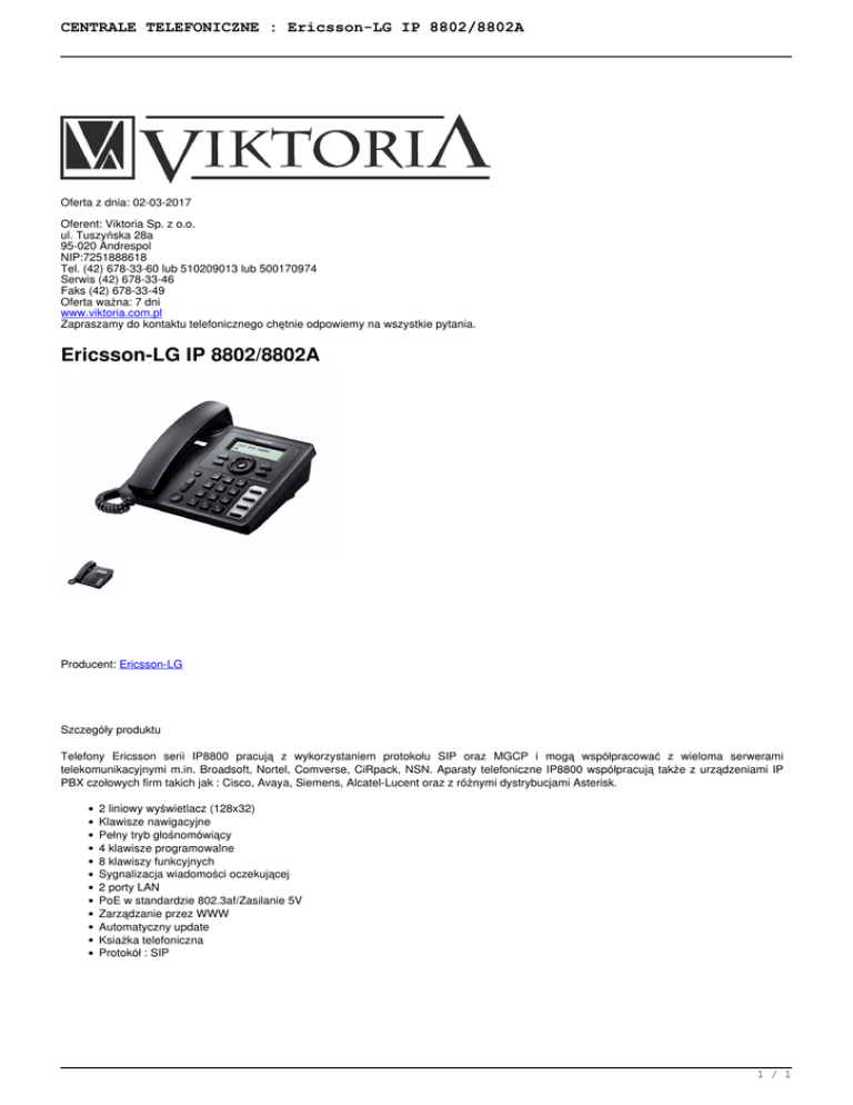 CENTRALE TELEFONICZNE : Ericsson-LG IP 8802/8802A Oferta z dnia: 02-03-2017 Oferent: Viktoria Sp. z o.o. ul. Tuszyńska 28a 95-020 Andrespol NIP:7251888618 Tel. (42) 678-33-60 lub 510209013 lub 500170974 Serwis (42) 678-33-46 Faks (42) 678-33-49 Oferta ważna: 7 dni www.viktoria.com.pl Zapraszamy do kontaktu telefonicznego chętnie odpowiemy na wszystkie pytania. Ericsson-LG IP 8802/8802A Producent: Ericsson-LG Szczegóły produktu Telefony Ericsson serii IP8800 pracują z wykorzystaniem protokołu SIP oraz MGCP i mogą współpracować z wieloma serwerami telekomunikacyjnymi m.in. Broadsoft, Nortel, Comverse, CiRpack, NSN. Aparaty telefoniczne IP8800 współpracują także z urządzeniami IP PBX czołowych firm takich jak : Cisco, Avaya, Siemens, Alcatel-Lucent oraz z różnymi dystrybucjami Asterisk. 2 liniowy wyświetlacz (128x32) Klawisze nawigacyjne Pełny tryb głośnomówiący 4 klawisze programowalne 8 klawiszy funkcyjnych Sygnalizacja wiadomości oczekującej 2 porty LAN PoE w standardzie 802.3af/Zasilanie 5V Zarządzanie przez WWW Automatyczny update Ksiażka telefoniczna Protokół : SIP 1 / 1 Powered by TCPDF (www.tcpdf.org)