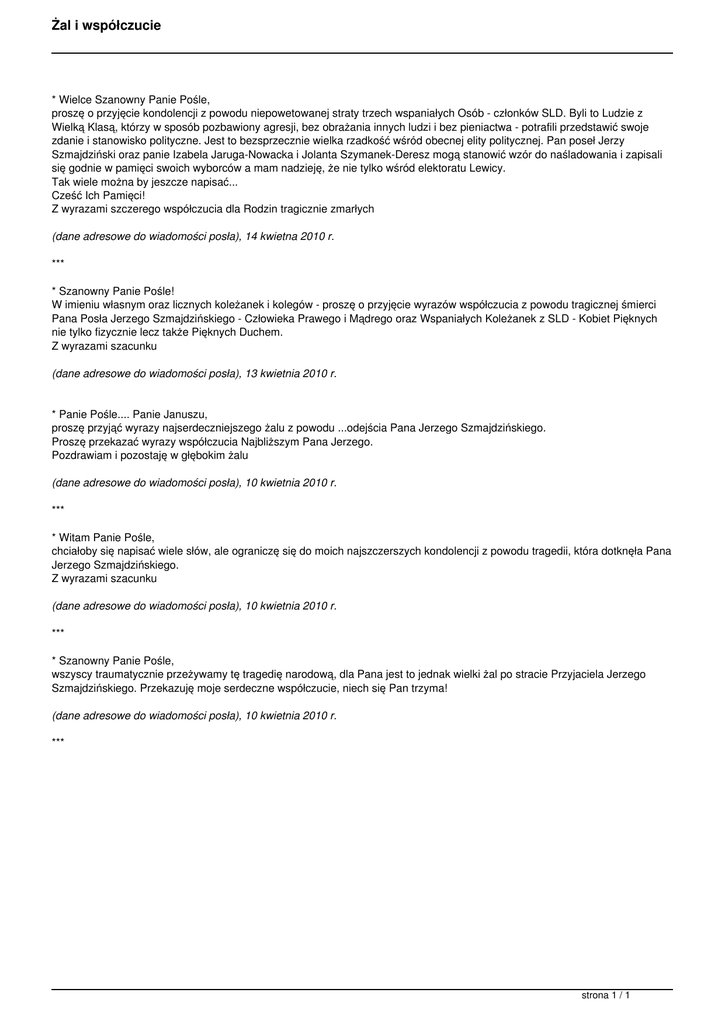 Żal i współczucie * Wielce Szanowny Panie Pośle, proszę o przyjęcie kondolencji z powodu niepowetowanej straty trzech wspaniałych Osób - członków SLD. Byli to Ludzie z Wielką Klasą, którzy w sposób pozbawiony agresji, bez obrażania innych ludzi i bez pieniactwa - potrafili przedstawić swoje zdanie i stanowisko polityczne. Jest to bezsprzecznie wielka rzadkość wśród obecnej elity politycznej. Pan poseł Jerzy Szmajdziński oraz panie Izabela Jaruga-Nowacka i Jolanta Szymanek-Deresz mogą stanowić wzór do naśladowania i zapisali się godnie w pamięci swoich wyborców a mam nadzieję, że nie tylko wśród elektoratu Lewicy. Tak wiele można by jeszcze napisać... Cześć Ich Pamięci! Z wyrazami szczerego współczucia dla Rodzin tragicznie zmarłych (dane adresowe do wiadomości posła), 14 kwietna 2010 r. *** * Szanowny Panie Pośle! W imieniu własnym oraz licznych koleżanek i kolegów - proszę o przyjęcie wyrazów współczucia z powodu tragicznej śmierci Pana Posła Jerzego Szmajdzińskiego - Człowieka Prawego i Mądrego oraz Wspaniałych Koleżanek z SLD - Kobiet Pięknych nie tylko fizycznie lecz także Pięknych Duchem. Z wyrazami szacunku (dane adresowe do wiadomości posła), 13 kwietnia 2010 r. * Panie Pośle.... Panie Januszu, proszę przyjąć wyrazy najserdeczniejszego żalu z powodu ...odejścia Pana Jerzego Szmajdzińskiego. Proszę przekazać wyrazy współczucia Najbliższym Pana Jerzego. Pozdrawiam i pozostaję w głębokim żalu (dane adresowe do wiadomości posła), 10 kwietnia 2010 r. *** * Witam Panie Pośle, chciałoby się napisać wiele słów, ale ograniczę się do moich najszczerszych kondolencji z powodu tragedii, która dotknęła Pana Jerzego Szmajdzińskiego. Z wyrazami szacunku (dane adresowe do wiadomości posła), 10 kwietnia 2010 r. *** * Szanowny Panie Pośle, wszyscy traumatycznie przeżywamy tę tragedię narodową, dla Pana jest to jednak wielki żal po stracie Przyjaciela Jerzego Szmajdzińskiego. Przekazuję moje serdeczne współczucie, niech się Pan trzyma! (dane adresowe do wiadomości posła), 10 kwietnia 2010 r. *** strona 1 / 1