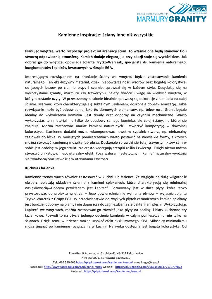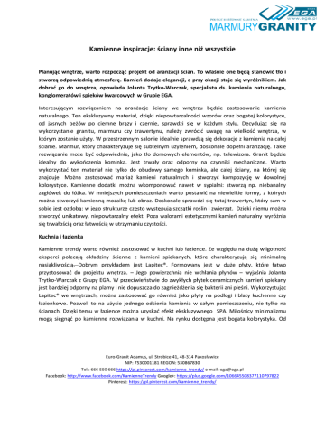 Kamienne inspiracje: ściany inne niż wszystkie Planując wnętrze, warto rozpocząć projekt od aranżacji ścian. To właśnie one będą stanowić tło i stworzą odpowiednią atmosferę. Kamień dodaje elegancji, a przy okazji staje się wyróżnikiem. Jak dobrać go do wnętrza, opowiada Jolanta Trytko-Warczak, specjalista ds. kamienia naturalnego, konglomeratów i spieków kwarcowych w Grupie EGA. Interesującym rozwiązaniem na aranżacje ściany we wnętrzu będzie zastosowanie kamienia naturalnego. Ten ekskluzywny materiał, dzięki niepowtarzalności wzorów oraz bogatej kolorystyce, od jasnych beżów po ciemne brązy i czernie, sprawdzi się w każdym stylu. Decydując się na wykorzystanie granitu, marmuru czy trawertynu, należy zwrócić uwagę na wielkość wnętrza, w którym zostanie użyty. W przestrzennym salonie idealnie sprawdzą się dekoracje z kamienia na całej ścianie. Marmur, który charakteryzuje się subtelnym użyleniem, doskonale dopełni aranżację. Takie rozwiązanie może być odpowiednie, jako tło domowych elementów, np. telewizora. Granit będzie idealny do wykończenia kominka. Jest trwały oraz odporny na czynniki mechaniczne. Warto wykorzystać ten materiał nie tylko do obudowy samego kominka, ale całej ściany, na której się znajduje. Można zastosować mariaż kamieni naturalnych i stworzyć kompozycję w dowolnej kolorystyce. Kamienne dodatki można wkomponować nawet w sypialni: stworzą np. niebanalny zagłówek do łóżka. W mniejszych pomieszczeniach warto postawić na niewielkie formy, z których można stworzyć kamienną mozaikę lub obraz. Doskonale sprawdzi się tutaj trawertyn, który sam w sobie jest ozdobą: w jego strukturze często występują szczątki roślin i zwierząt. Dzięki niemu można stworzyć unikatowy, niepowtarzalny efekt. Poza walorami estetycznymi kamień naturalny wyróżnia się trwałością oraz łatwością w utrzymaniu czystości. Kuchnia i łazienka Kamienne trendy warto również zastosować w kuchni lub łazience. Ze względu na dużą wilgotność eksperci polecają okładziny ścienne z kamieni spiekanych, które charakteryzują się minimalną nasiąkliwością. Dobrym przykładem jest Lapitec®. Formowany jest w duże płyty, które łatwo przystosować do projektu wnętrza. – Jego powierzchnia nie wchłania płynów – wyjaśnia Jolanta Trytko-Warczak z Grupy EGA. W przeciwieństwie do zwykłych płytek ceramicznych kamień spiekany jest bardziej odporny na plamy i nie dopuszcza do zagnieżdżenia się bakterii ani pleśni. Wykorzystując Lapitec® we wnętrzach, można zastosować go również jako płyty na podłogi i blaty kuchenne czy łazienkowe. Pozwoli to na użycie jednego odcienia kamienia w całym pomieszczeniu, nie tylko na ścianach. Dzięki temu w łazience można uzyskać efekt ekskluzywnego SPA. Miłośnicy minimalizmu mogą sięgnąć po kamienne rozwiązania w kuchni. Na rynku dostępna jest bogata kolorystyka. Od Euro-Granit Adamus, ul. Strobice 41, 48-314 Pakosławice NIP: 7530001181 REGON: 530867830 Tel.: 666 550 666 https://pl.pinterest.com/kamienne_trendy/ e-mail: [email protected] Facebook: http://www.facebook.com/KamienneTrendy Google+: https://plus.google.com/106645508377110797822 Pinterest: https://pl.pinterest.com/kamienne_trendy/ odcieni arktycznej bieli, pustynnego piasku po brązy i czernie przypominające barwę mokrej ziemi. Różnorodność struktur wykończenia kamienia spiekanego od jedwabistych po szczotkowane powierzchnie pozwoli na dowolność aranżacji pomieszczenia. Wykorzystując kamienie naturalne lub Lapitec® we wnętrzach, można zaaranżować ściany w niebanalny sposób. W przeciwieństwie do zwykłych rozwiązań takich jak malowanie, tapetowanie czy kafelkowanie materiały te są trwalsze i łatwiejsze w utrzymaniu. Mogą być wykorzystane zarówno jako część dekoracji ściennej, jak i na całej powierzchni. Euro-Granit Adamus, ul. Strobice 41, 48-314 Pakosławice NIP: 7530001181 REGON: 530867830 Tel.: 666 550 666 https://pl.pinterest.com/kamienne_trendy/ e-mail: [email protected] Facebook: http://www.facebook.com/KamienneTrendy Google+: https://plus.google.com/106645508377110797822 Pinterest: https://pl.pinterest.com/kamienne_trendy/