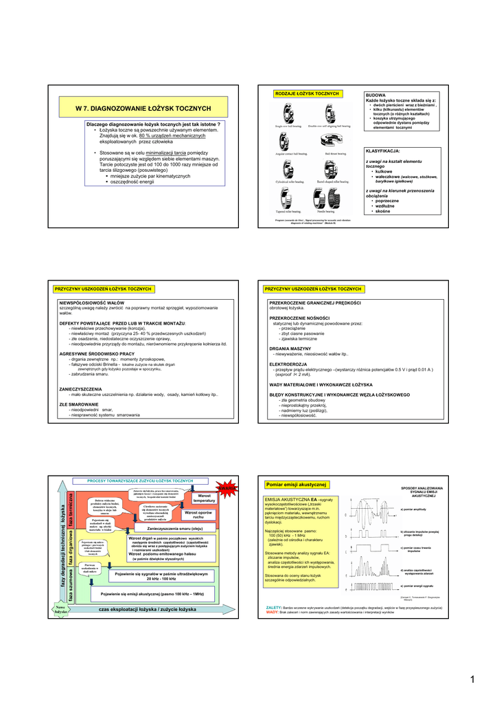RODZAJE ŁOśYSK TOCZNYCH BUDOWA KaŜde łoŜysko toczne składa się z: • dwóch pierścieni wraz z bieŜniami , • kilku (kilkunastu) elementów tocznych (o róŜnych kształtach) • koszyka utrzymującego odpowiednie dystans pomiędzy elementami tocznymi W 7. DIAGNOZOWANIE ŁOśYSK TOCZNYCH Dlaczego diagnozowanie łoŜysk tocznych jest tak istotne ? • ŁoŜyska toczne są powszechnie uŜywanym elementem. Znajdują się w ok. 80 % urządzeń mechanicznych eksploatowanych przez człowieka KLASYFIKACJA: • Stosowane są w celu minimalizacji tarcia pomiędzy poruszającymi się względem siebie elementami maszyn. Tarcie potoczyste jest od 100 do 1000 razy mniejsze od tarcia ślizgowego (posuwistego) mniejsze zuŜycie par kinematycznych oszczędność energii z uwagi na kształt elementu tocznego • kulkowe • wałeczkowe (walcowe, stoŜkowe, baryłkowe igiełkowe) z uwagi na kierunek przenoszenia obciąŜenia • poprzeczne • wzdłuŜne • skośne Program Leonardo da Vinci „ Signal processing for acoustic and vibration diagnosis of rotating machines” (Module B) PRZYCZYNY USZKODZEŃ ŁOśYSK TOCZNYCH PRZYCZYNY USZKODZEŃ ŁOśYSK TOCZNYCH NIEWSPÓŁOSIOWOŚĆ WAŁÓW szczególną uwagę naleŜy zwrócić na poprawny montaŜ sprzęgieł, wypoziomowanie wałów. PRZEKROCZENIE GRANICZNEJ PRĘDKOŚCI obrotowej łoŜyska. DEFEKTY POWSTAJĄCE PRZED LUB W TRAKCIE MONTAśU: - niewłaściwe przechowywanie (korozja), - niewłaściwy montaŜ (przyczyna 25- 40 % przedwczesnych uszkodzeń) - złe osadzenie, niedostateczne oczyszczenie oprawy, - nieodpowiednie przyrządy do montaŜu, nierównomierne przykręcenie kołnierza itd. PRZEKROCZENIE NOŚNOŚCI statycznej lub dynamicznej powodowane przez: - przeciąŜenie - zbyt ciasne pasowanie - zjawiska termiczne DRGANIA MASZYNY - niewywaŜenie, nieosiowość wałów itp.. AGRESYWNE ŚRODOWISKO PRACY - drgania zewnętrzne np.: momenty Ŝyroskopowe, - fałszywe odciski Brinella - lokalne zuŜycie na skutek drgań ELEKTROEROZJA - przepływ prądu elektrycznego –(wystarczy róŜnica potencjałów 0.5 V i prąd 0.01 A ) (exproof I< 2 mA). zewnętrznych gdy łoŜysko pozostaje w spoczynku, - zabrudzenia smaru. WADY MATERIAŁOWE I WYKONAWCZE ŁOśYSKA ZANIECZYSZCZENIA - mało skuteczne uszczelnienia np. działanie wody, osady, kamień kotłowy itp.. BŁĘDY KONSTRUKCYJNE I WYKONAWCZE WĘZŁA ŁOśYSKOWEGO - zła geometria obudowy - nieprostokątny przekrój, - nadmierny luz (poślizgi), - niewspółosiowość. ZŁE SMAROWANIE - nieodpowiedni smar, - niesprawność systemu smarowania fazy degradacji technicznej łoŜyska Nowe łoŜysko faza szumowa faza drganiowa faza termiczna PROCESY TOWARZYSZĄCE ZUśYCIU ŁOśYSK TOCZNYCH Zatarcie się łoŜyska, praca bez smarowania, pęknięcie kosza i rozsypanie się elementów tocznych, bespośredni kontakt bieŜni Dobrze widoczne produkty zuŜycia bieŜni, elementów tocznych, koszyka w oleju lub smarze Pojawienie się uszkodzeń w skali makro np. ubytki materiału w bieŜni Chwilowe zacieranie się elementów tocznych wywołane obecnością zanieczyszczeń produktów zuŜycia AWARIA Wzrost temperatury Wzrost oporów ruchu Zanieczyszczenia smaru (oleju) Wzrost drgań w paśmie początkowo wysokich Pojawienie się mikropittingu i pierwszych uszkodzeń bieŜni i/lub elementów tocznych następnie średnich częstotliwości (częstotliwość obniŜa się wraz z postępującym zuŜyciem łoŜyska i rozmiarami uszkodzeń) Wzrost poziomu emitowanego hałasu (w paśmie dźwięków słyszalnych) Pierwsze uszkodzenia w skali mikro Pojawienie się sygnałów w paśmie ultradźwiękowym 20 kHz - 100 kHz Pomiar emisji akustycznej SPOSOBY ANALIZOWANIA SYGNAŁU EMISJI AKUSTYCZNEJ EMISJA AKUSTYCZNA EA –sygnały wysokoczęstotliwościowe („trzaski materiałowe”) towarzyszące m.in. pęknięciom materiału, wewnętrznemu tarciu międzycząsteczkowemu, ruchom dyslokacji. Najczęściej stosowane pasmo: 100 (50) kHz - 1 MHz (zaleŜnie od ośrodka i charakteru zjawisk). Stosowane metody analizy sygnału EA: zliczanie impulsów, analiza częstotliwości ich występowania, średnia energia zdarzeń impulsowych. Stosowana do oceny stanu łoŜysk szczególnie odpowiedzialnych. a) pomiar amplitudy b) zliczanie impulsów powyŜej progu detekcji c) pomiar czasu trwania impulsów d) analiza częstotliwości występowania zdarzeń e) pomiar energii sygnału Pojawienie się emisji akustycznej (pasmo 100 kHz – 1MHz) [Cempel C, Tomaszewski F. Diagnostyka Maszyn] czas eksploatacji łoŜyska / zuŜycie łoŜyska ZALETY: Bardzo wczesne wykrywanie uszkodzeń (detekcja początku degradacji, wejście w fazę przyspieszonego zuŜycia) WADY: Brak zaleceń i norm zawierających zasady wartościowania i interpretacji wyników 1 Pomiar impulsów udarowych Metoda SPM Pomiary drgań łoŜysk (http://www.spminstrument.se/) Wykorzystuje pomiar impulsów udarowych w paśmie rezonansu przetwornika ok. 32 kHz. Opracowano skale ocen jakości łoŜysk z uwzględnieniem wielkości łoŜyska i prędkości obrotowej. RóŜnica pomiędzy SPM a pomiarem drgań Ocena polega na porównaniu aktualnie zmierzonego poziomu prędkości uderzeń z poziomem łoŜyska bez defektów ZALETY: Szybki Pomiar łatwa obsługa. Wczesne wykrywanie uszkodzeń. Opracowano wartości kryterialne dla oceny poszczególnych łoŜysk WADY: Przetwarzanie sygnału impulsu udarowego Pomiar uzaleŜniony od miejsca pomiaru i sposobu mocowania przetwornika. Inne źródła (np. kawitacja, udary w innych elementach ) mogą zakłócać pomiar. Faza szumowa brak uszkodzeń pierwsze uszkodzenia Faza drganiowa dominujące ubytki masowe, wzrost luzów drgania czopa wału Faza termiczna deformacje elementów i znaczne ubytki masowe; wzrost oporów ruchu; wzrost temperatury i spadek wytrzymałości (umoŜliwia to śledzenie luzów i zuŜycia ciernego łoŜysk) Stosowane pasma pomiarowe: 10 Hz – 15 kHz (dla przyspieszeń), zalecane pasmo powyŜej 3.5 kHz 10 Hz – 1kHz (lepiej 10 kHz) (dla prę