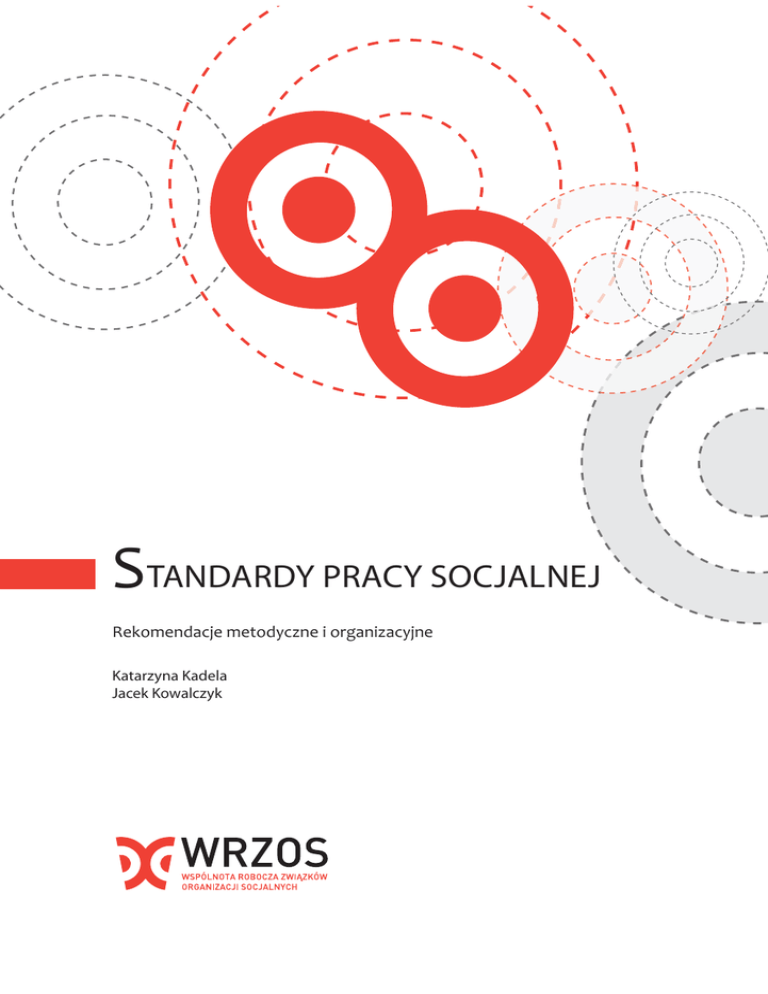 STANDARDY PRACY SOCJALNEJ Rekomendacje metodyczne i organizacyjne Katarzyna Kadela Jacek Kowalczyk STANDARDY PRACY SOCJALNEJ Rekomendacje metodyczne i organizacyjne Katarzyna Kadela Jacek Kowalczyk Warszawa 2014 SPIS TREŚCI WPROWADZENIE .............................................................................................................................................. 4 Projekt „Tworzenie i rozwijanie standardów usług pomocy i integracji społecznej” ................. 4 Struktura i sposób korzystania z publikacji ......................................................................................... 7 Cele i adresaci publikacji ............................................................................................................................ 8 CZĘŚĆ I Praca socjalna z osobą lub rodziną ......................................................................................10 1. Podstawy aksjologiczne pracy socjalnej ........................................................................................10 2. Relacje, zmiana i opór przed zmianą w pracy socjalnej ...........................................................12 3. Metodyczne postępowanie w pracy socjalnej z osobami i rodzinami ...............................19 4. Praca socjalna jako proces - dynamiczny charakter pracy socjalnej ....................................37 5. Działania w pracy socjalnej .................................................................................................................40 6. Działania interwencyjne w pracy socjalnej ...................................................................................42 7. Ramy czasowe postępowania metodycznego w pracy socjalnej .........................................42 8. Miejsce świadczenia pracy socjalnej ...............................................................................................43 9. Dodatkowe wskazówki praktyczne .................................................................................................44 CZĘŚĆ II Praca socjalna w wybranych obszarach problemowych/ z wybranymi grupami osób...................................................................................................................................................50 1. Wskazówki do pracy socjalnej prowadzonej w obszarze problemów opiekuńczo – wychowawczych (rodziny z dziećmi oraz rodzice, których dzieci przebywają w pieczy zastępczej) ..............................................................................................................................51 2. Wskazówki w prowadzeniu pracy socjalnej w obszarze problemu przemocy w rodzinie ..................................................................................................................................................62 3. Wskazówki w prowadzeniu pracy socjalnej w obszarze problemów związanych z pozostawaniem bez pracy ...............................................................................................................81 4. Wskazówki do pracy socjalnej w obszarze problemów niepełnosprawności ..................89 5. Wskazówki dotyczące pracy socjalnej z osobami starszymi ................................................ 109 CZĘŚĆ III Warunki organizacyjne zapewniające odpowiednią jakość pracy socjalnej .......................................................................................................................................................... 123 1. Wstęp – założenia podstawowe ..................................................................................................... 123 2. Kompetencje w pracy socjalnej. .................................................................................................... 124 3. Rekrutacja .............................................................................................................................................. 128 4. Doskonalenie zawodowe w pracy socjalnej .............................................................................. 130 5. Nadzór merytoryczny jako niezbędny element doskonalenia zawodowego ............... 137 6. Rozwiązania organizacyjne w pracy socjalnej .......................................................................... 147 CZĘŚĆ IV Wdrażanie standardu usługi ............................................................................................ 162 1. Wdrożenie standardu usługi jako proces wdrożenia i kierowania zmianą ...............................162 2. Opór wobec zmiany ........................................................................................................................... 163 3. Wdrażanie standardu w praktyce .................................................................................................. 164 DODATEK NR 1. Narzędzia pracy socjalnej. Techniki wykorzystywane w badaniu sytuacji osoby lub rodziny ............................................................................................ 169 1. Narzędzia wykorzystywane w metodycznym postępowaniu w pracy socjalnej i ich funkcje. Zakres dokumentowanych informacji ............................................................... 169 2. Techniki wykorzystywane w badaniu sytuacji osoby lub rodziny – praktyczne wskazówki dla pracownika socjalnego........................................................................................ 176 3. Narzędzia pracy socjalnej ................................................................................................................. 179 4. Wzory narzędzi pracy socjalnej ...................................................................................................... 184 DODATEK NR 2. Grupowe formy oddziaływania w pracy z osobą lub rodziną ............. 280 1. Przykładowe rodzaje grup ............................................................................................................... 280 2. Zasady realizacji pracy w grupie ................